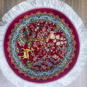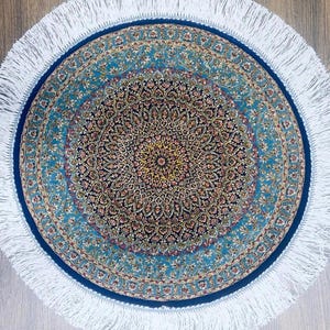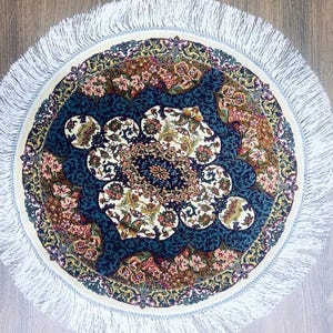 * Material: Silk * Type: Handmade oriental rug * Shape: Round * Pattern: Medallion & Floral * Color: Red / Gold / Blue / Multicolor * Size: 50 x 50 cm (1.64 x 1.64 ft) * Condition: Excellent