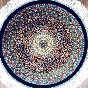 * Material: Silk * Type: Handmade oriental rug * Shape: Round * Pattern: Floral garden / Medallion * Color: Ivory / Blue / Multicolor * Size: 50 x 50 cm (1.64 x 1.64 ft) * Condition: Excellent