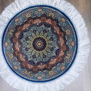 * Material: Silk * Type: Handmade oriental rug * Shape: Round * Pattern: Mandala / Medallion design * Color: Blue / Gold / Multicolor * Size: 50 x 50 cm (1.64 x 1.64 ft) * Condition: Excellent