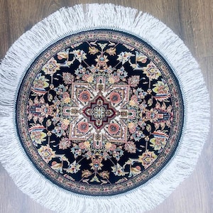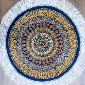 * Material: Silk * Type: Handmade rug * Shape: Round * Pattern: Peacock & Floral Design * Color: Blue / Multicolor * Size: 50 x 50 cm (1.64 x 1.64 ft) * Condition: Excellent
