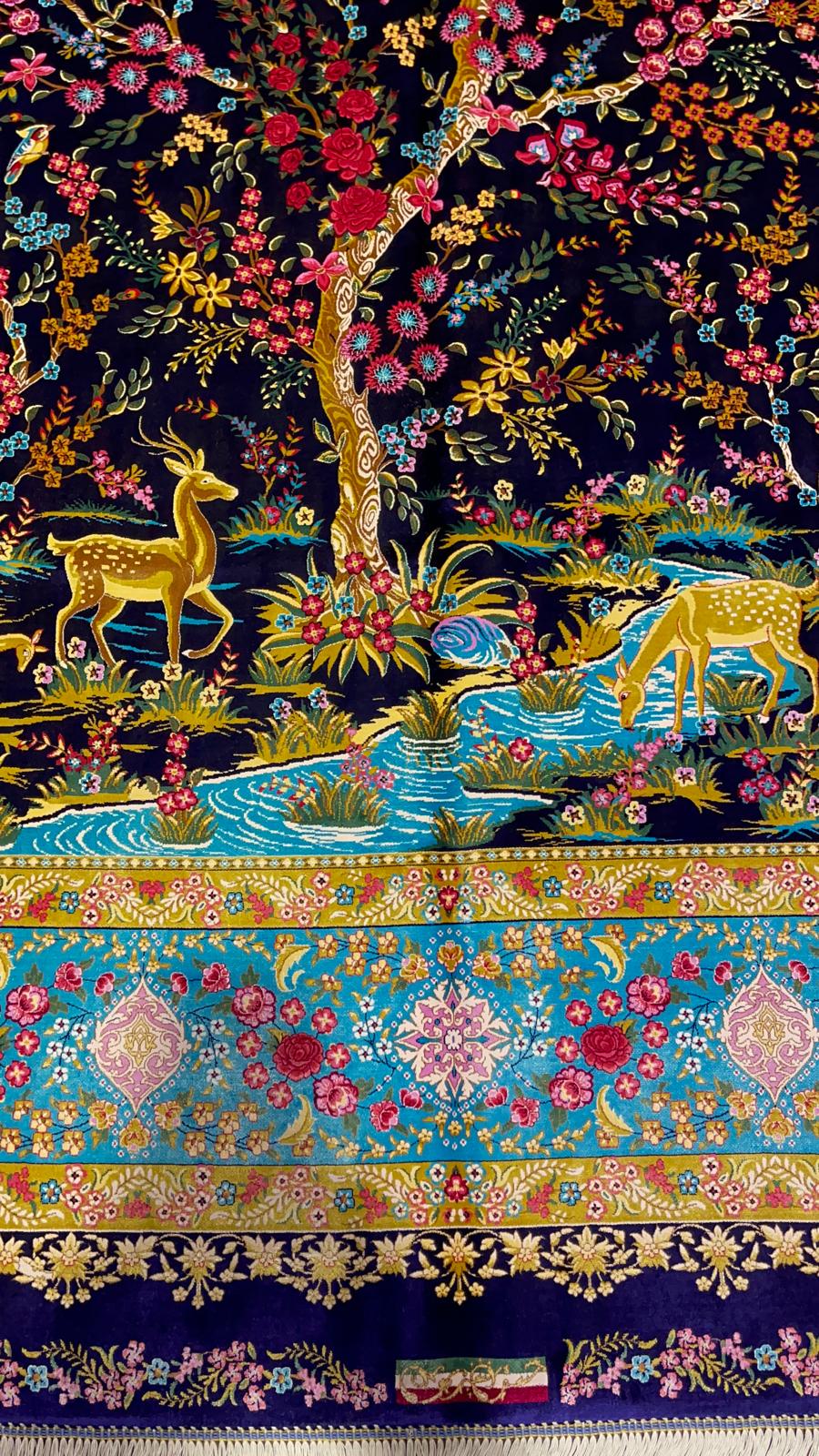 Set on a deep black background, the rug showcases a beautifully detailed tree surrounded by colorful flowers, birds, and deer. The vibrant colors stand out against the dark base, creating a striking and artistic composition.