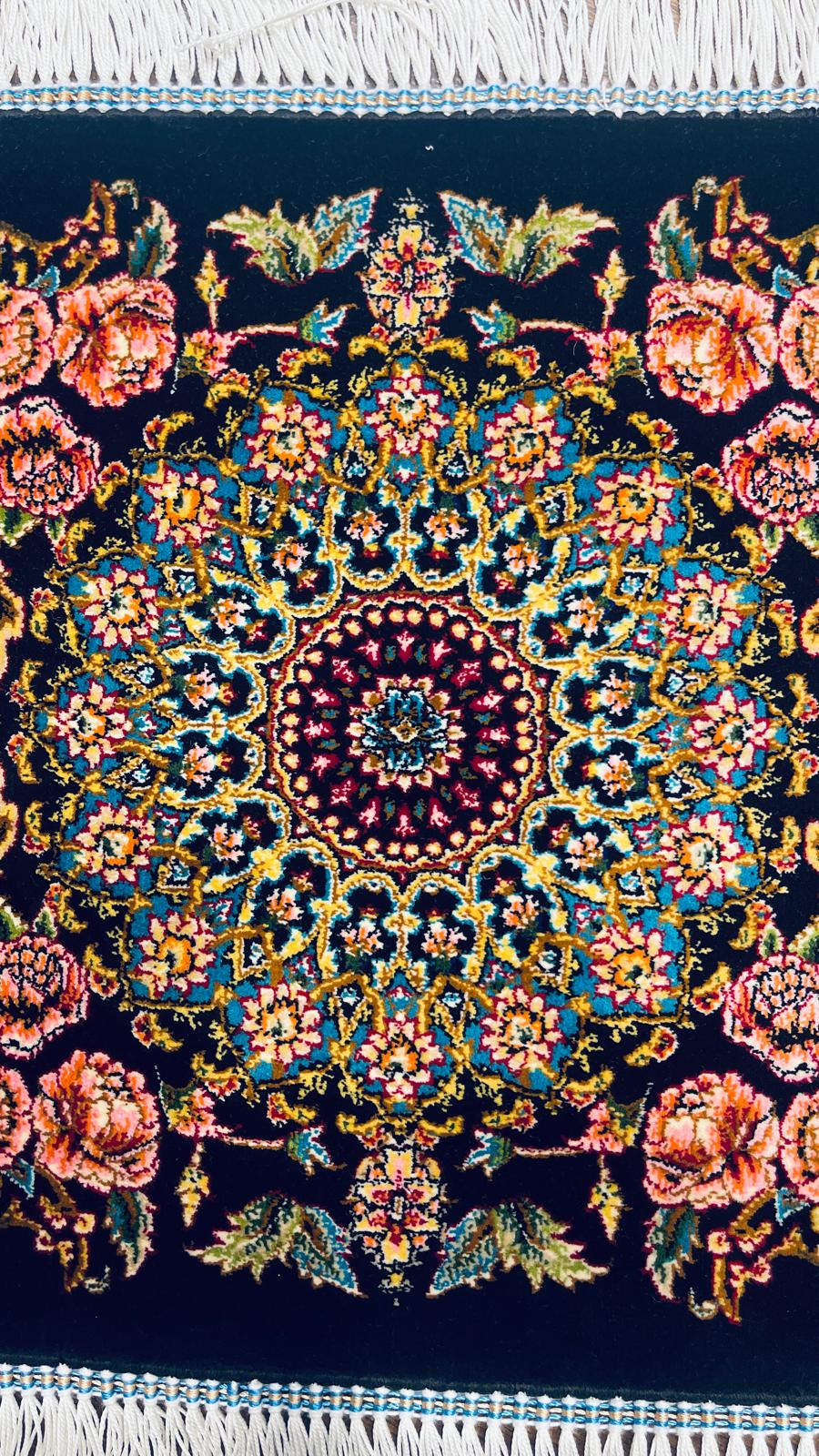 Turkish Silk Rug 30x30 cm (0.98 ft) Floral Medallion Black Handmade Mini Rug