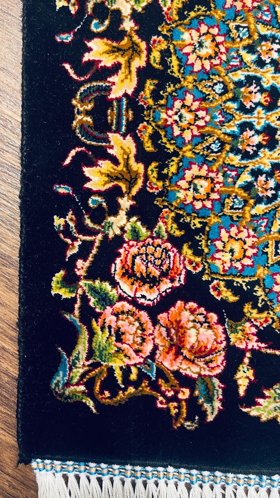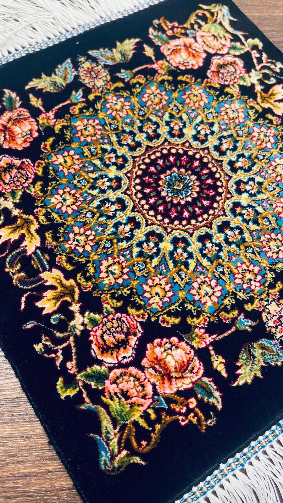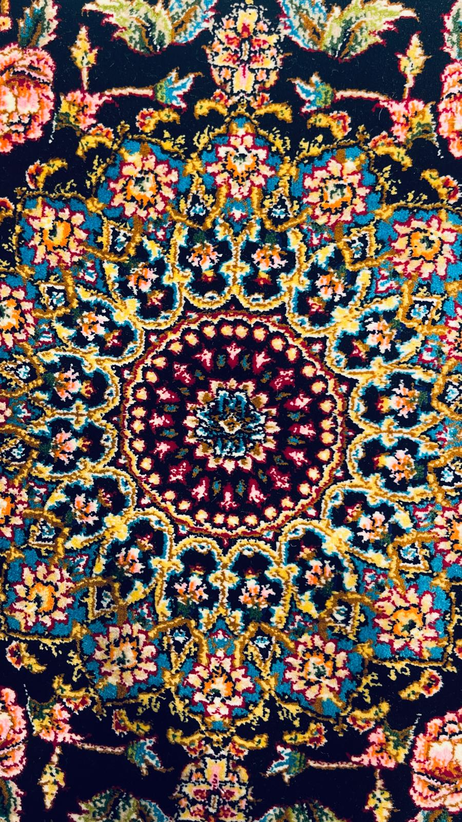 This elegant Turkish silk rug features a detailed floral medallion design with vibrant colors on a deep black background.
