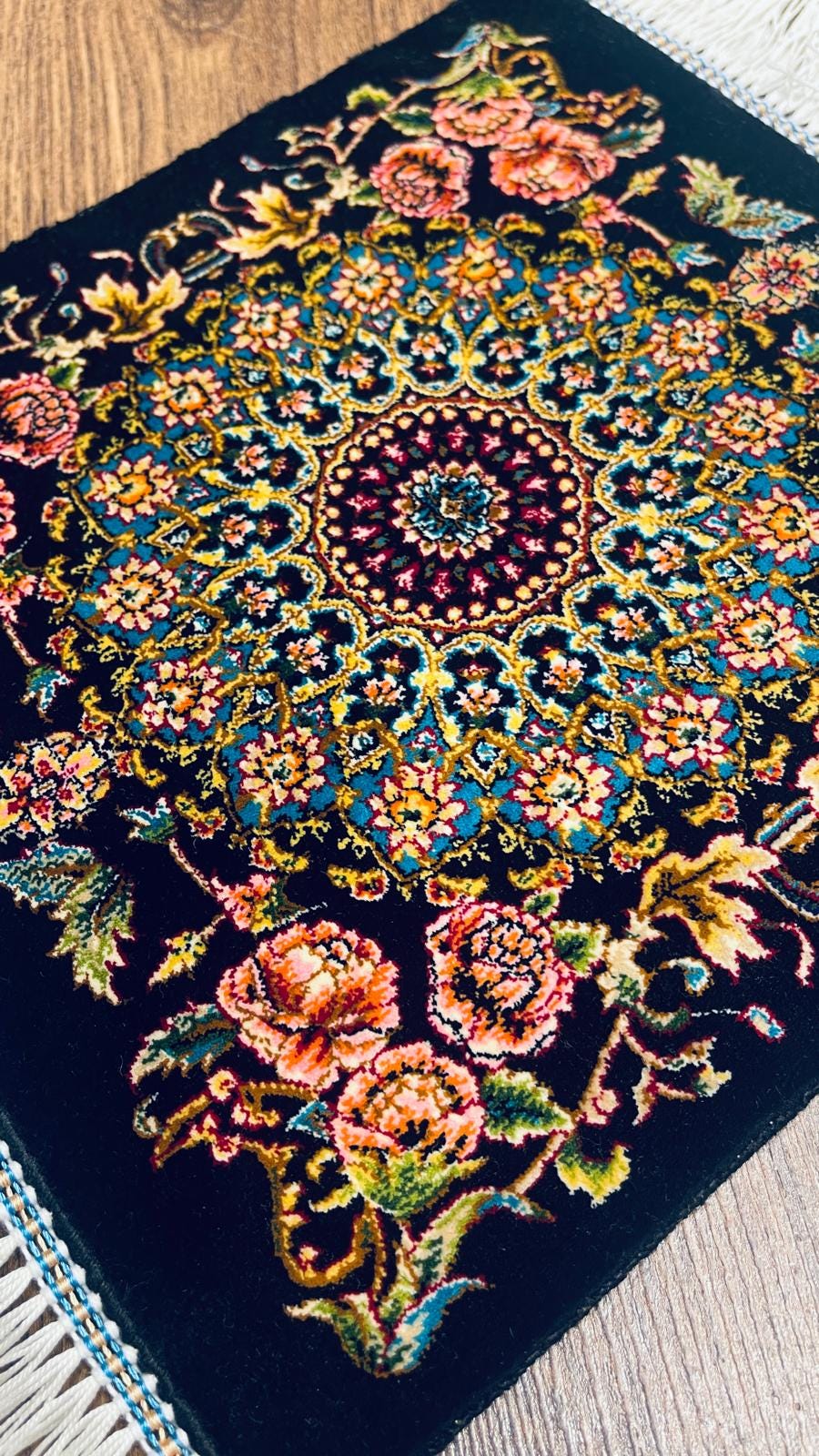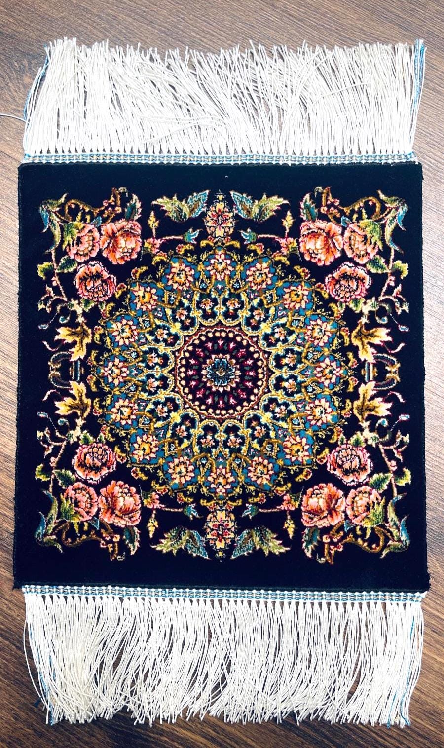 Perfect for wall decor, collectors, or decorative accents, this handmade mini rug adds depth and elegance to any space.