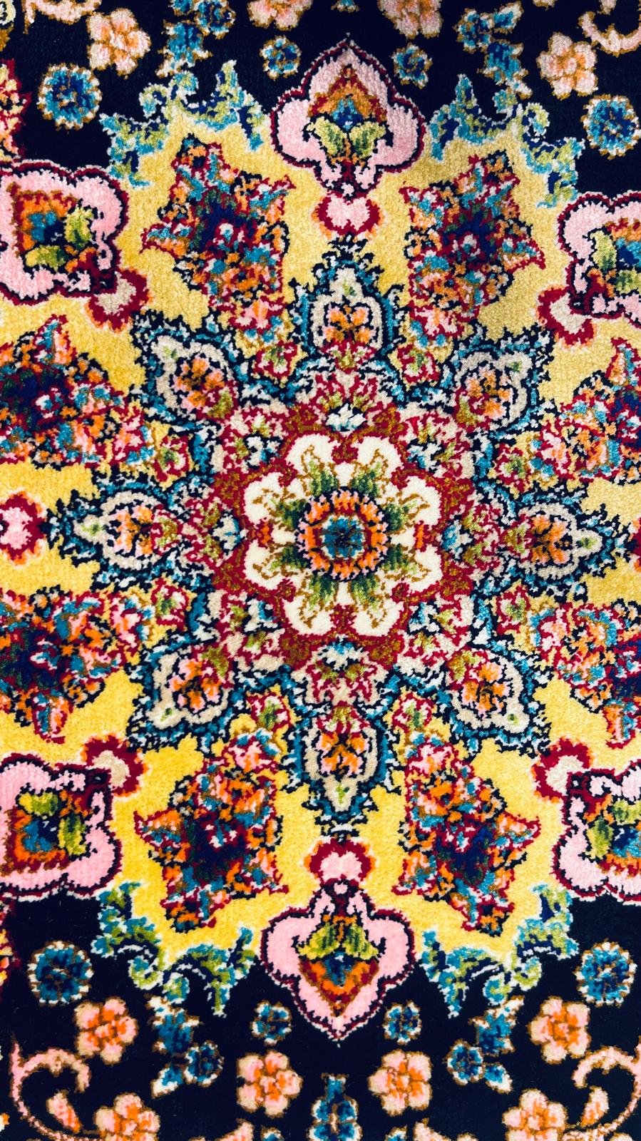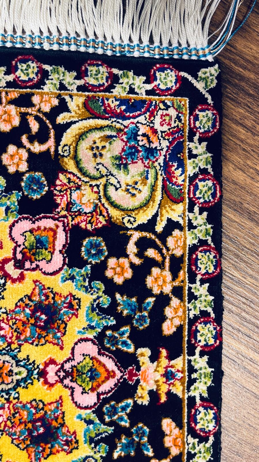 This beautiful Turkish silk rug features a vibrant floral medallion design with rich colors and intricate detailing.