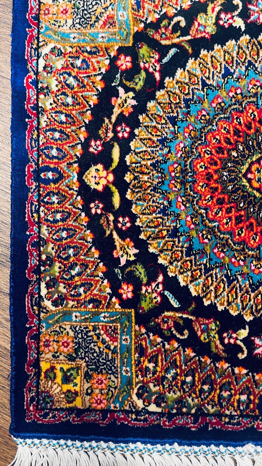 This beautiful Turkish silk rug features a vibrant central medallion design with rich colors and intricate patterns.