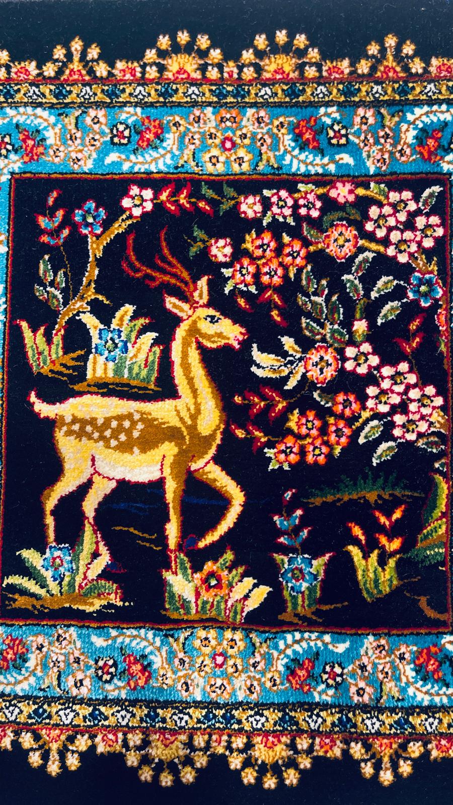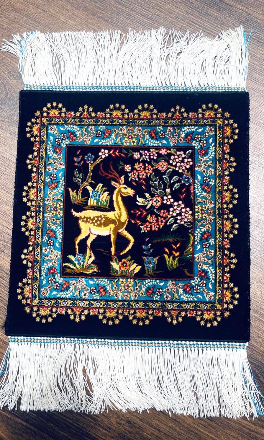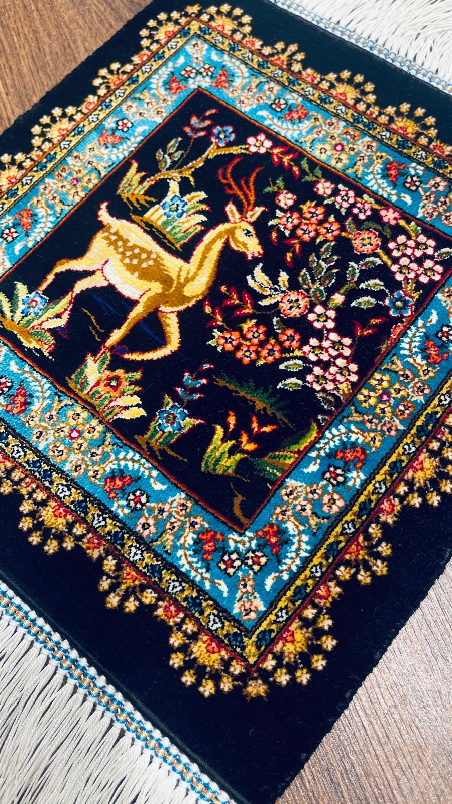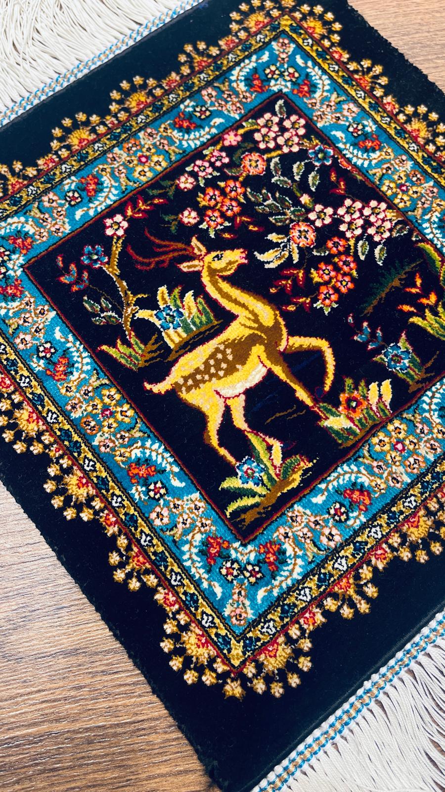 Turkish Silk Rug 30x30 cm (0.98 ft) Deer Floral Design Handmade Mini Rug