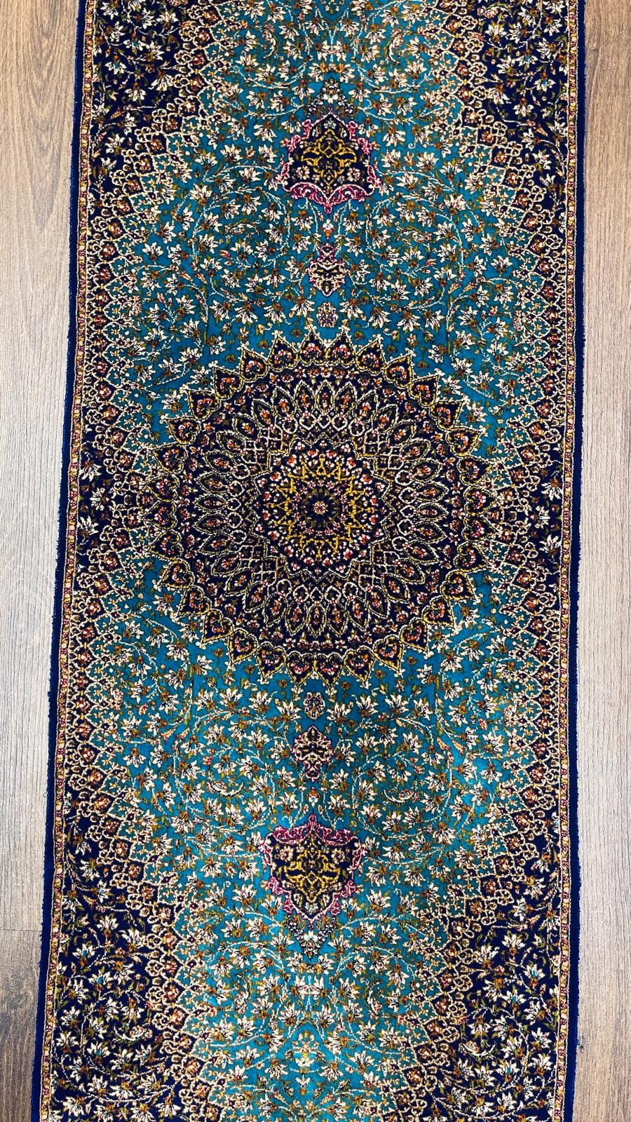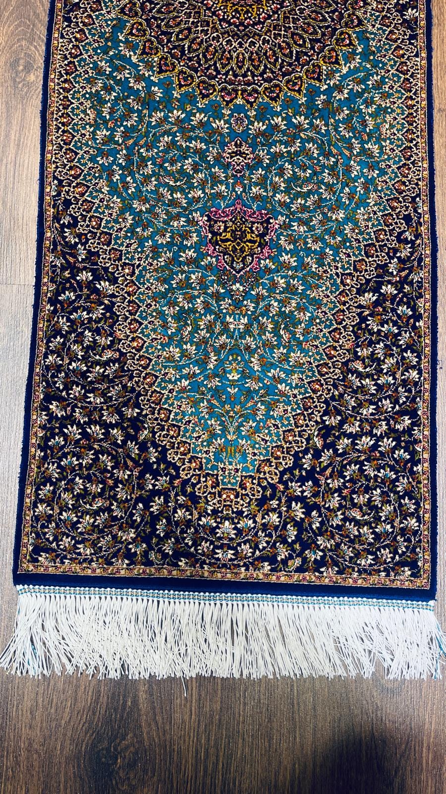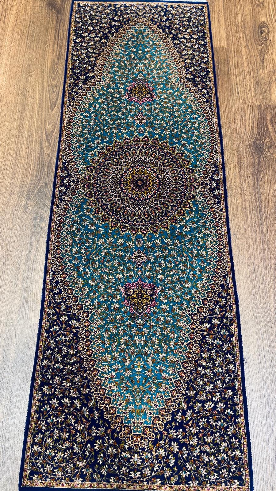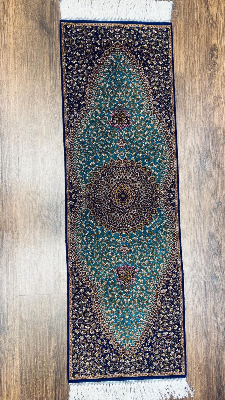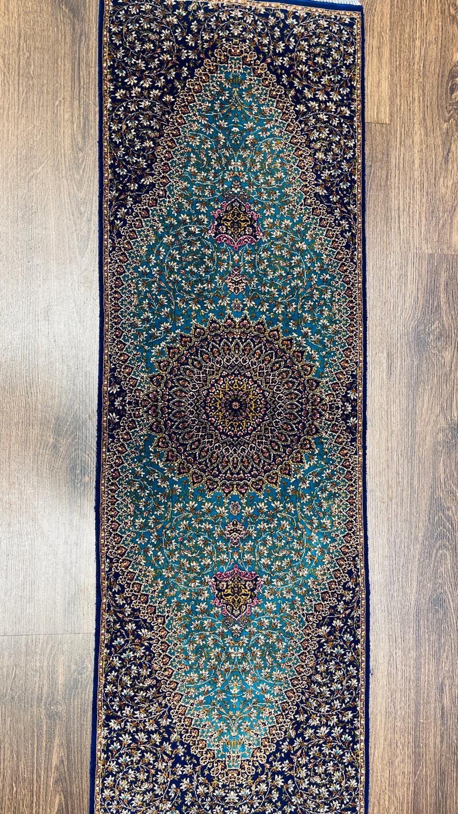 1.31x3.94 ft Handmade Turkish Silk Runner Rug – Turquoise & Navy Floral Medallion Luxury Carpet