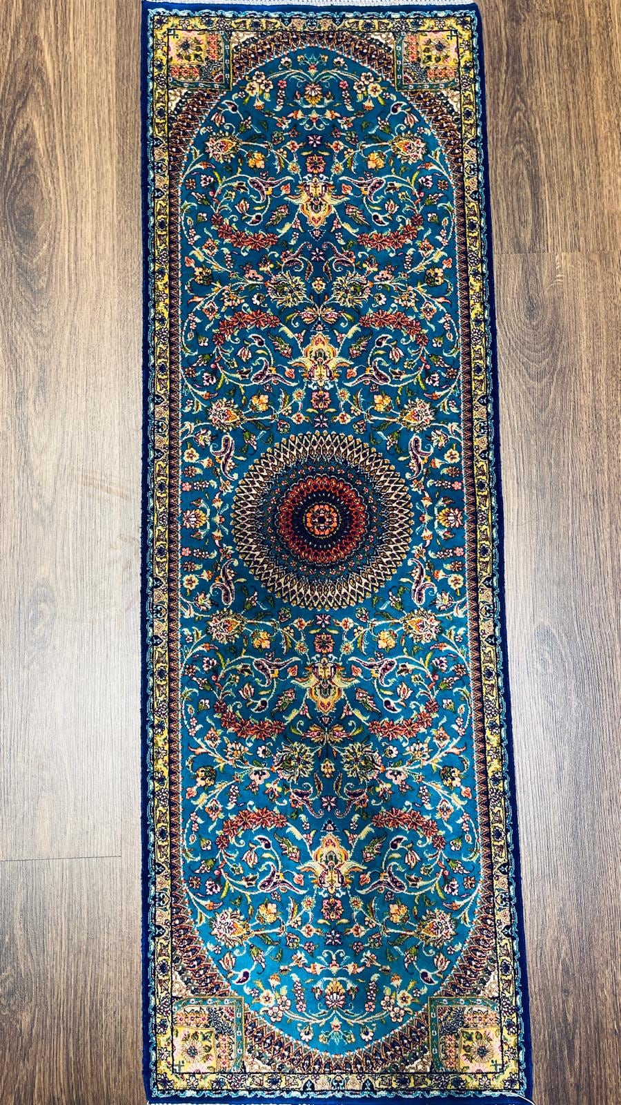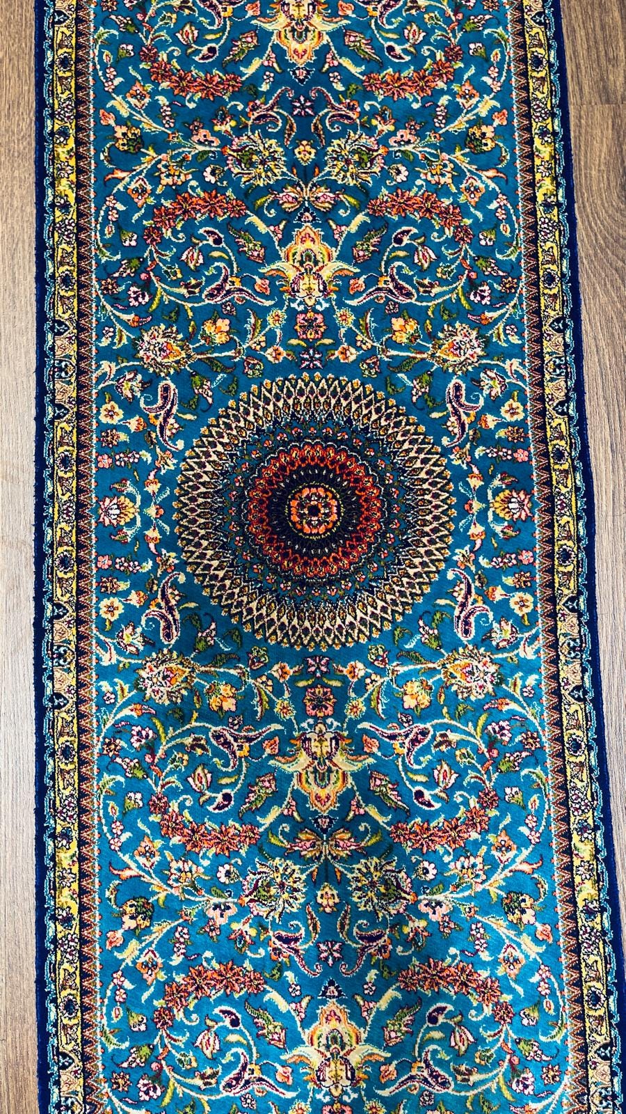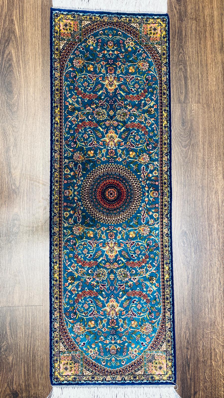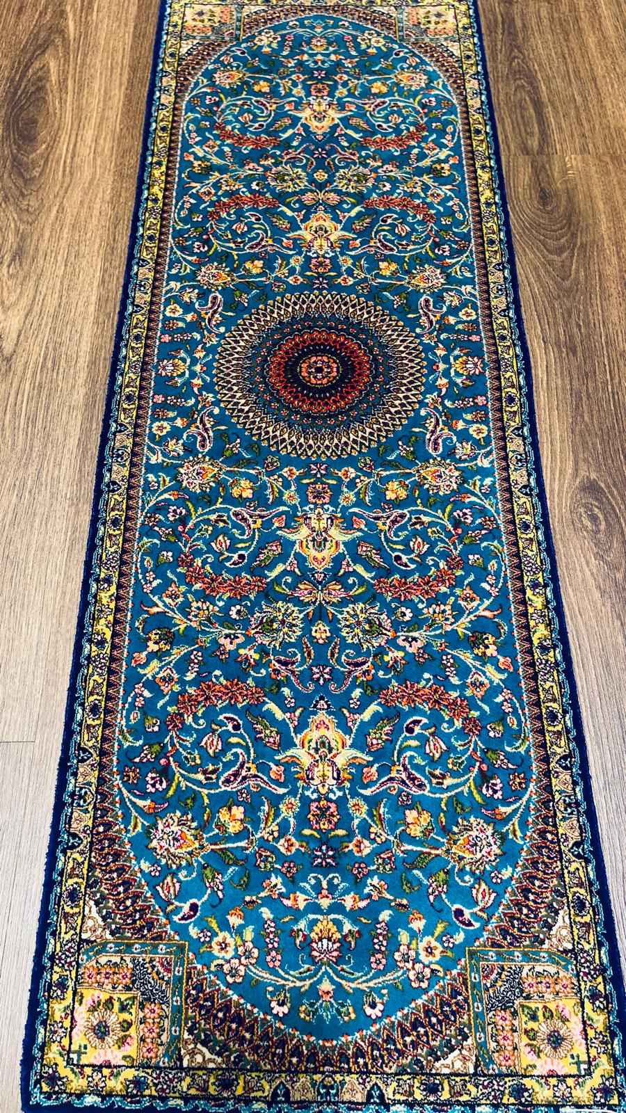Add elegance and color to your space with this stunning handmade Turkish silk runner rug, featuring a detailed floral medallion design on a vibrant turquoise background.