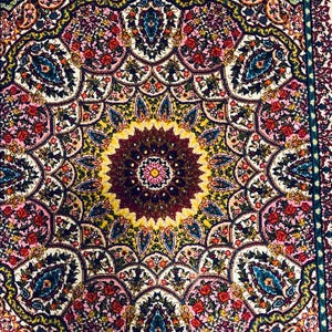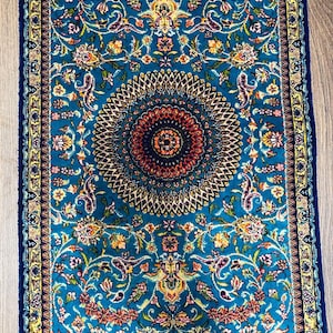 The deep navy base enhances the vibrant colors, making every detail stand out beautifully. Crafted from fine silk, the rug offers a soft touch and a natural sheen that changes with light.