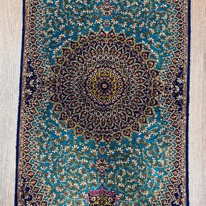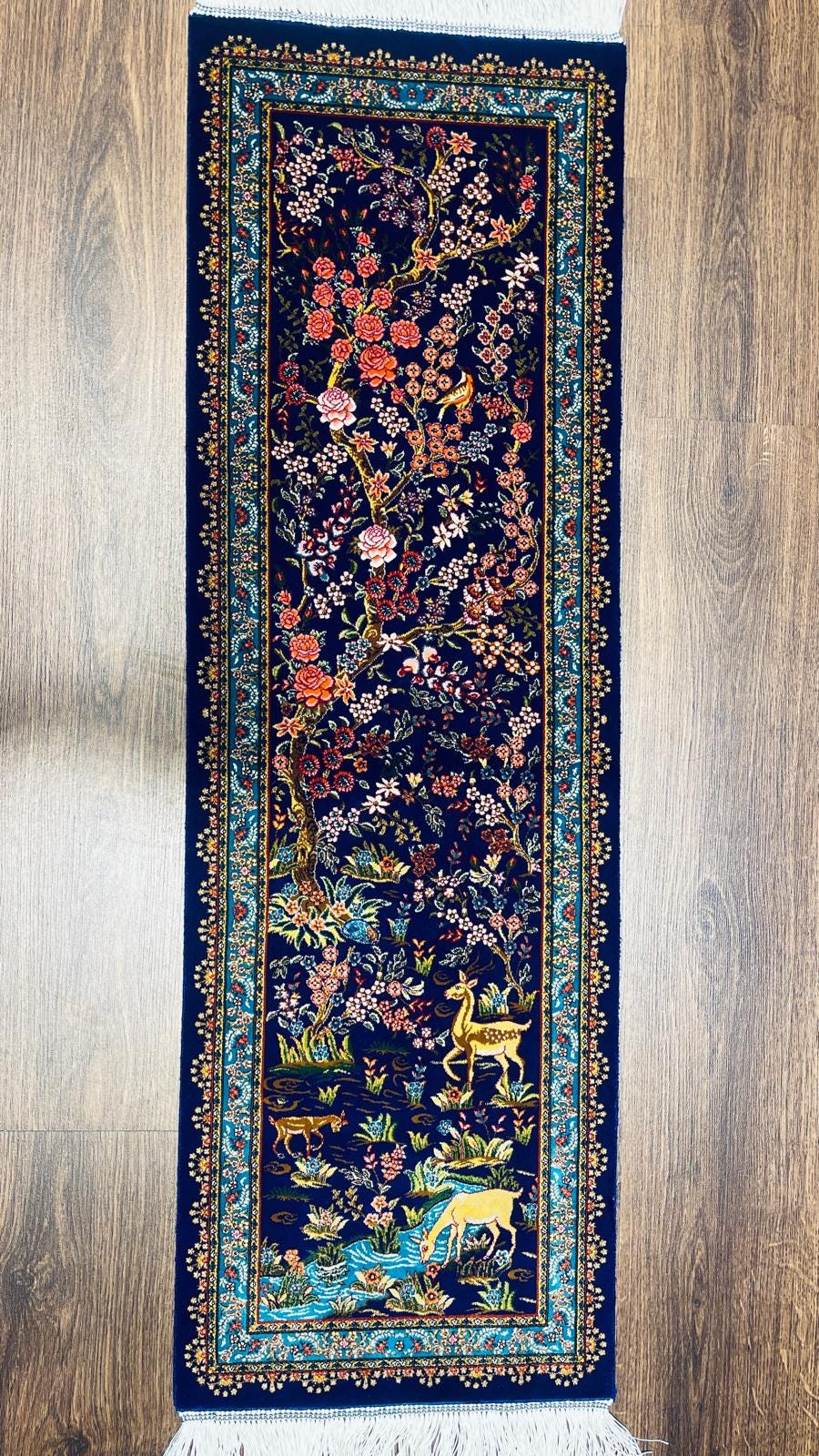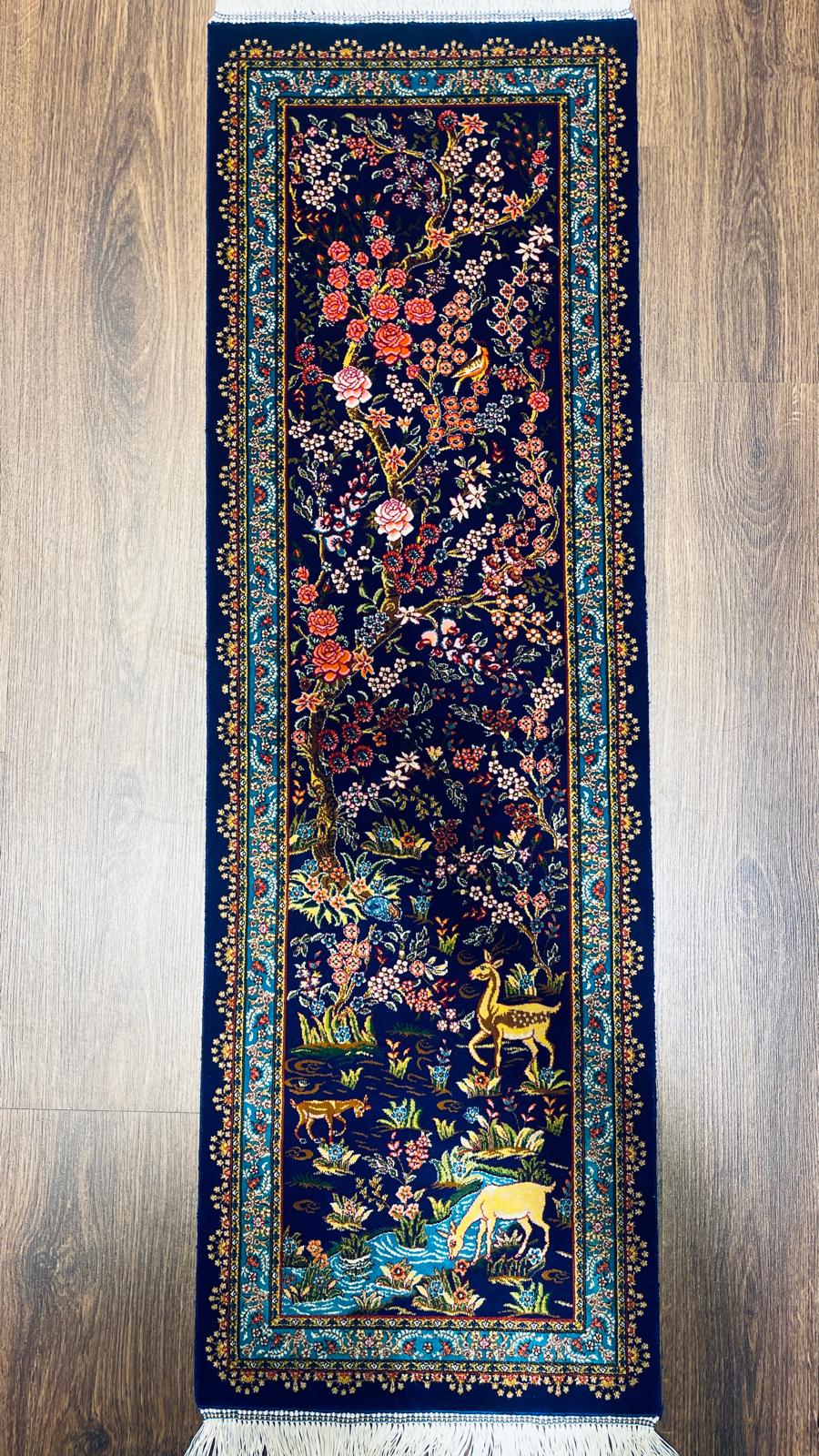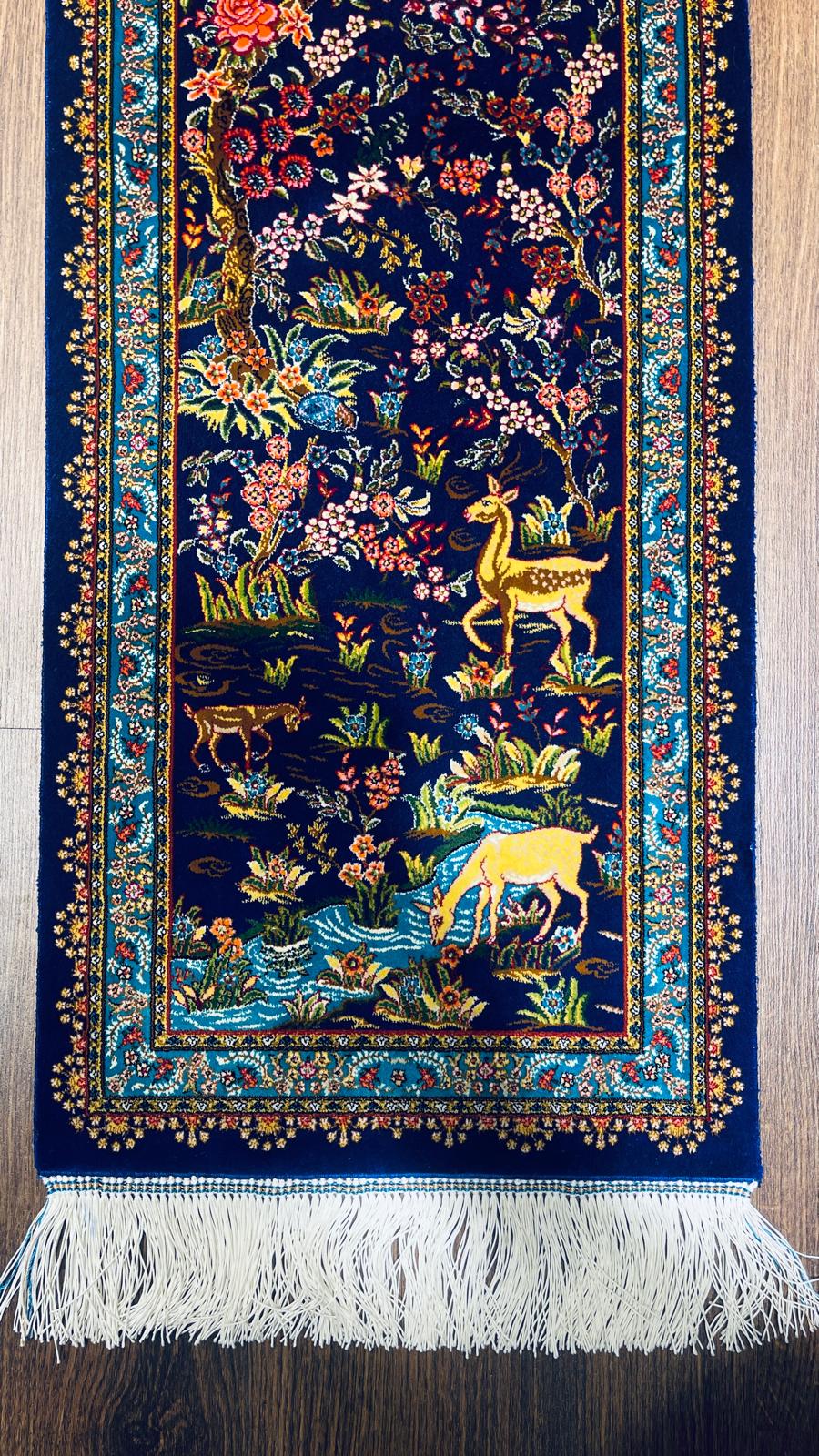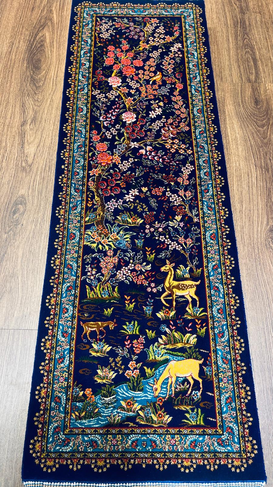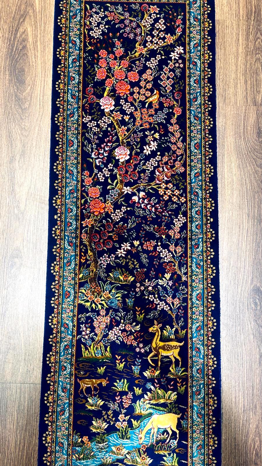 1.31x3.94 ft Handmade Turkish Silk Runner Rug – Navy Blue Deer & Floral Garden Design Luxury Carpet