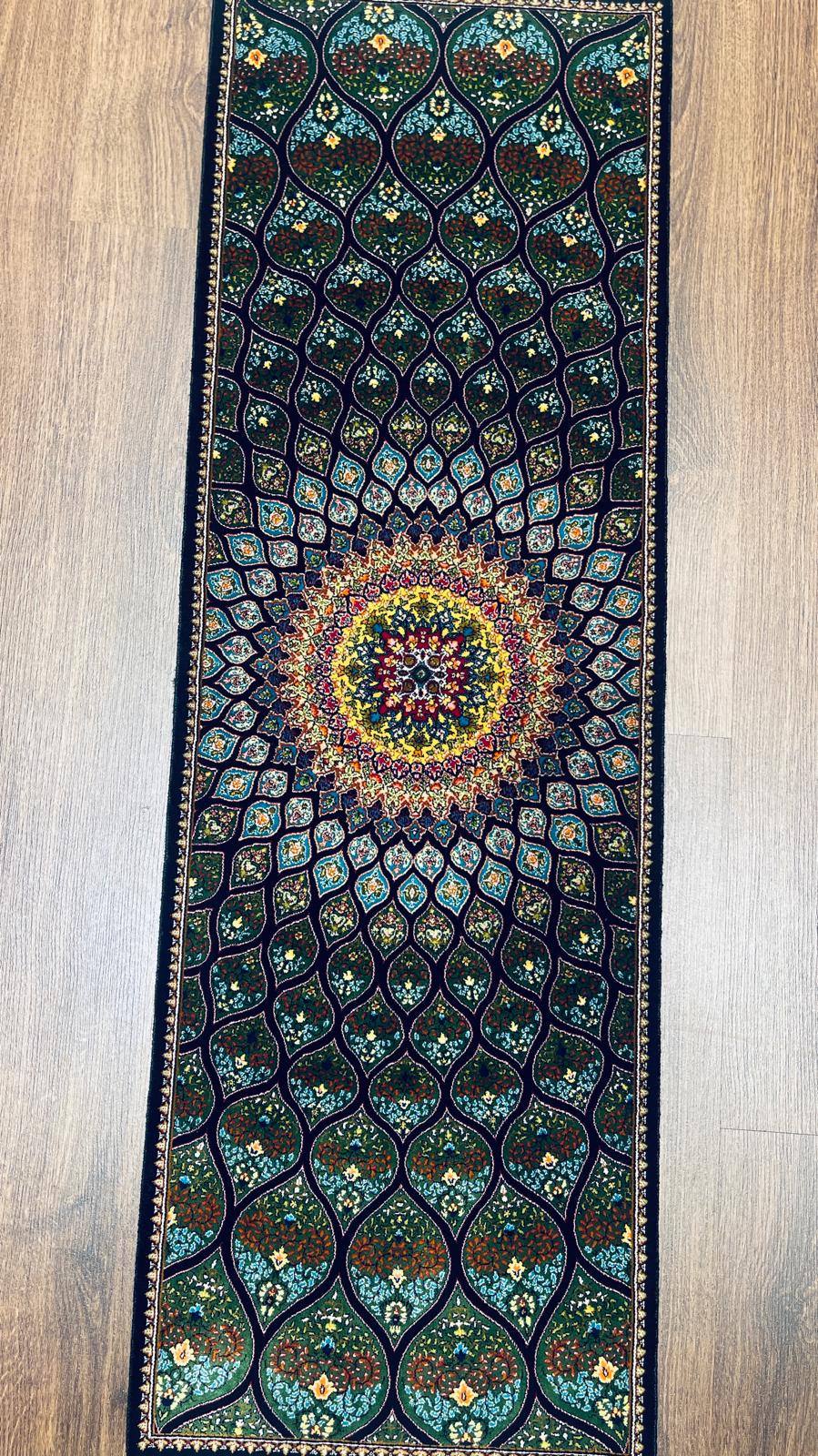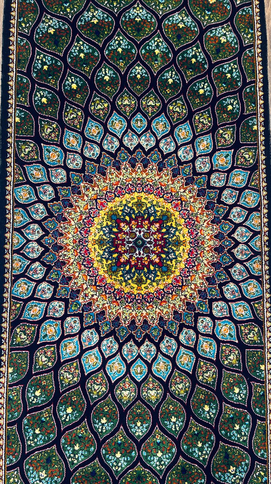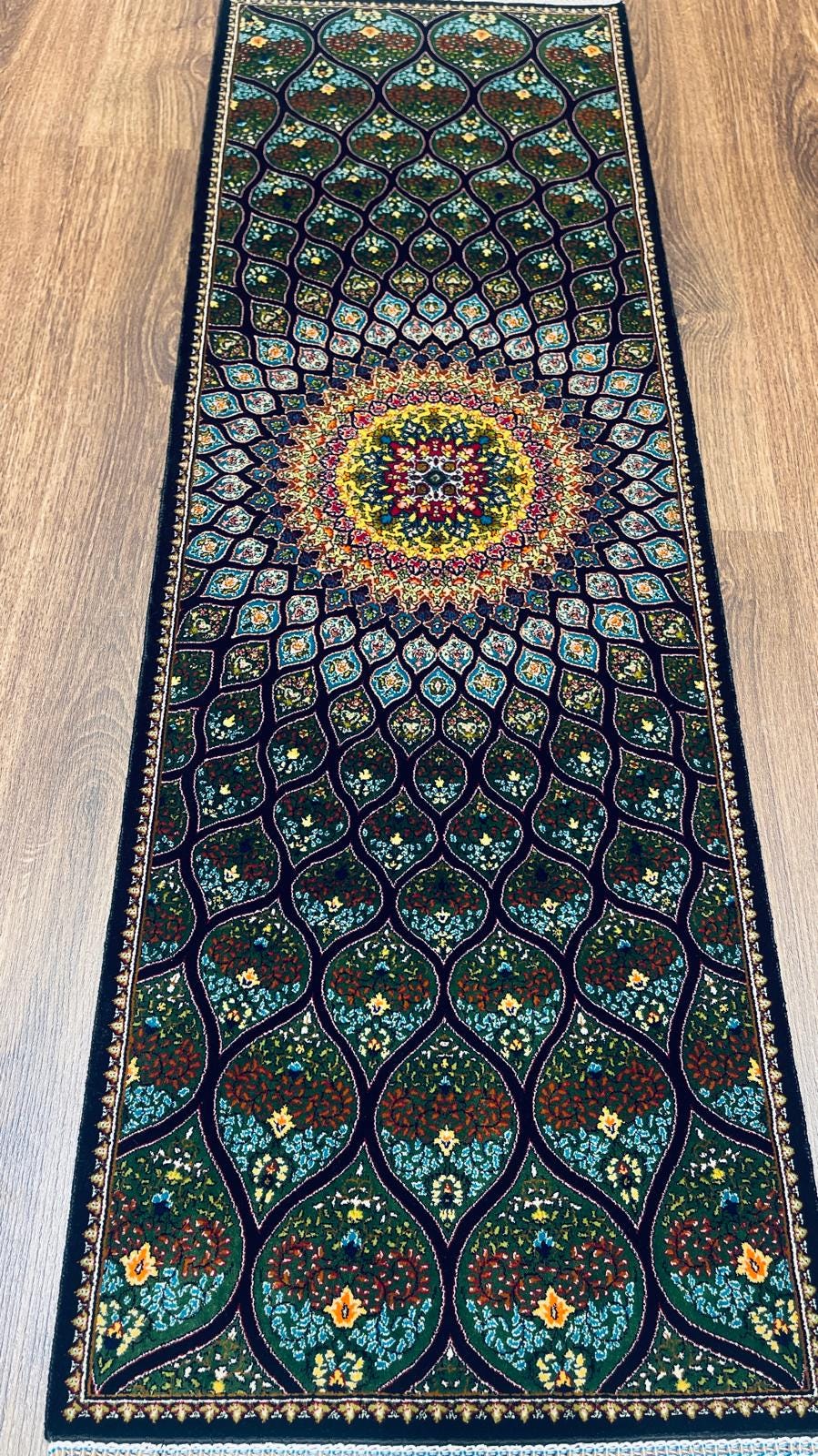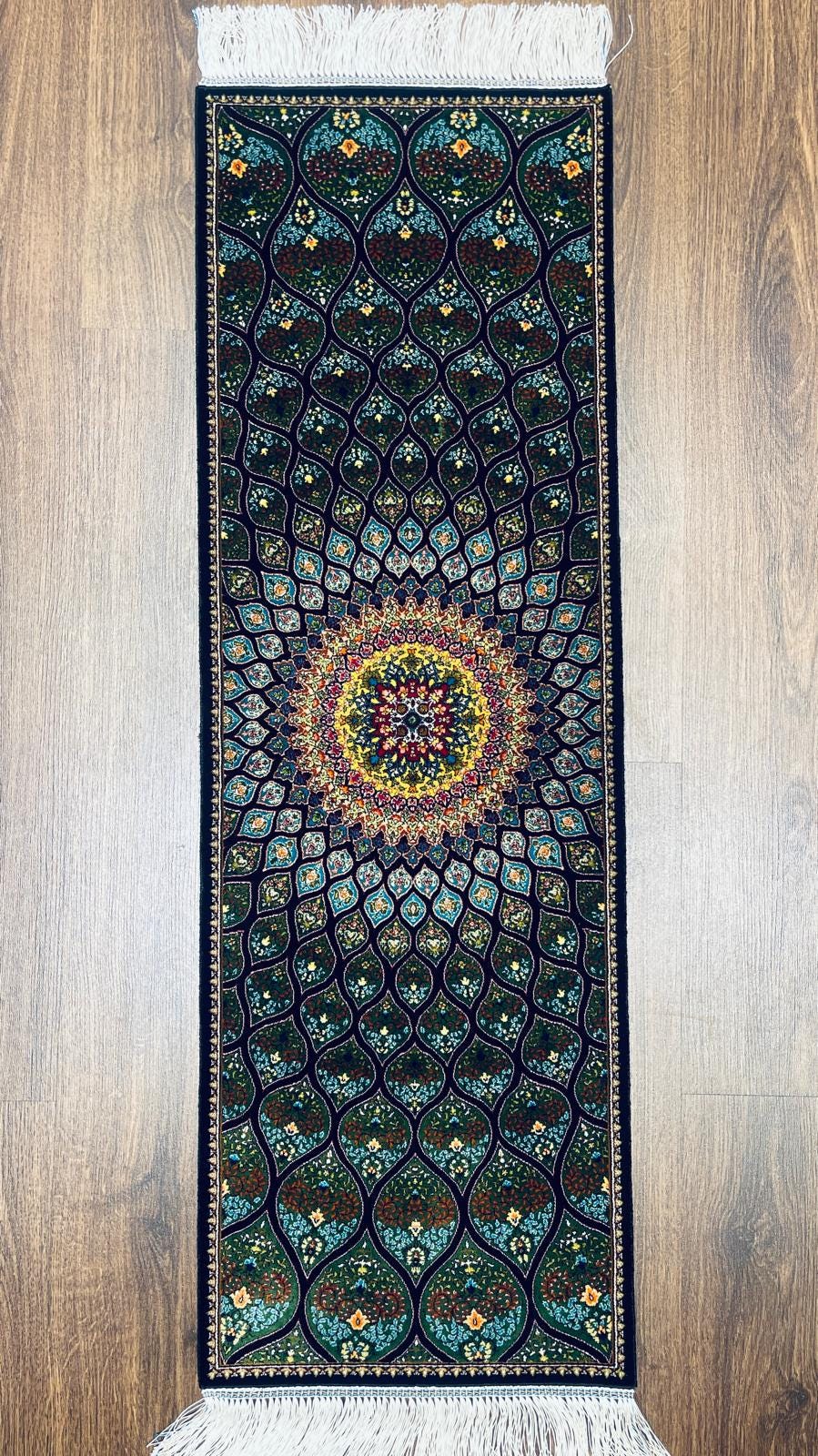 Elevate your space with this handmade Turkish silk runner rug, designed with a captivating peacock-inspired pattern that radiates from a detailed central medallion.