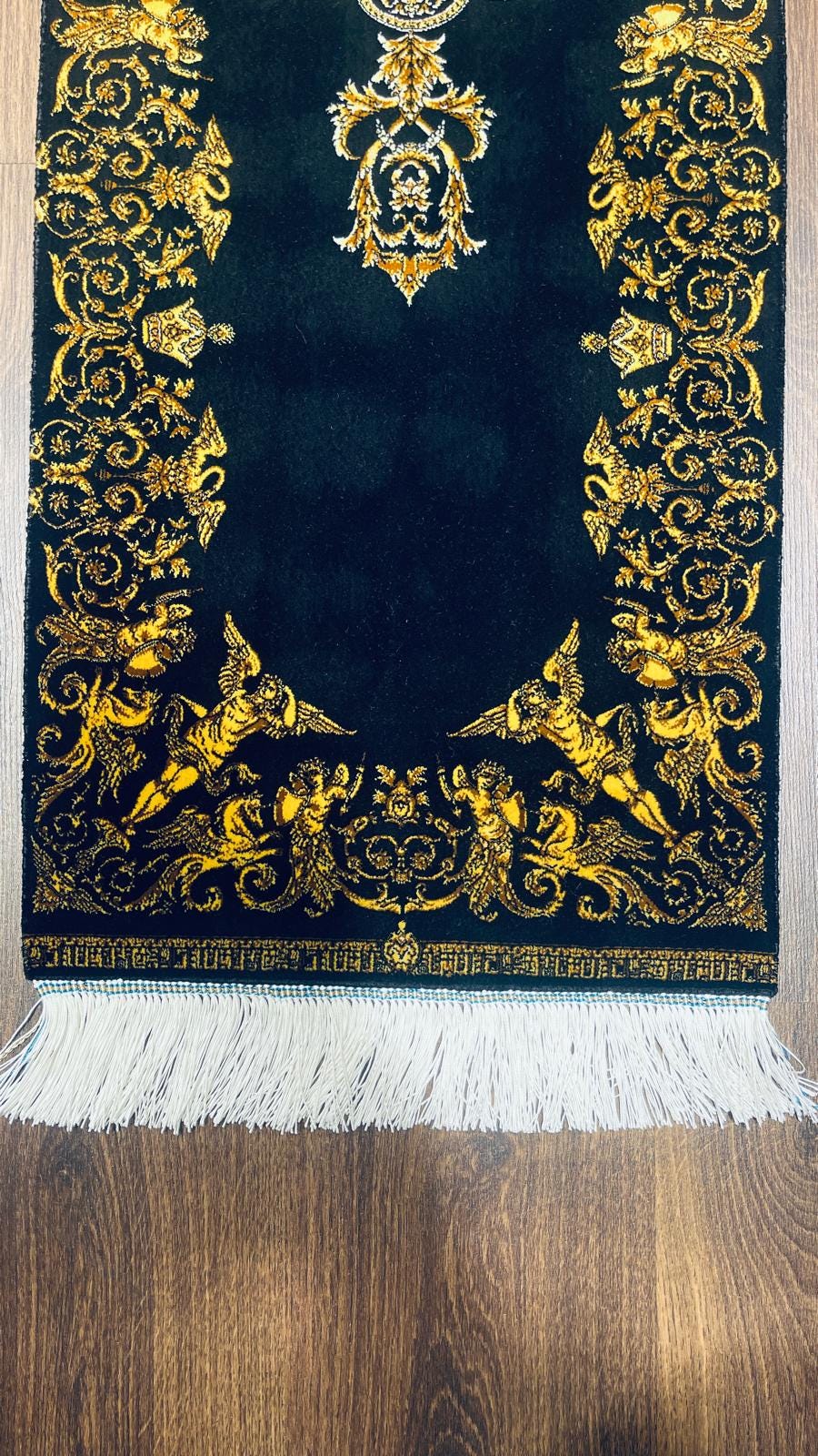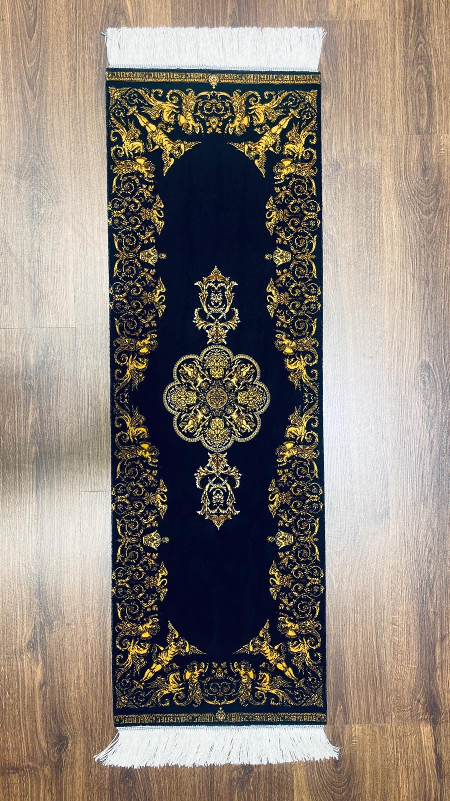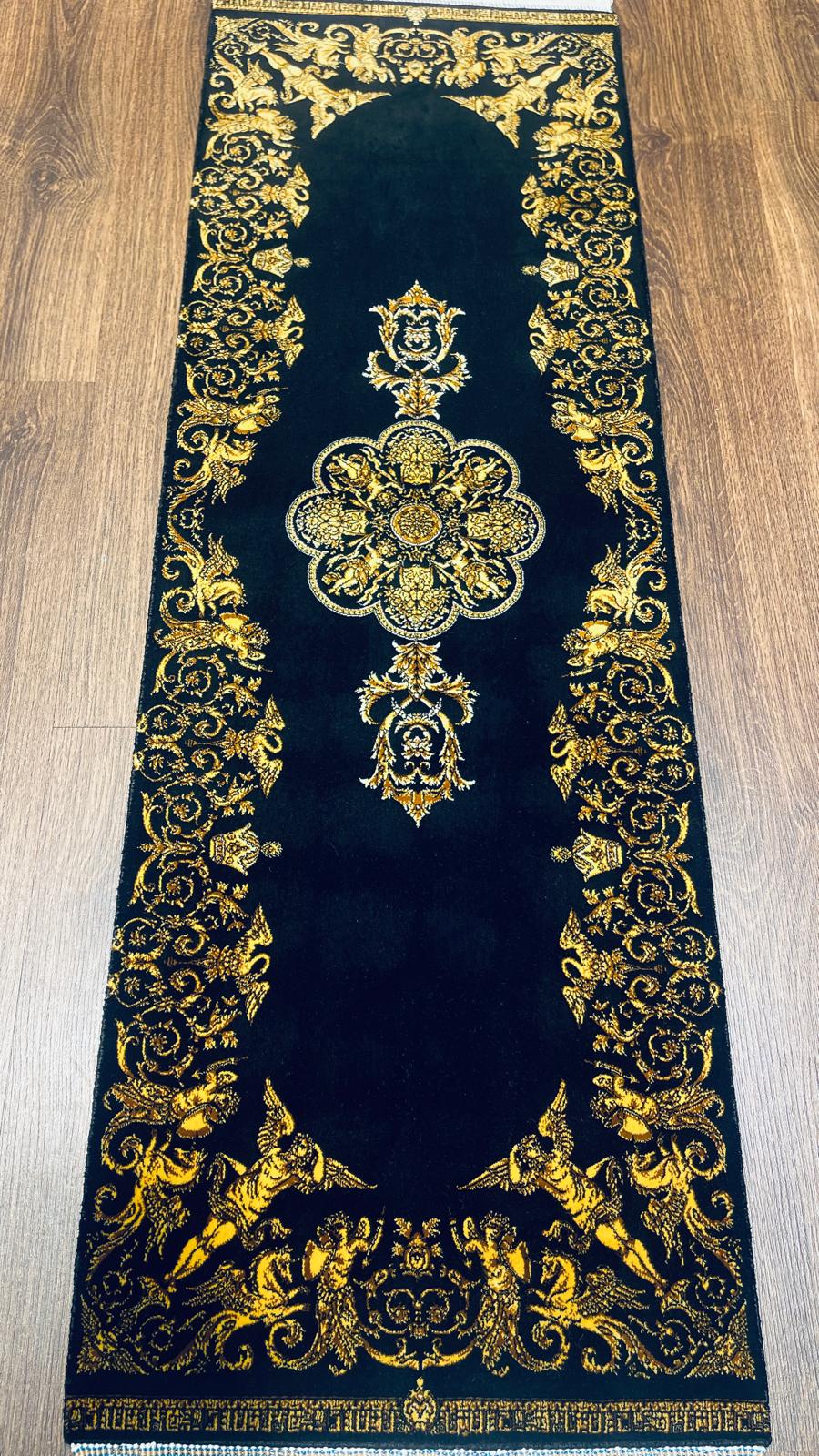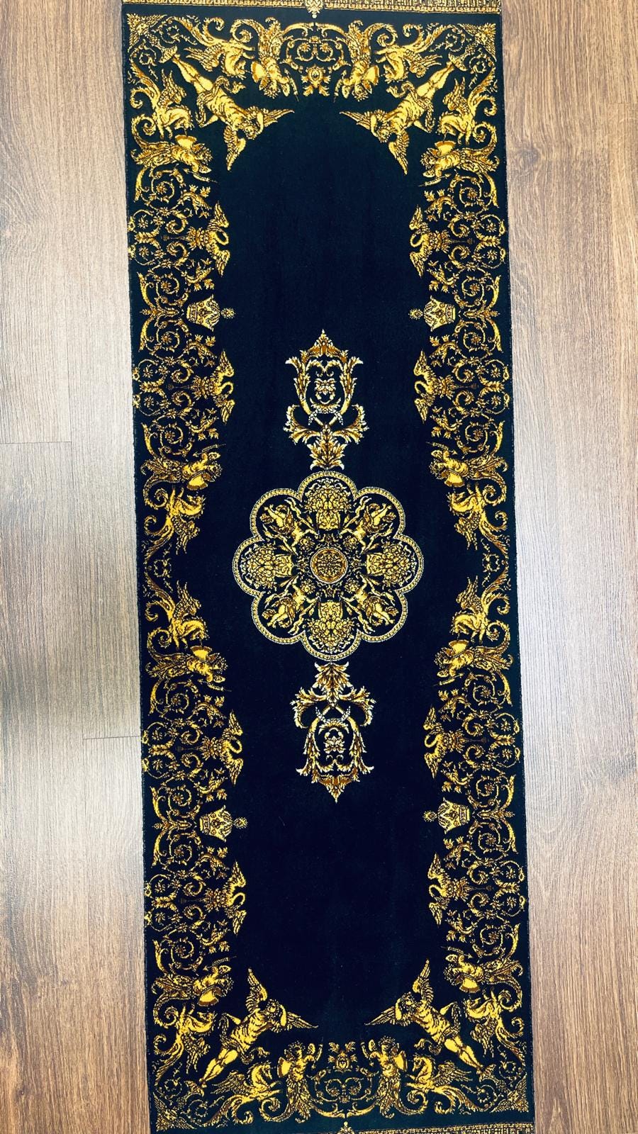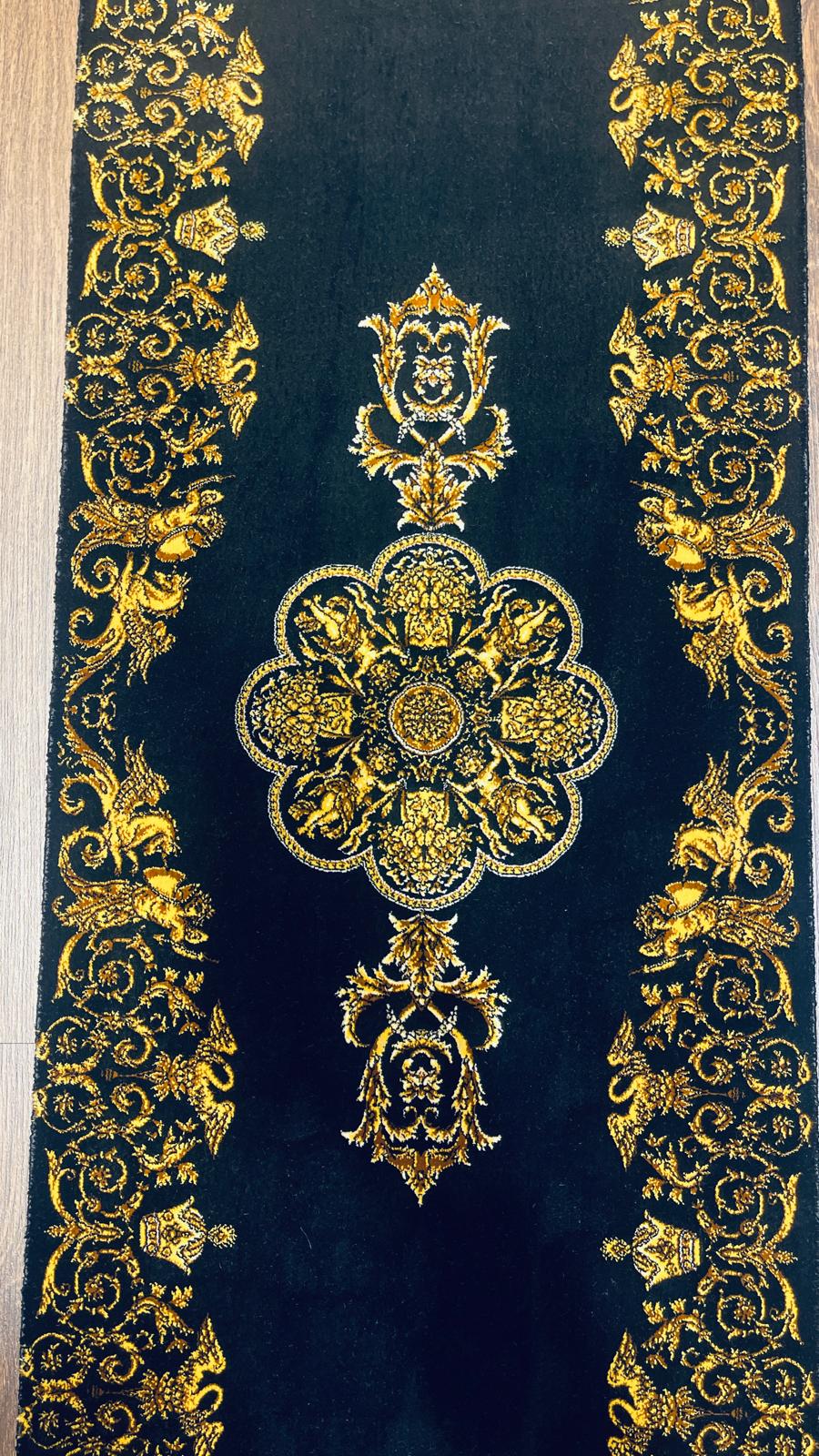The deep black background enhances the intricate golden patterns, creating a dramatic and luxurious contrast. The central medallion and ornate borders give this piece a regal, almost palace-like aesthetic.