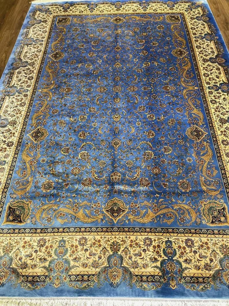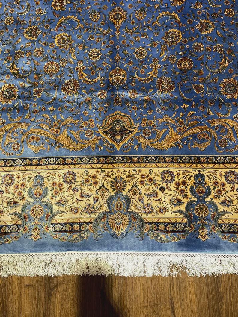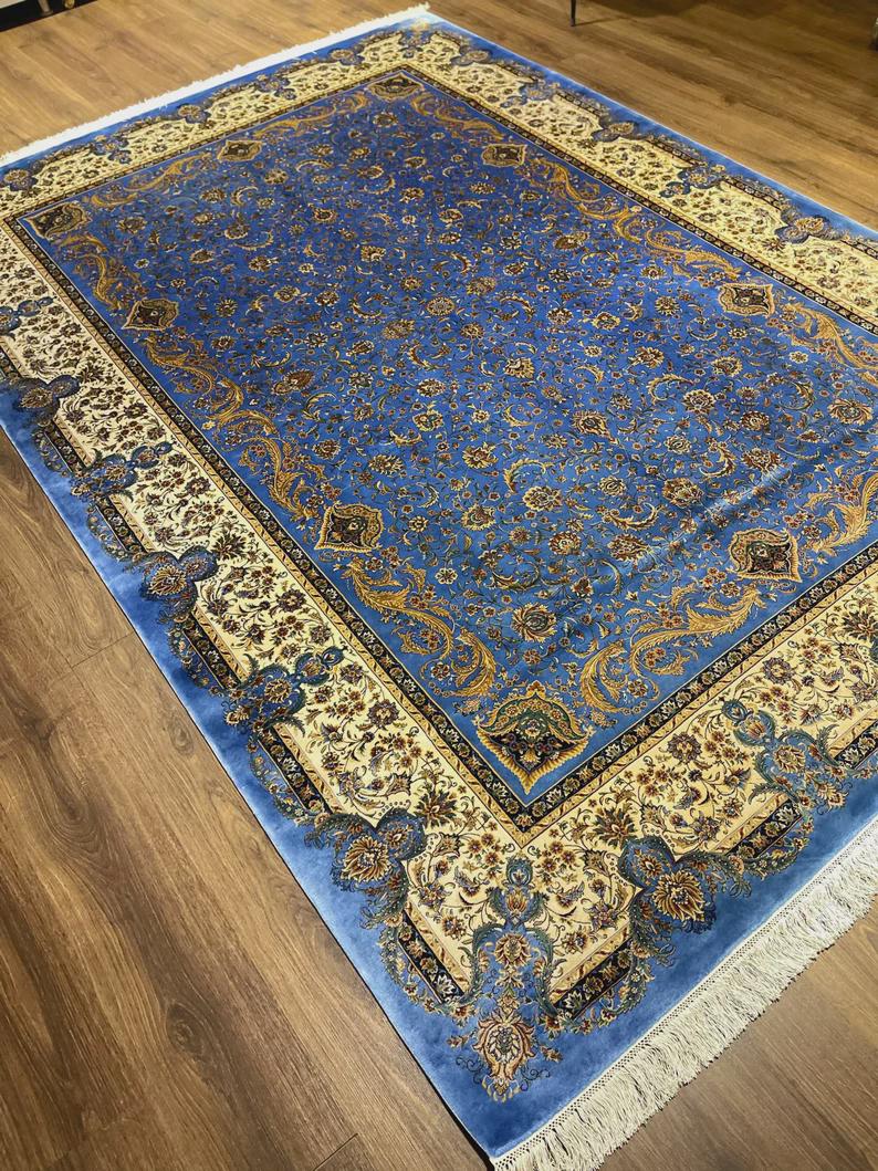Elevate your interior with this luxurious Turkish silk-on-silk rug, featuring an elegant floral oriental design on a rich blue background. This stunning piece combines timeless artistry with refined craftsmanship, making it a perfect statement for any space.