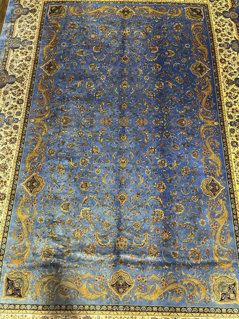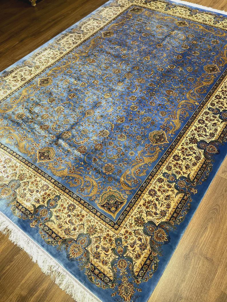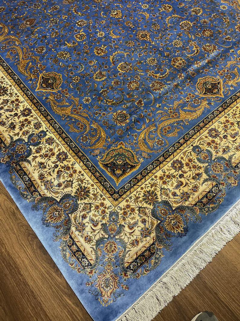 The rug showcases delicate floral motifs and ornamental patterns, arranged in a harmonious composition with elegant borders. The blue field combined with gold and beige accents creates a sophisticated and eye-catching contrast.