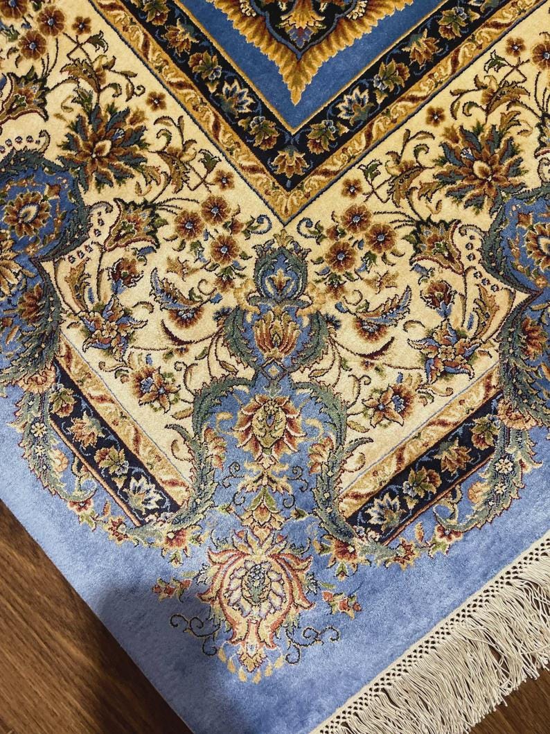 • Origin: Turkey • Type: Silk Rug • Technique: Silk on Silk • Pattern: Floral / Oriental • Colors: Blue, Gold, Beige • Condition: Clean and Ready to Use