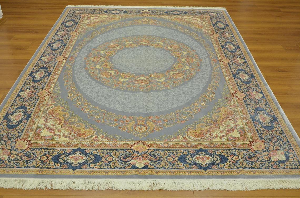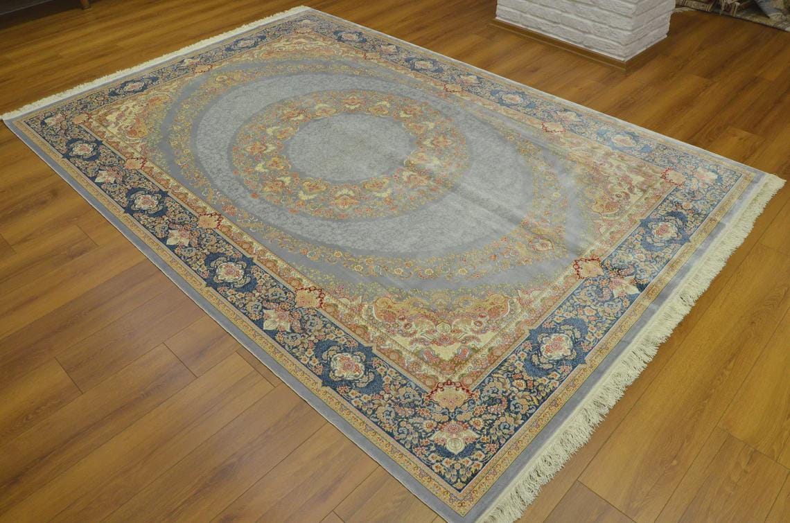 Bring refined elegance and timeless luxury into your home with this beautiful Turkish silk-on-silk carpet, featuring a sophisticated medallion design on a soft grey background.