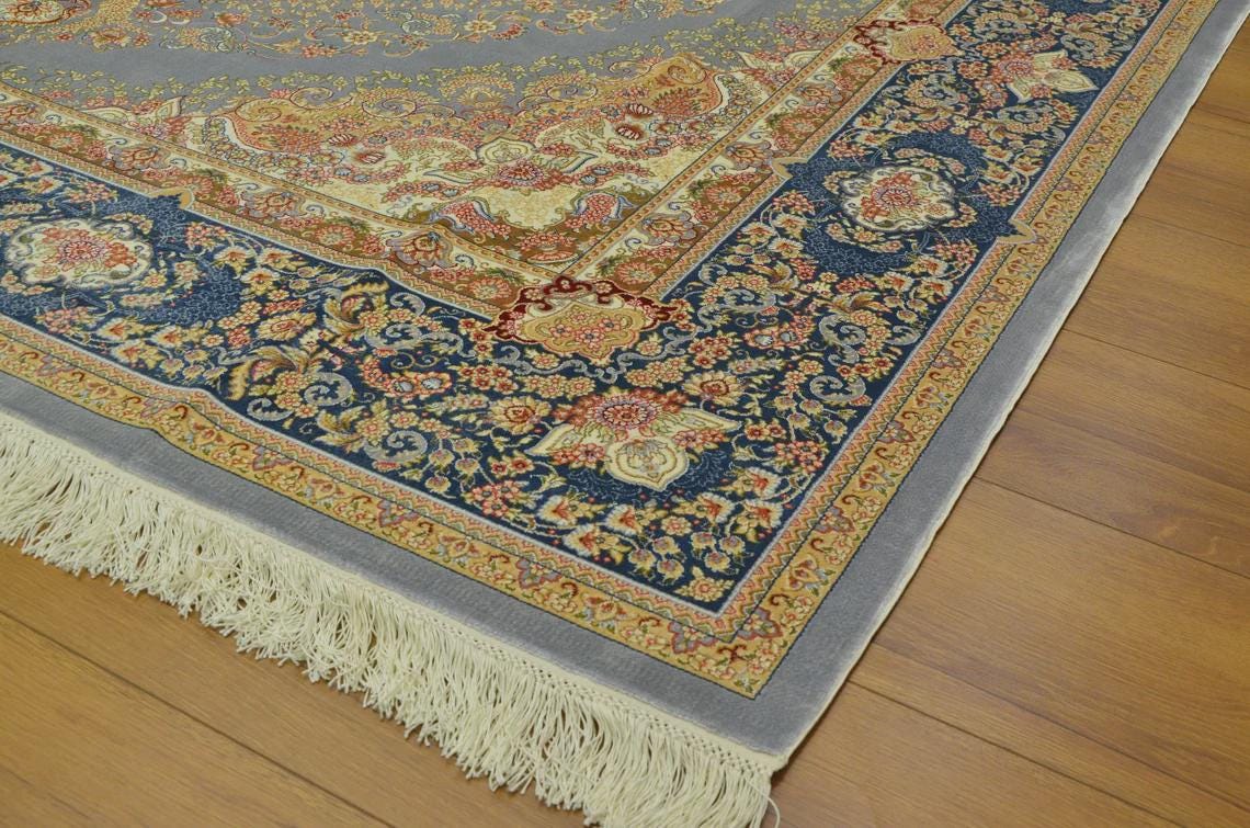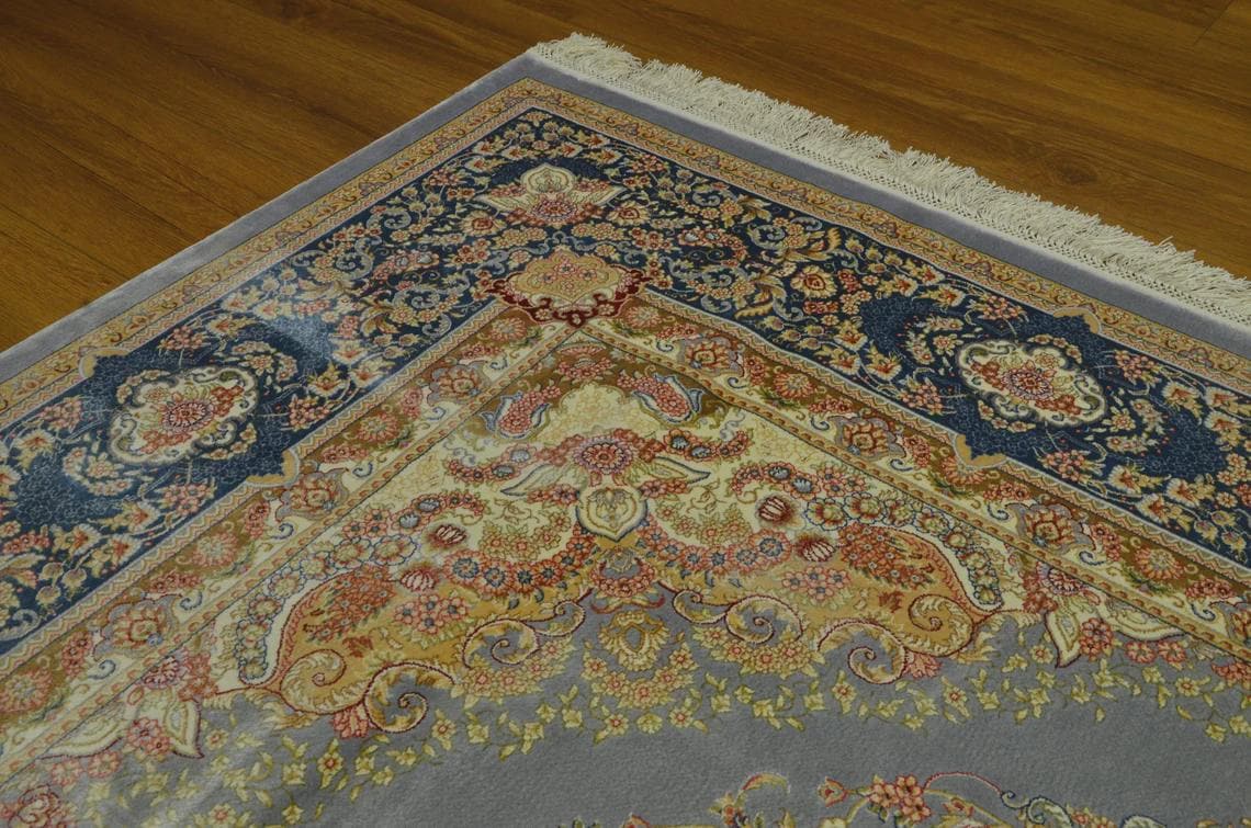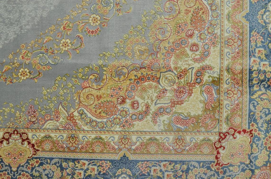 • Origin: Turkey • Material: 100% Silk (Silk on Silk) • Technique: Machine made with hand finishing • Pattern: Medallion / Floral • Colors: Grey, Blue, Gold • Condition: Clean and Ready to Use