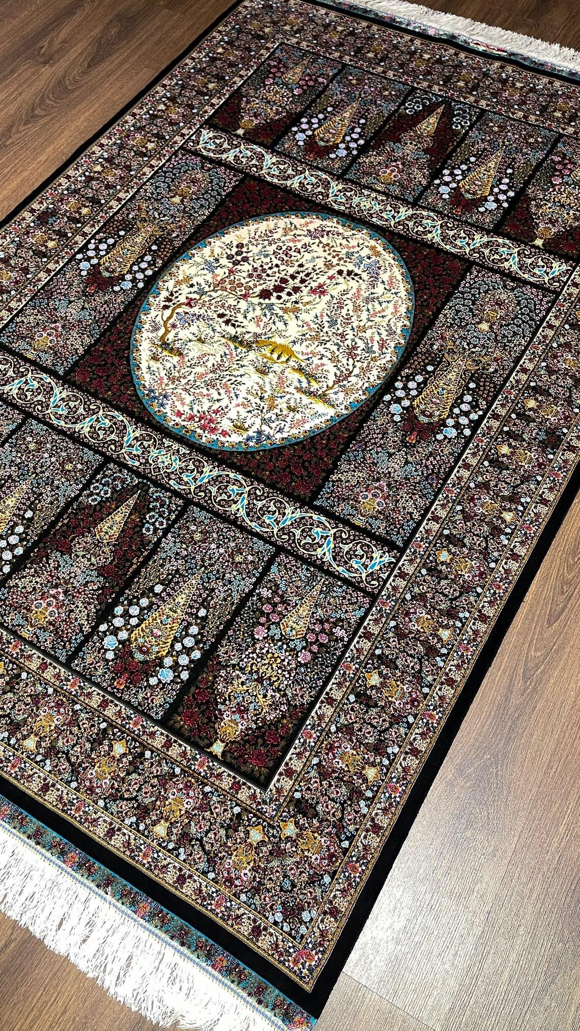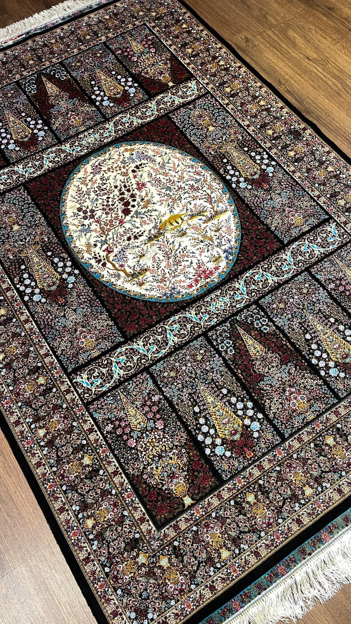 This unique piece features an intricate composition of traditional hunting motifs, floral elements, and detailed medallion design, all beautifully arranged on a rich black, red, and blue color palette. Inspired by classic Ottoman and Persian artistry, this rug brings both history and sophistication into your living space.