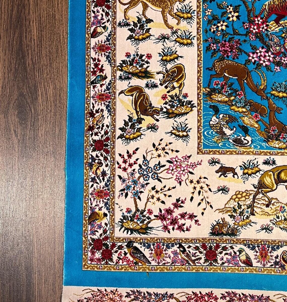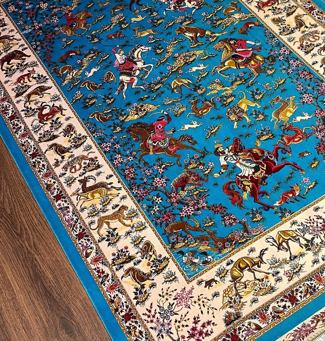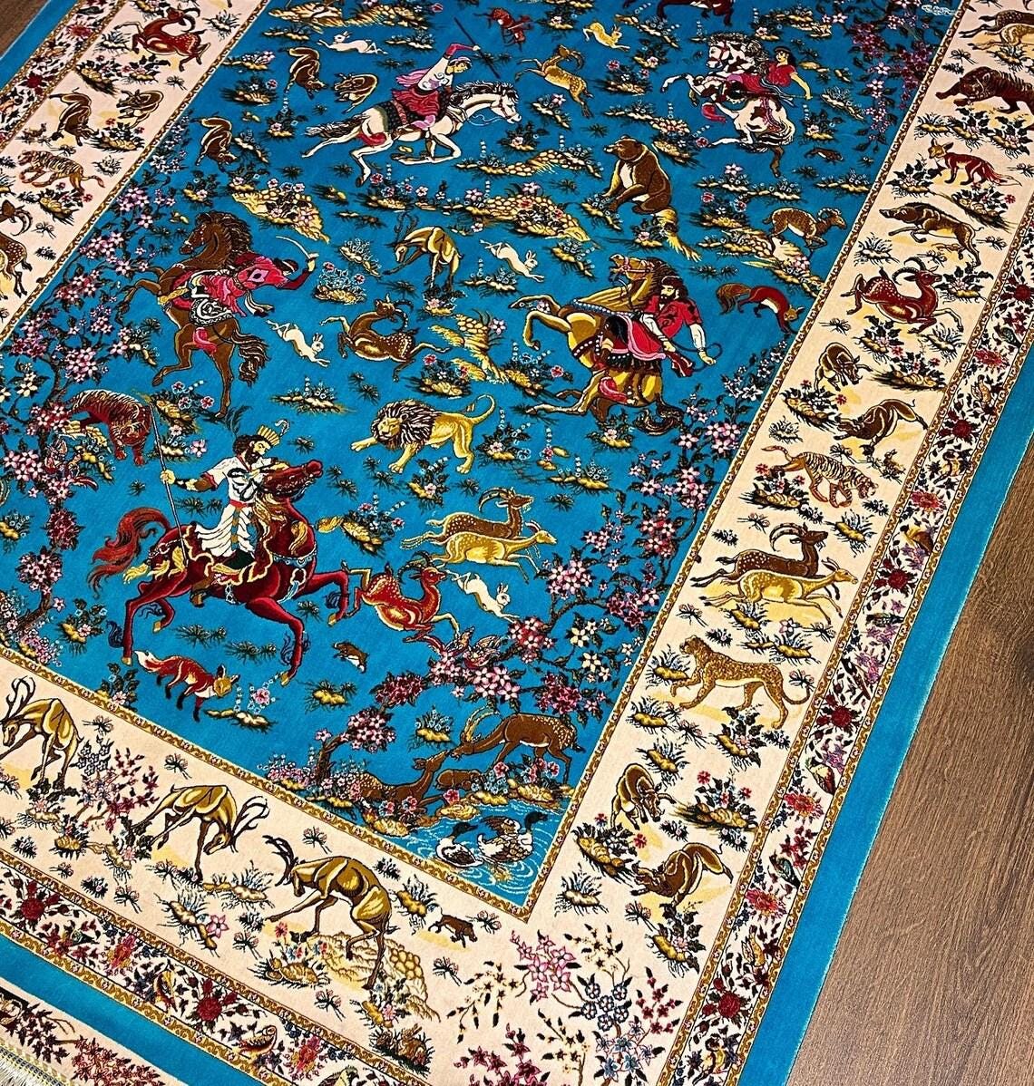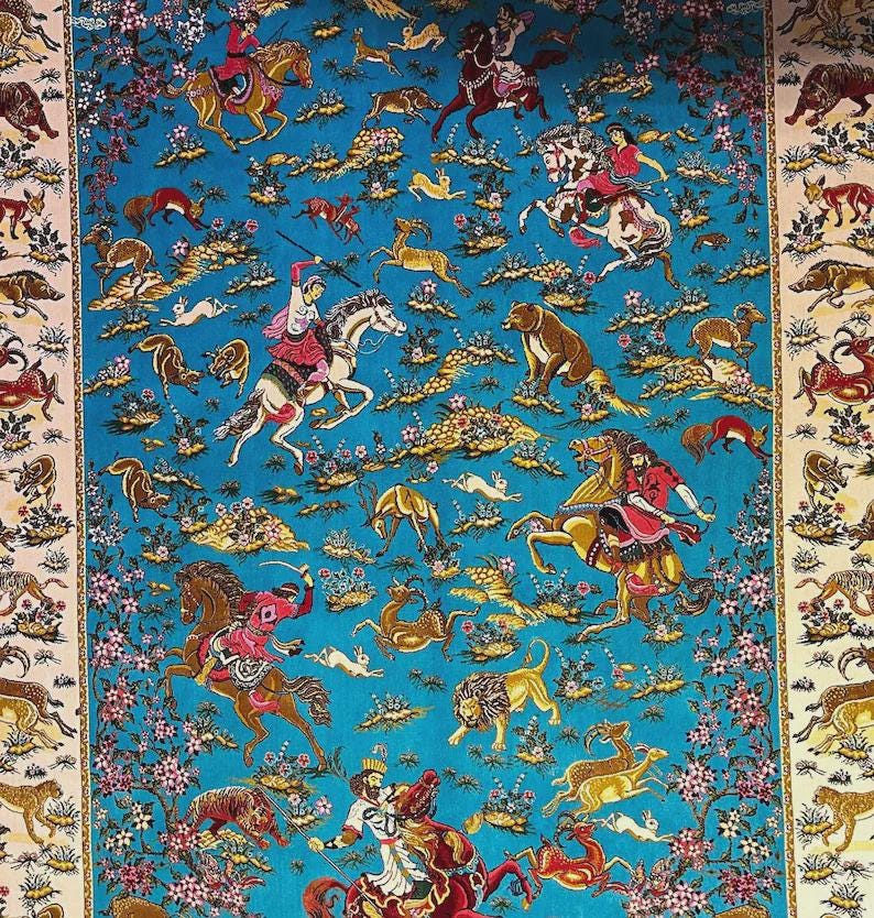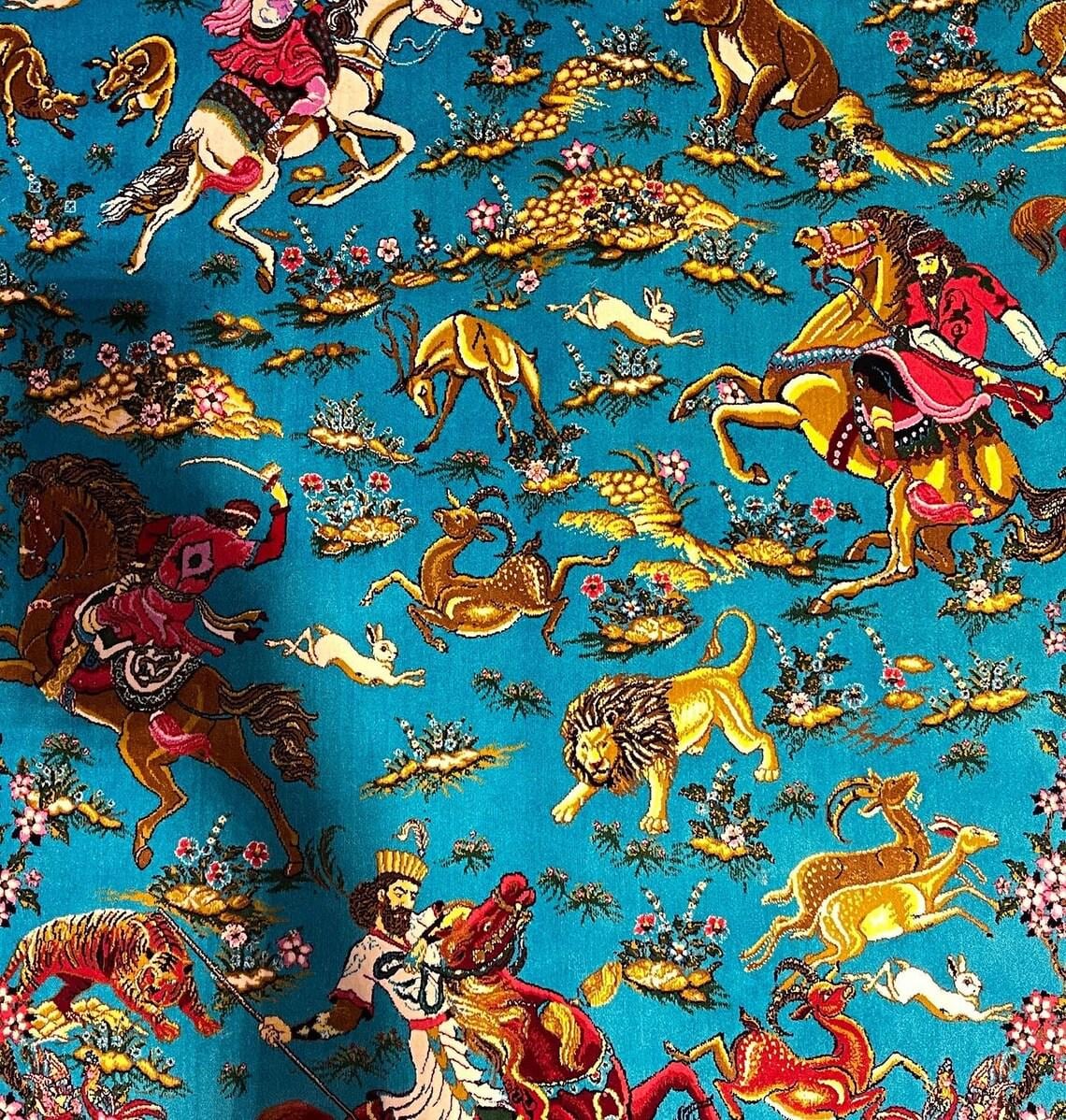 This unique rug features a highly detailed animal and hunting scene design, including horses, lions, deer, and traditional figures, all set on a vibrant turquoise blue background. Inspired by classic Oriental and Persian motifs, it creates a powerful visual impact and tells a story through its intricate patterns.