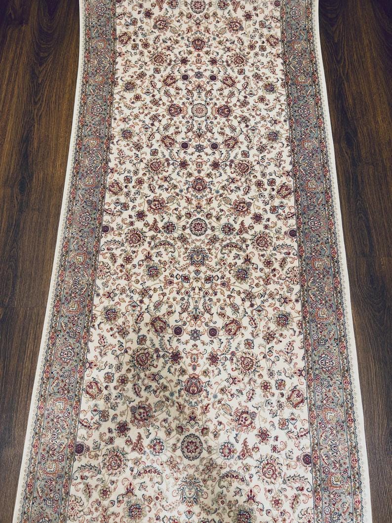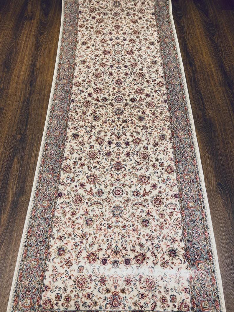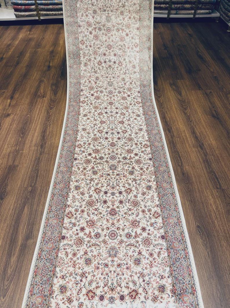 This stunning piece features a delicate floral pattern in soft pastel tones, inspired by classic Ottoman and Hereke-style designs. Its long and elegant form makes it perfect for transforming hallways, entryways, and narrow spaces into sophisticated living areas.