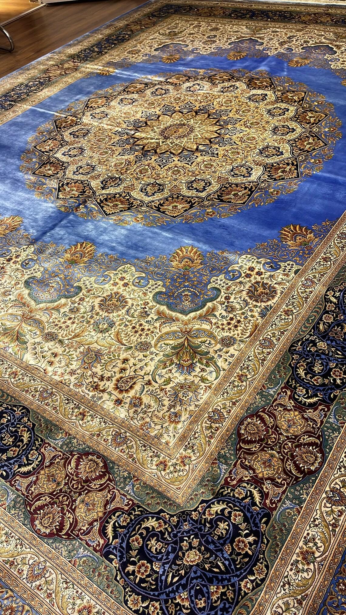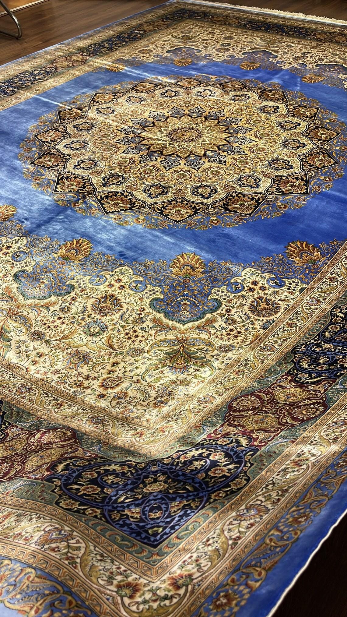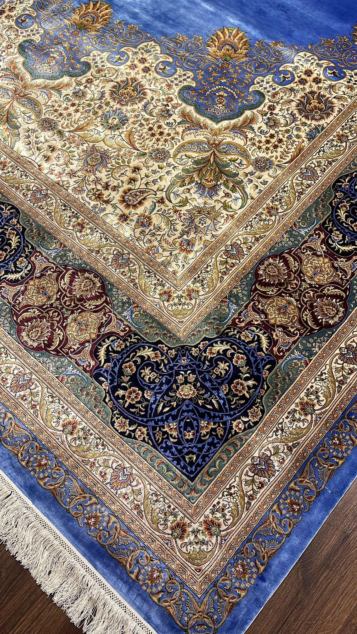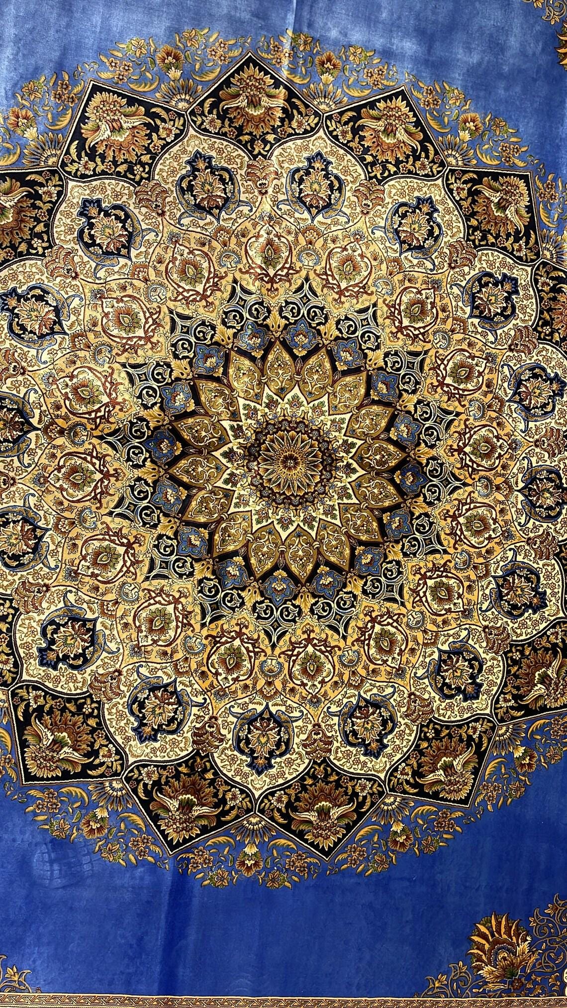 • Origin: Turkey • Material: Silk on Silk • Technique: Hand-finished / Fine weaving • Pattern: Medallion & Floral • Colors: Blue, Ivory, Gold accents • Condition: Brand New
