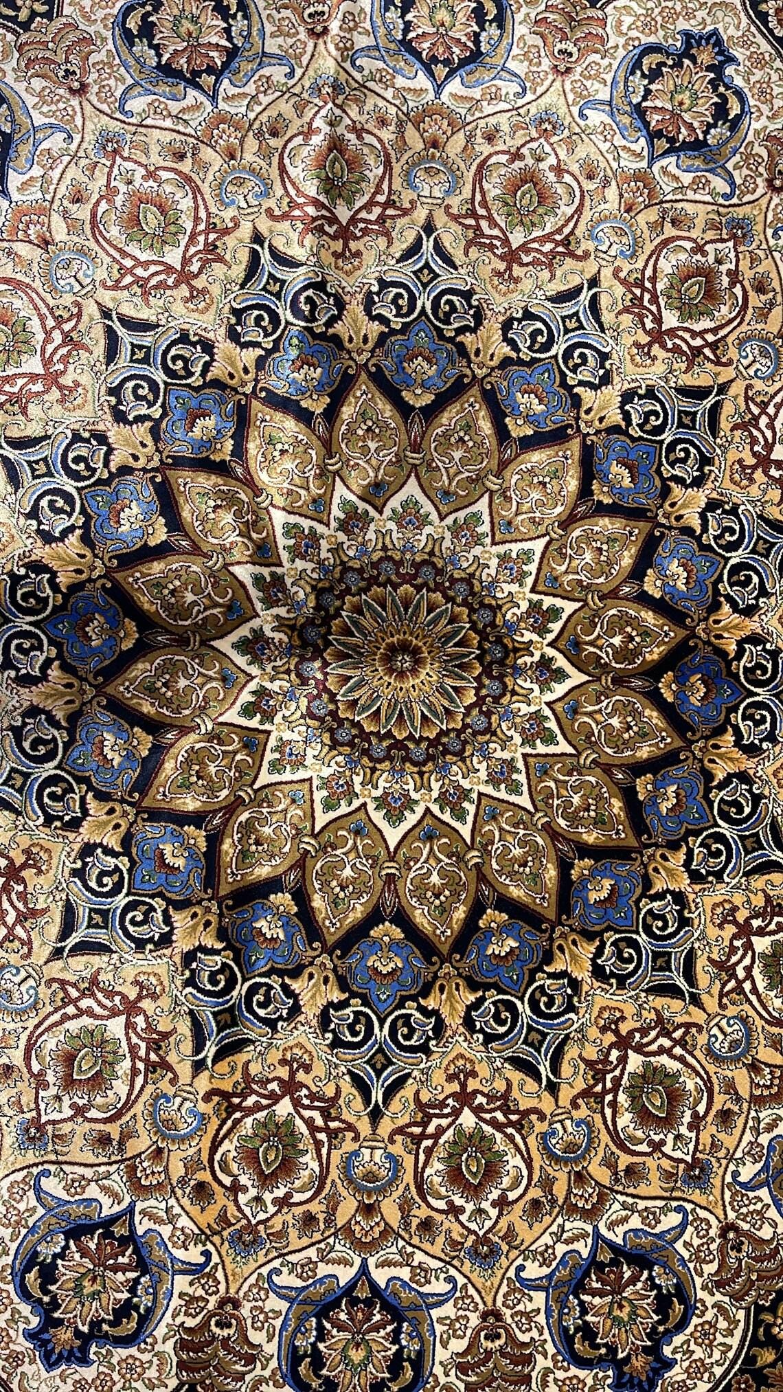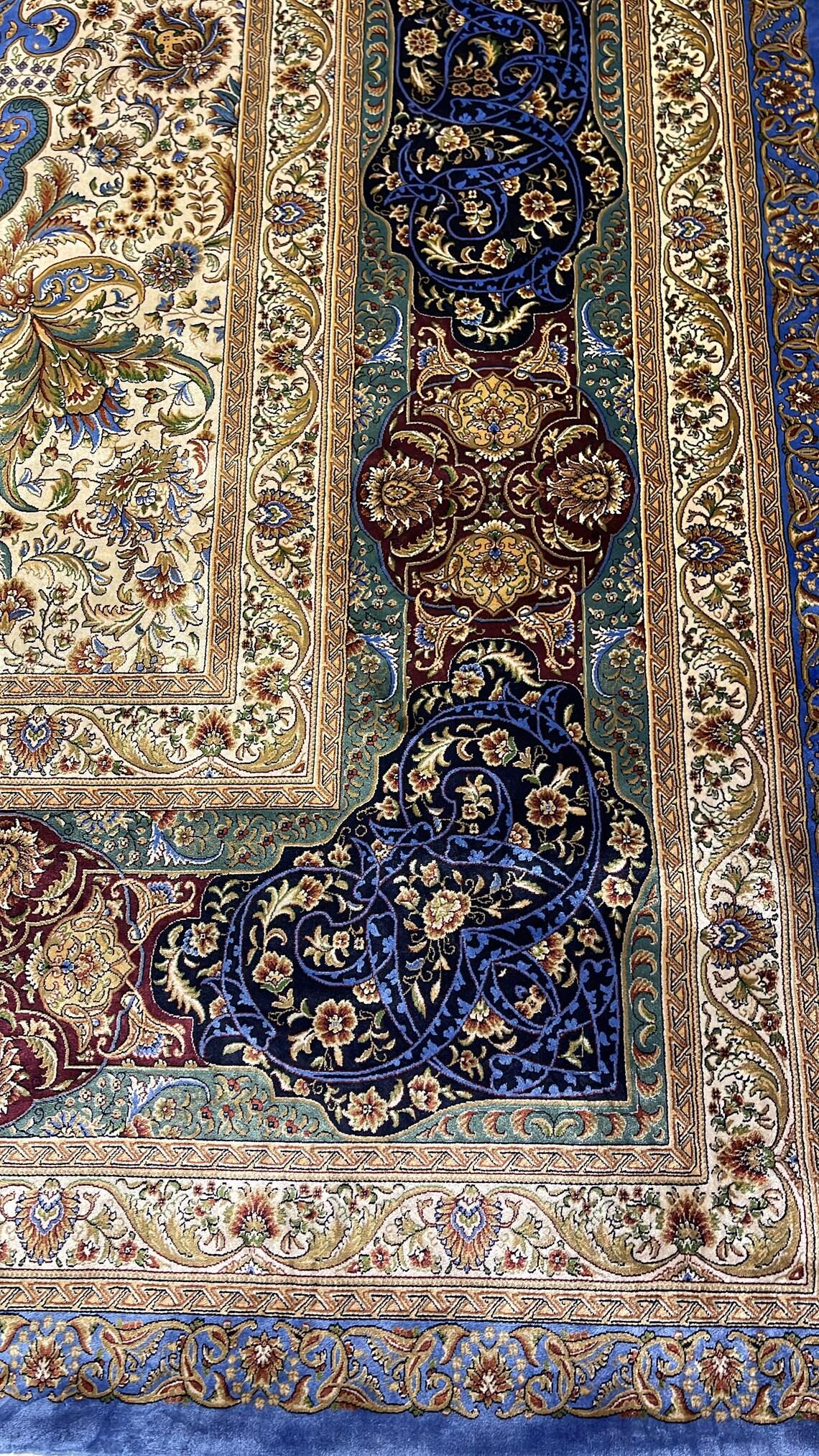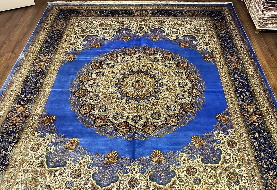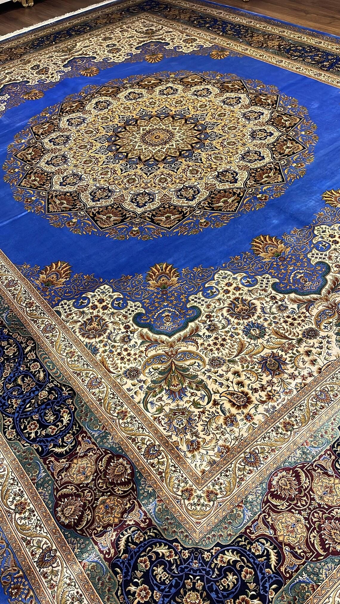 • Origin: Turkey • Material: Silk on Silk • Technique: Hand-finished / Fine weaving • Pattern: Medallion & Floral • Colors: Blue, Ivory, Gold accents • Condition: Brand New