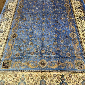 This stunning piece features a classic central medallion design, surrounded by intricate floral and ornamental motifs inspired by traditional Ottoman and Oriental patterns. The rich blue and ivory color palette creates a sophisticated and eye-catching focal point for any interior.