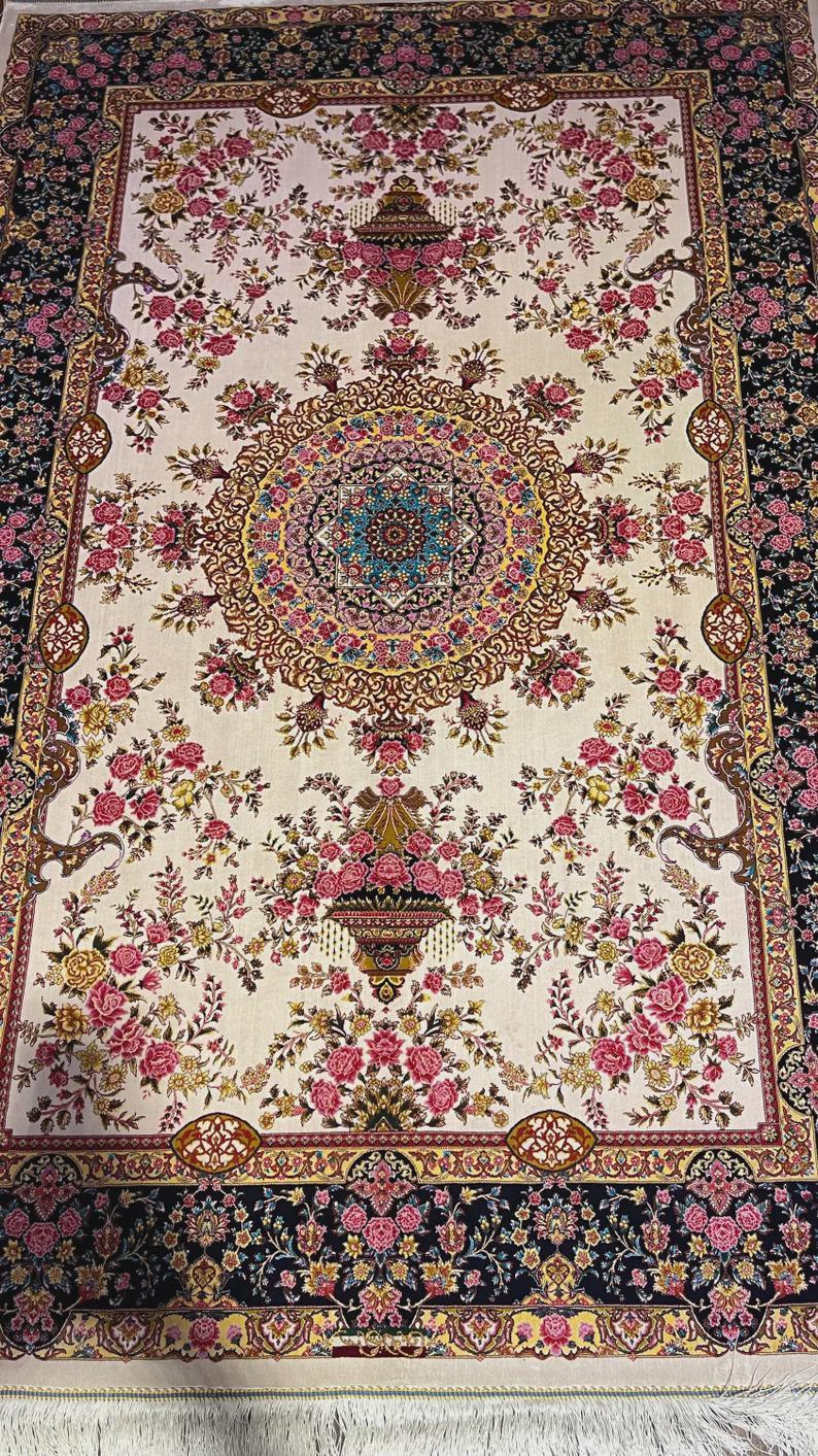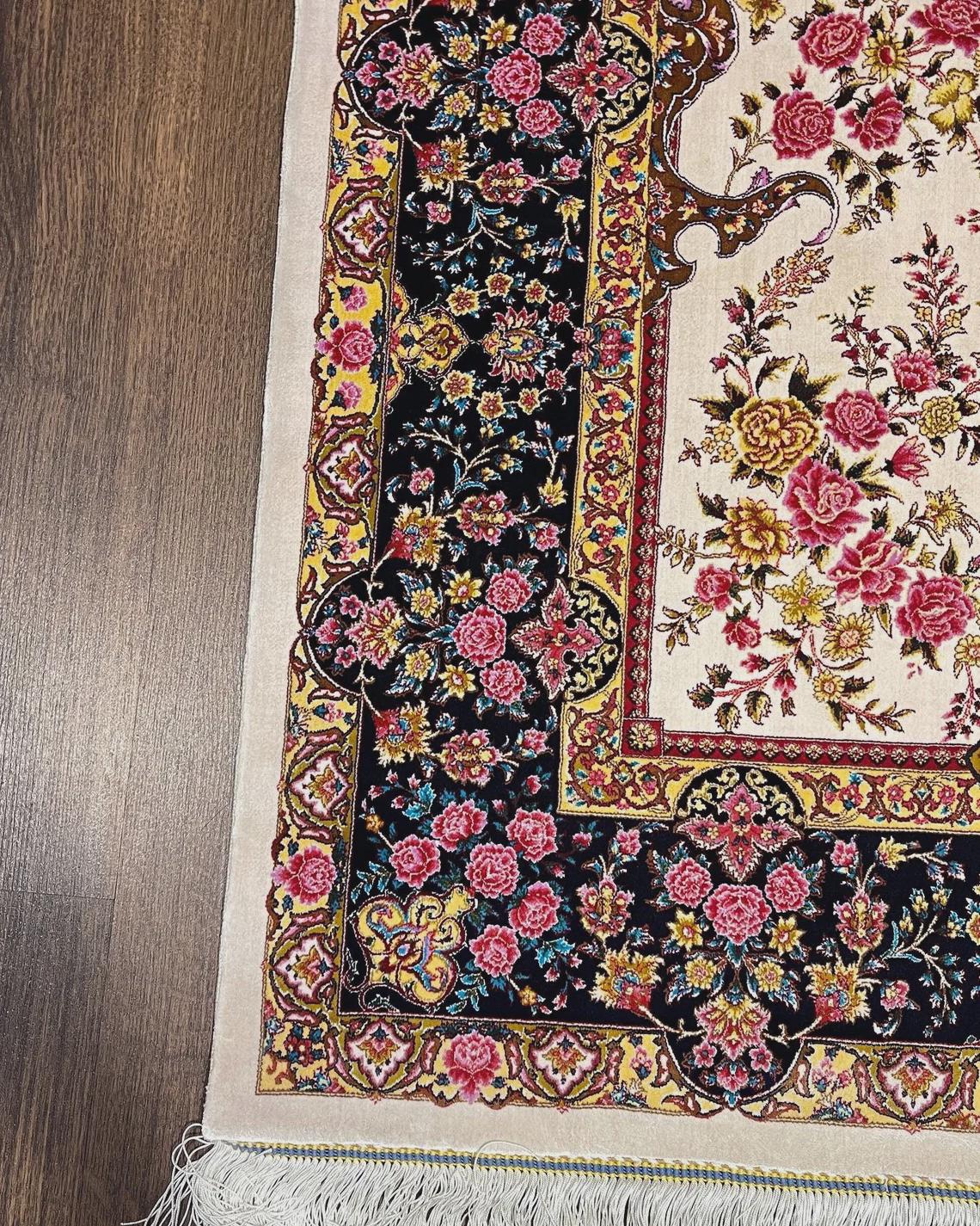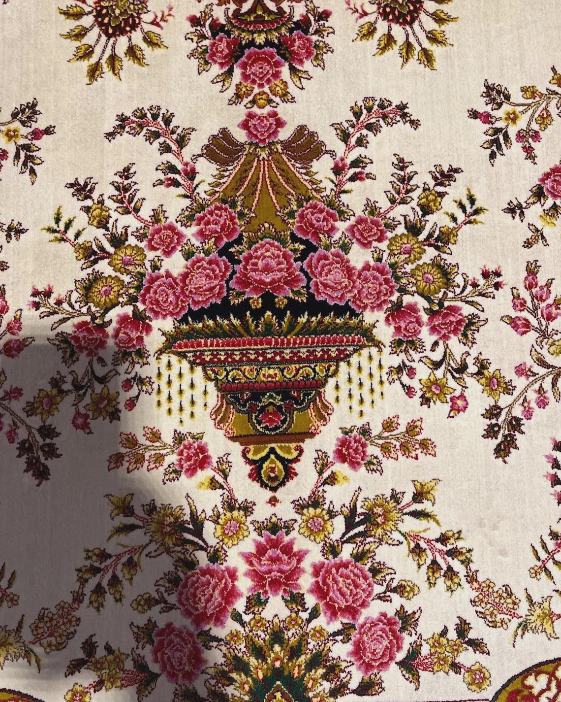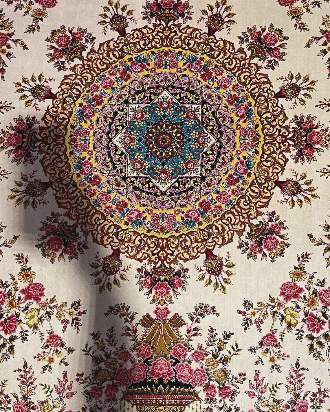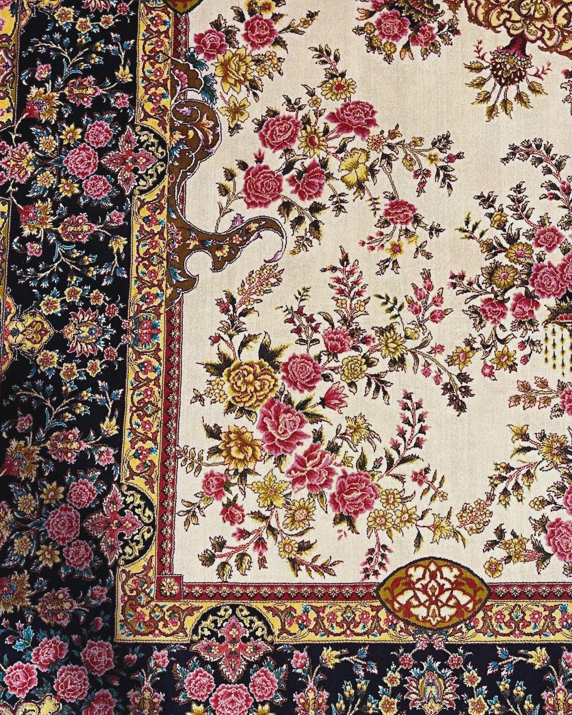 • Origin: Turkey • Material: 100% Silk (Silk on Silk) • Technique: Fine weaving & hand-finished • Pattern: Floral Medallion • Colors: Ivory, Rose, Gold, Black • Condition: Brand New