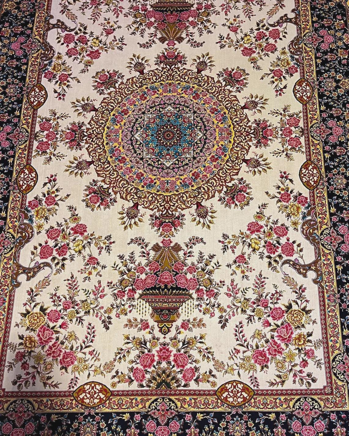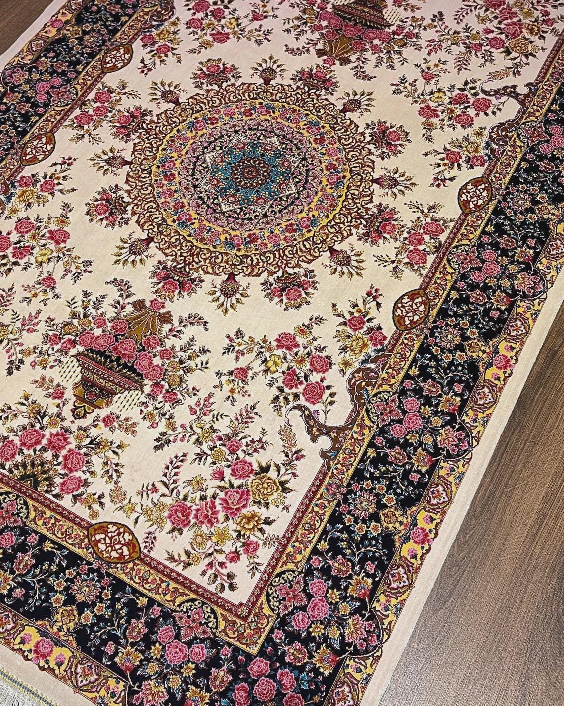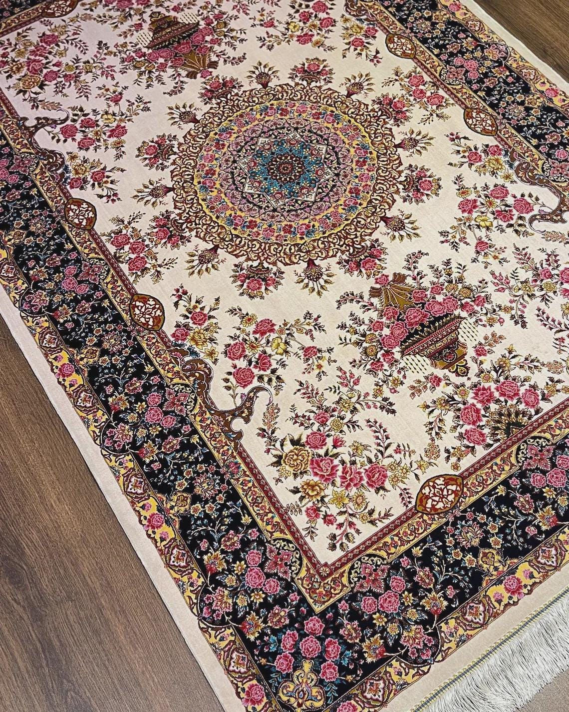 This exceptional piece features a detailed central medallion surrounded by elegant floral motifs, set on a soft ivory background. The rich combination of rose, gold, black, and pastel tones creates a sophisticated and warm atmosphere in any interior.