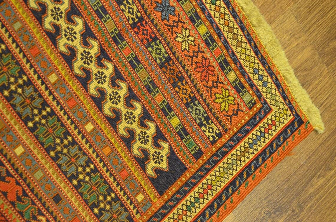 This unique piece features traditional Ottoman-inspired geometric and tribal motifs, arranged in striking horizontal bands. The rich combination of warm reds, earthy tones, and intricate patterns reflects the deep-rooted artistry of Anatolian weaving traditions.