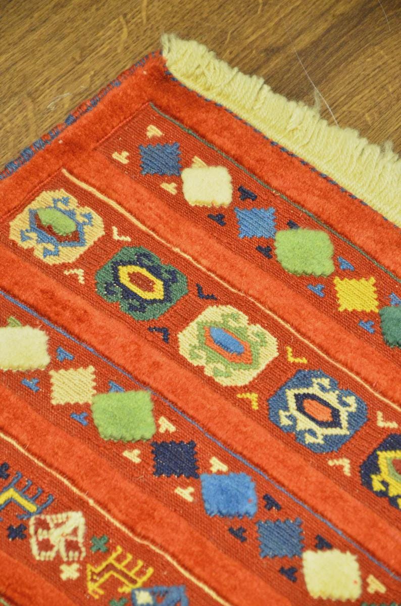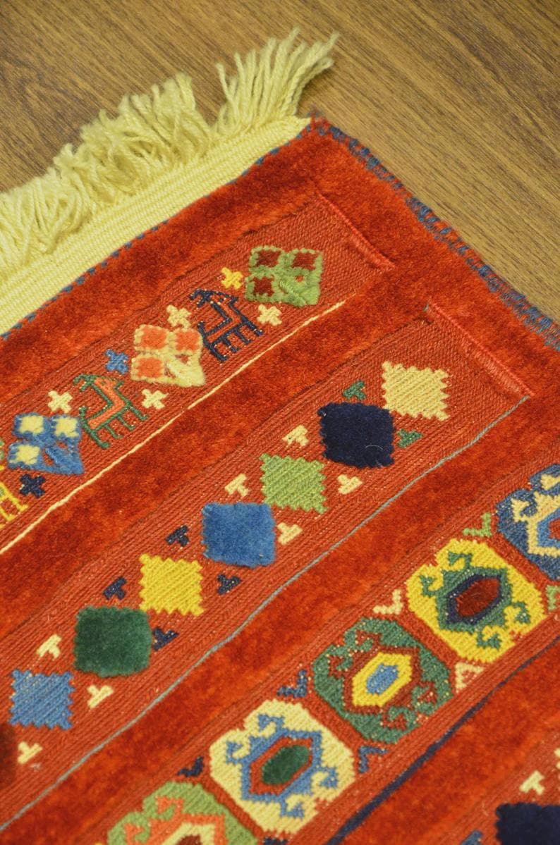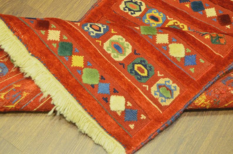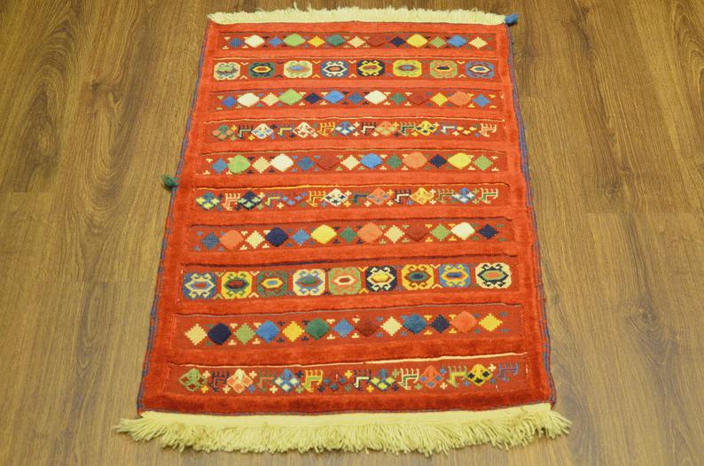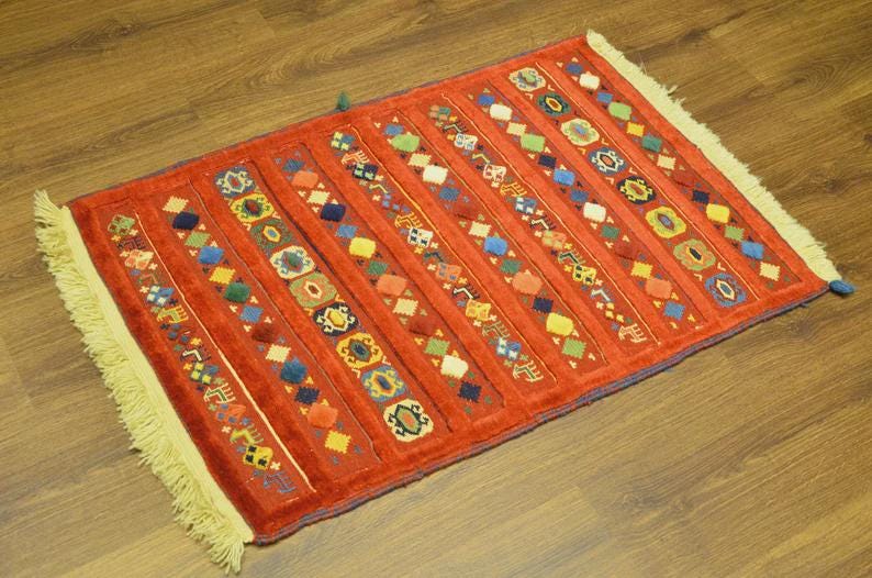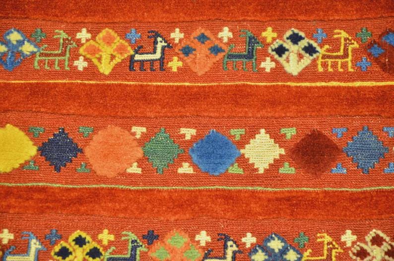 This beautiful rug features traditional tribal motifs arranged in colorful horizontal bands, reflecting the symbolic storytelling of Kurdish weaving traditions. The rich red background combined with vivid geometric patterns creates a warm, energetic, and eye-catching design.