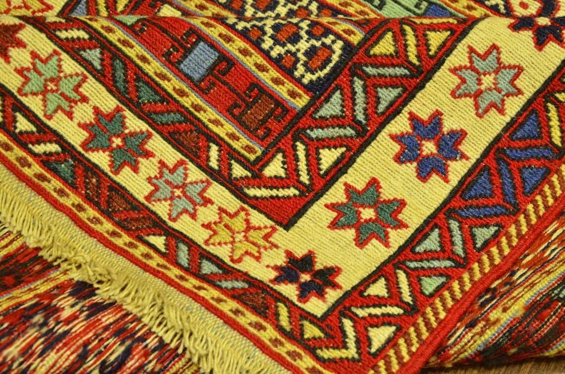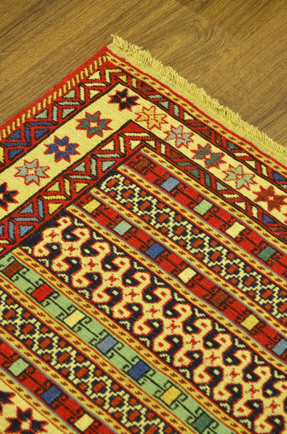 Handwoven using 100% wool with traditional embroidery techniques, this rug offers durability along with a soft, natural texture. The use of natural dyes enhances its organic beauty and ensures that each piece is completely unique.