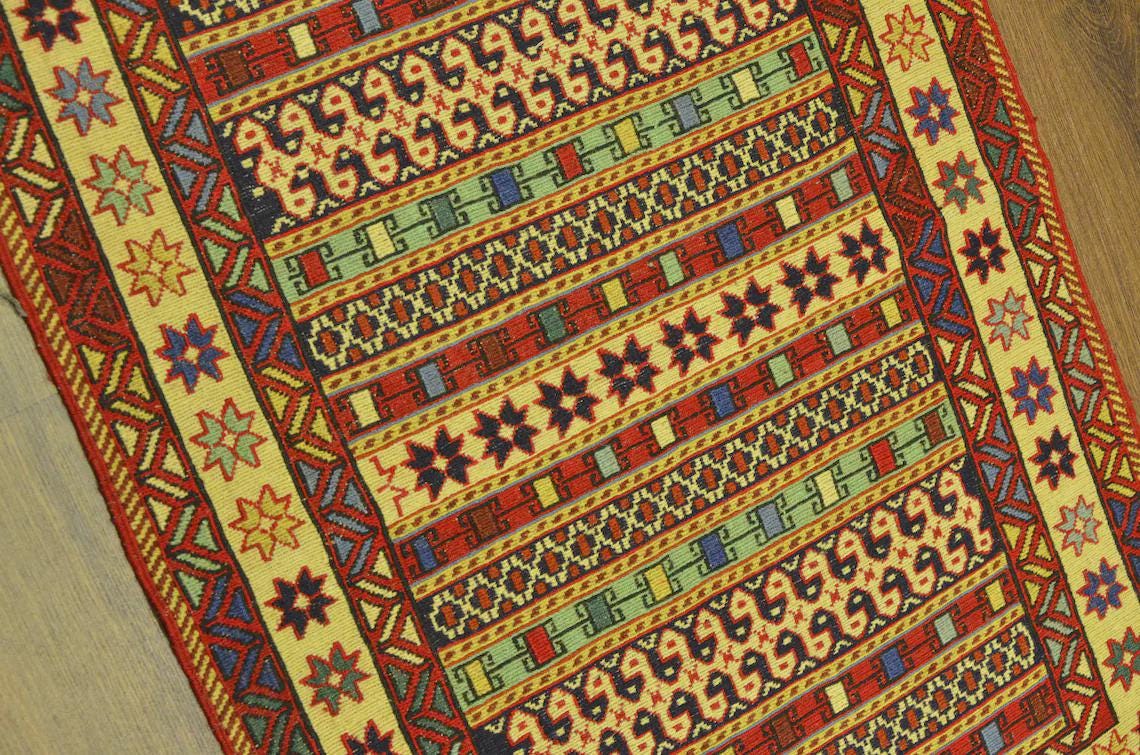 This eye-catching piece features traditional geometric tribal motifs arranged in vibrant horizontal bands, symbolizing protection, nature, and daily life in Kurdish culture. The rich red background combined with cream, blue, and green accents creates a warm and energetic bohemian aesthetic.
