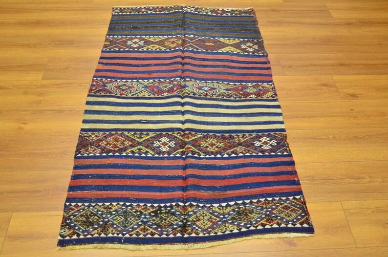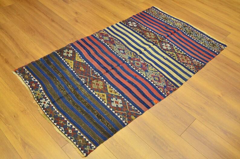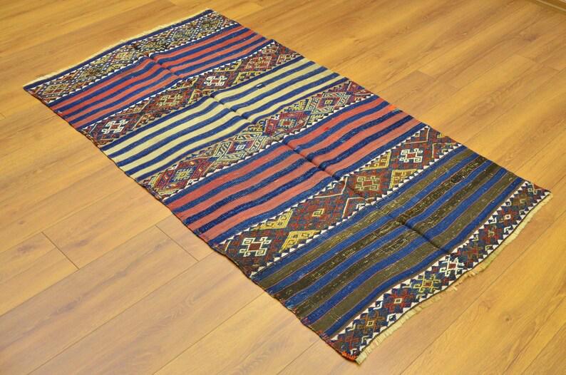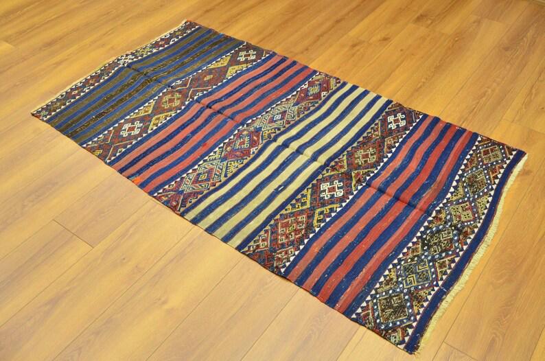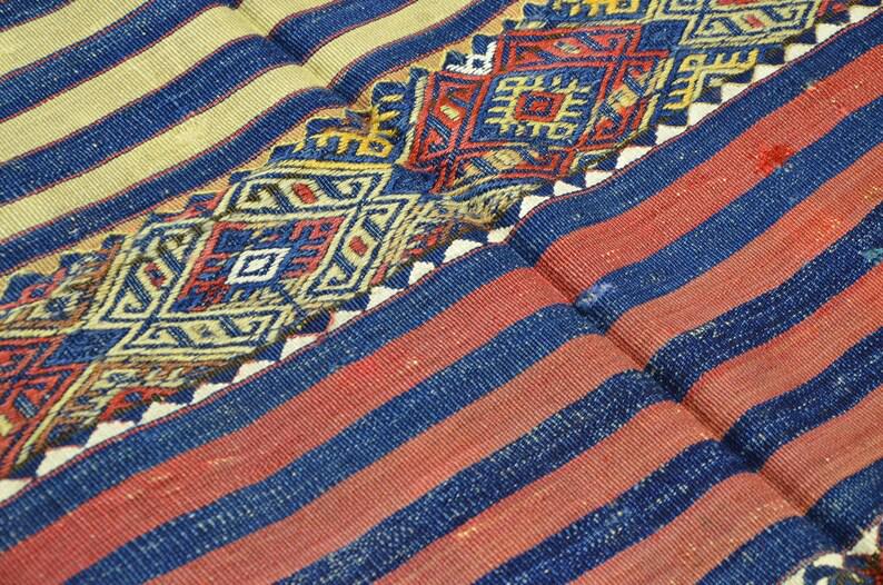 This beautiful flatweave rug reflects the artistry of traditional nomadic tribal weaving, featuring striking striped patterns combined with geometric motifs. The balanced design creates a unique visual rhythm that works perfectly in both modern and traditional interiors.