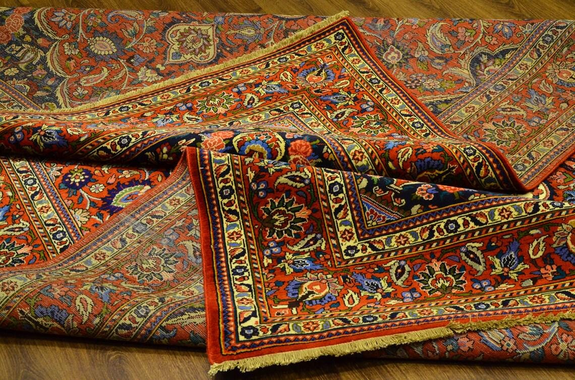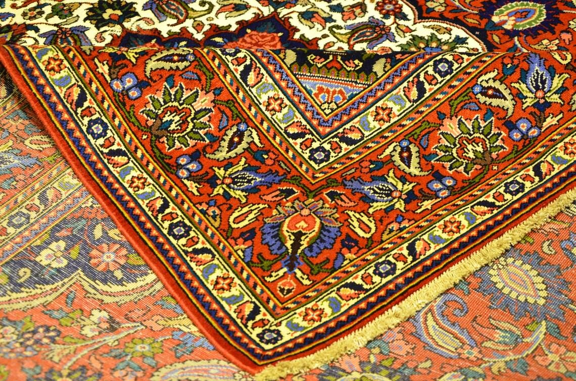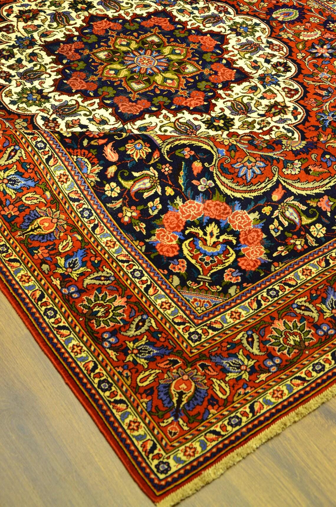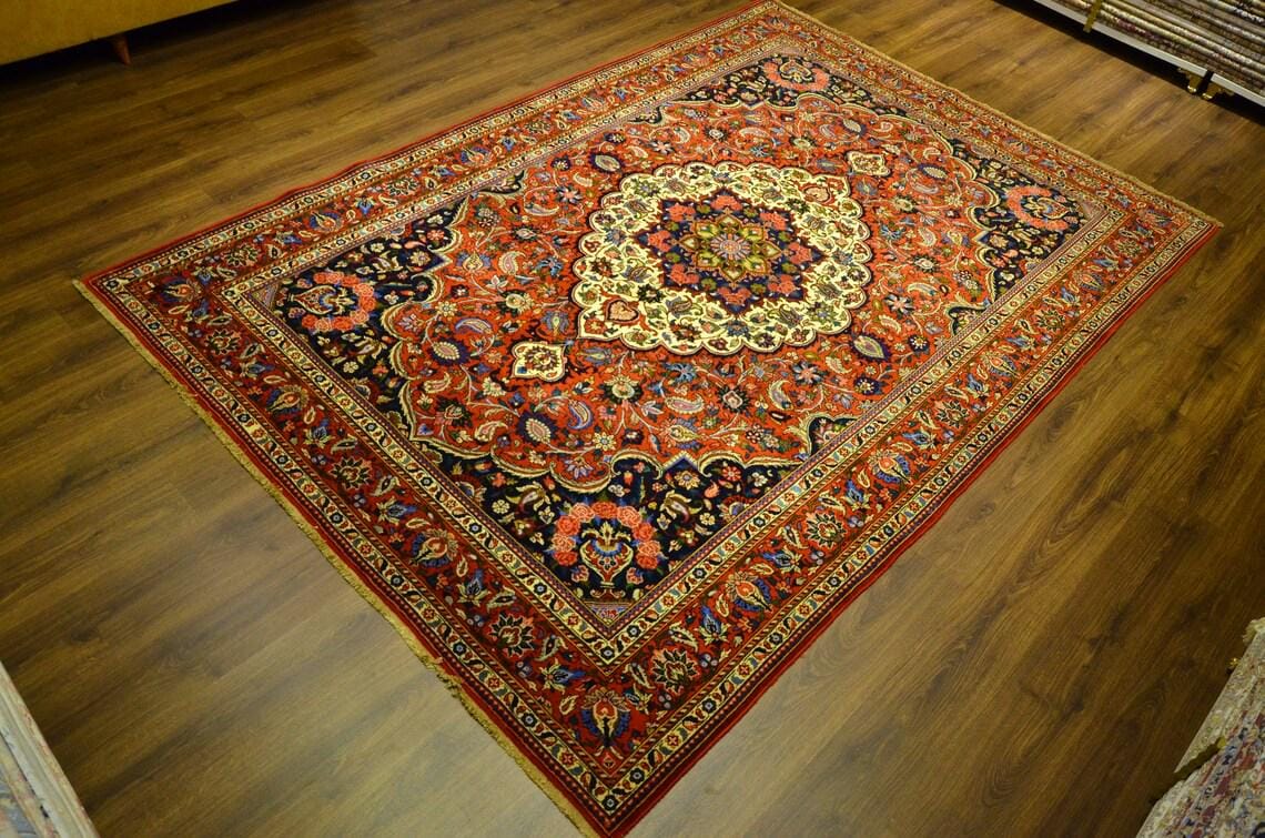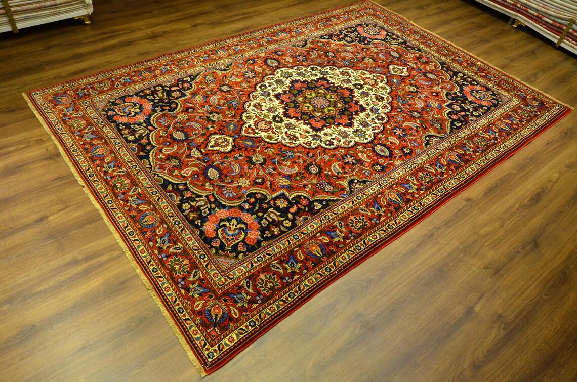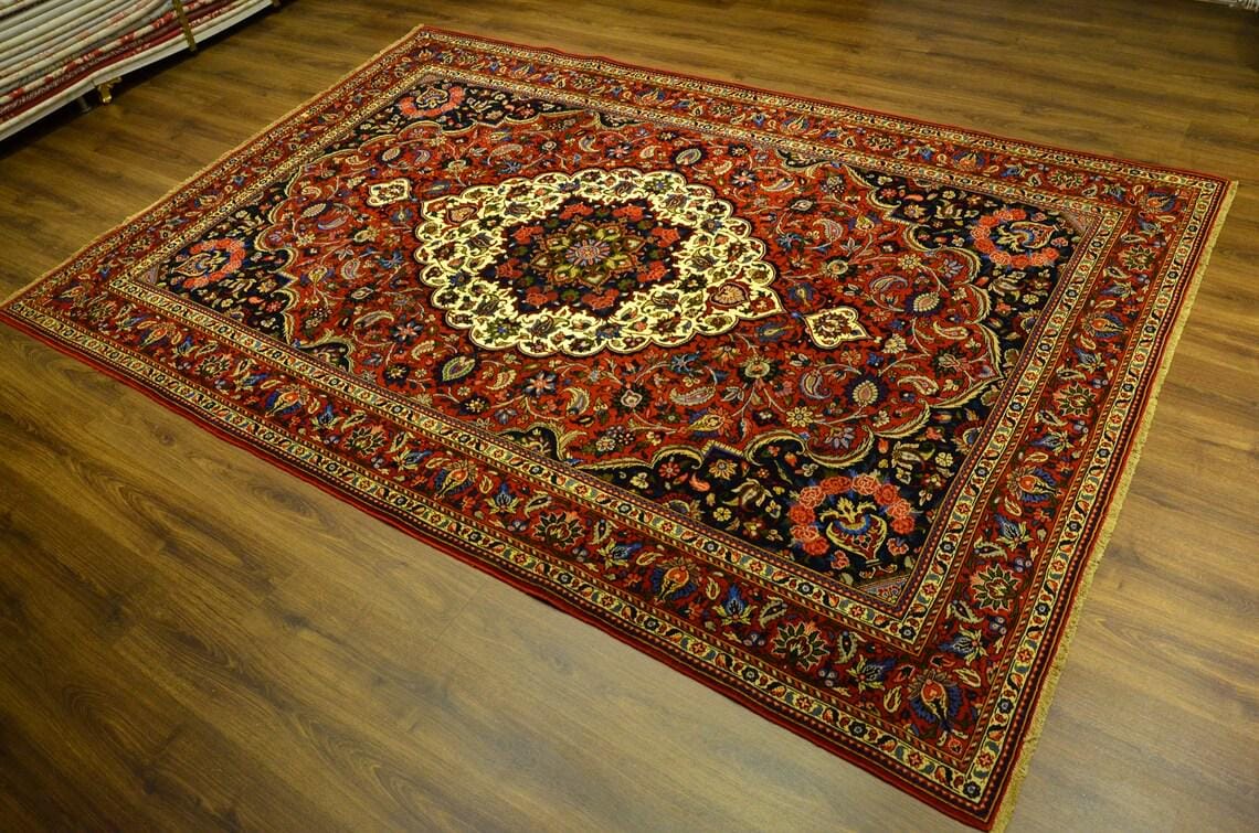 Featuring a striking central medallion and intricate floral motifs, the rug combines deep reds, navy blues, and ivory accents to create a warm and elegant atmosphere. Heriz rugs are especially valued for their durability and geometric strength, making them perfect for both classic and modern interiors.