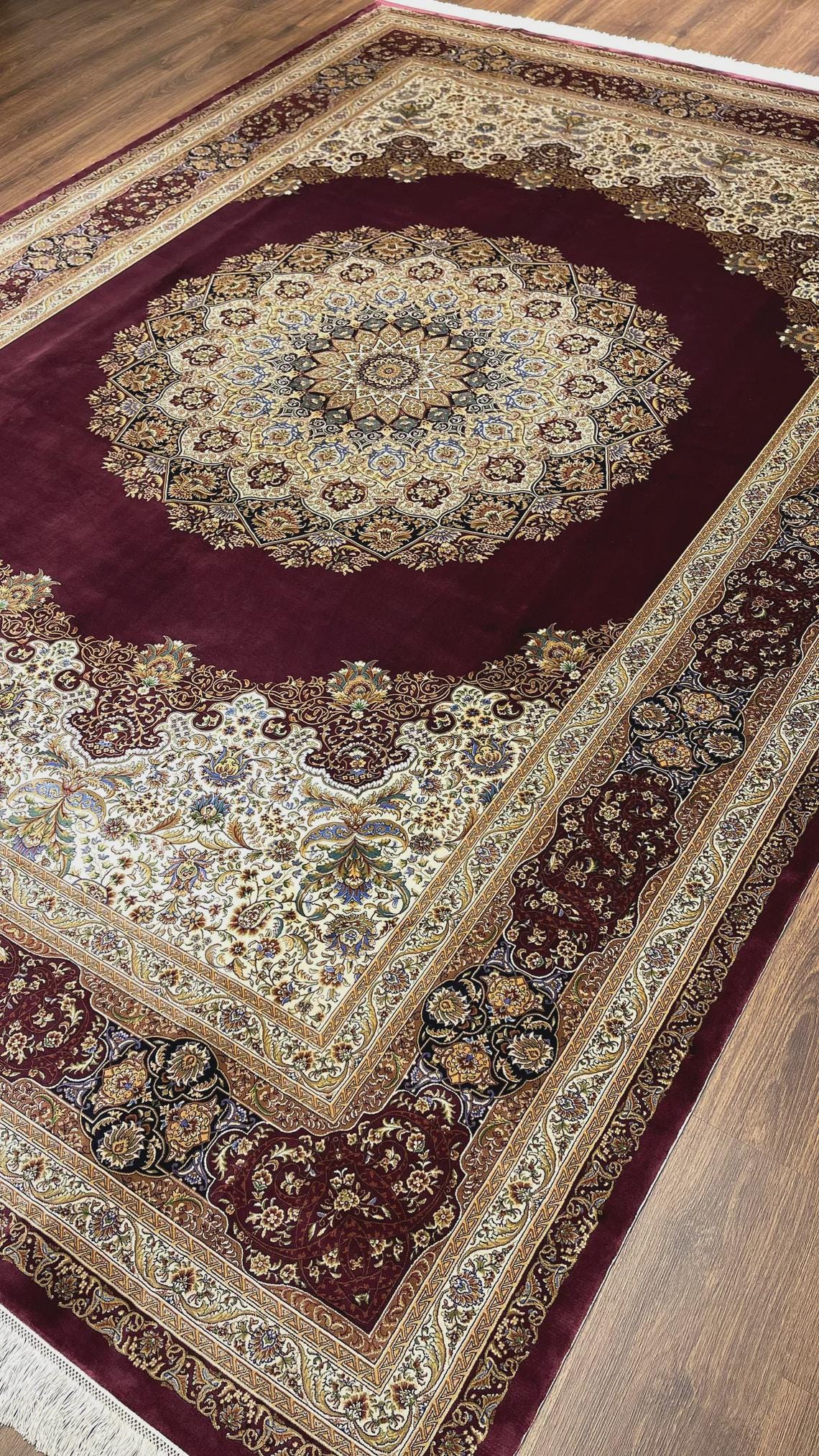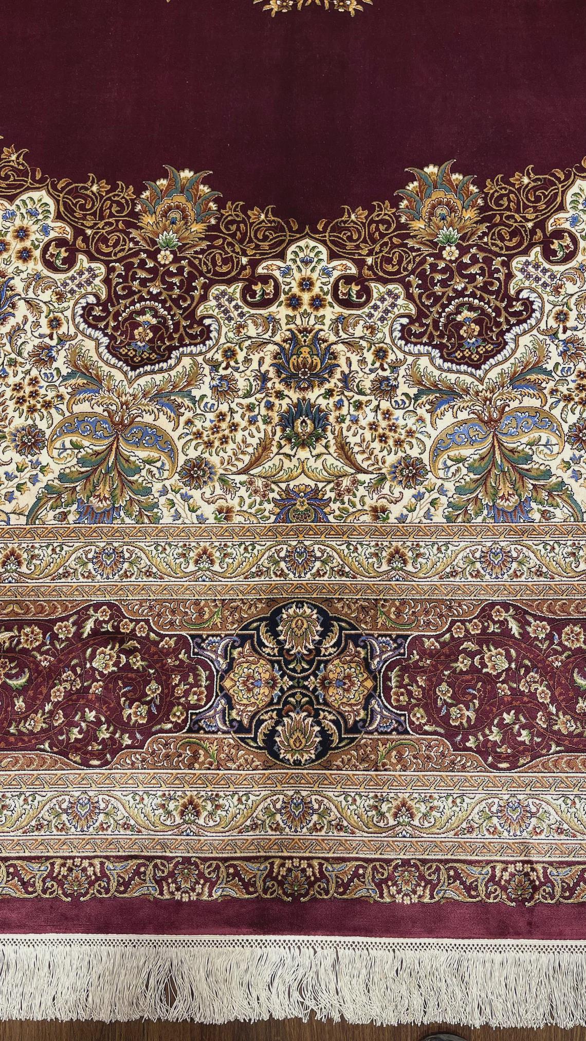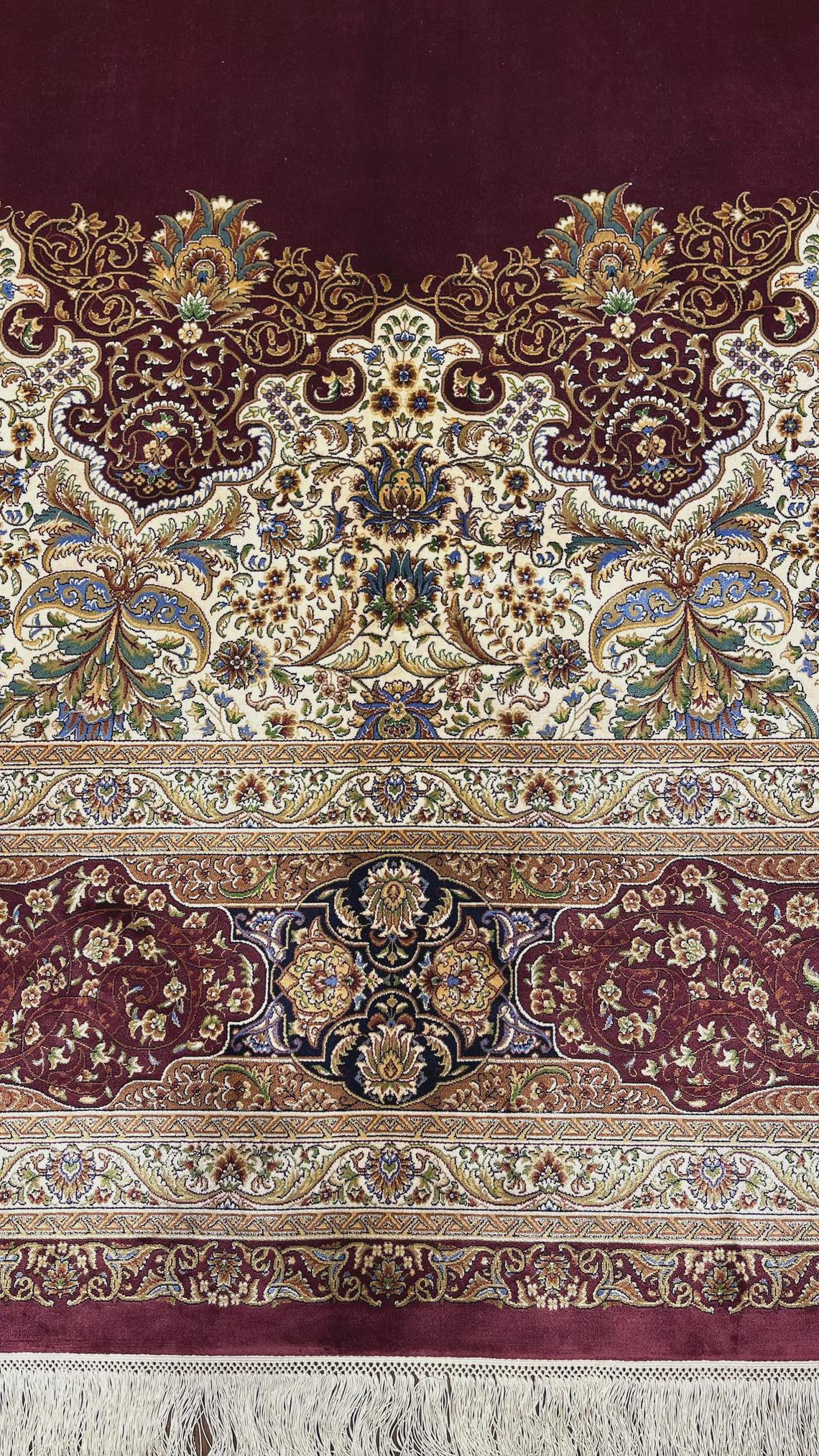 Expertly handwoven, the rug showcases fine silk craftsmanship with detailed floral motifs and elegant border patterns. The deep burgundy tones combined with ivory and gold accents create a warm, refined atmosphere, making it a perfect centerpiece for any interior.