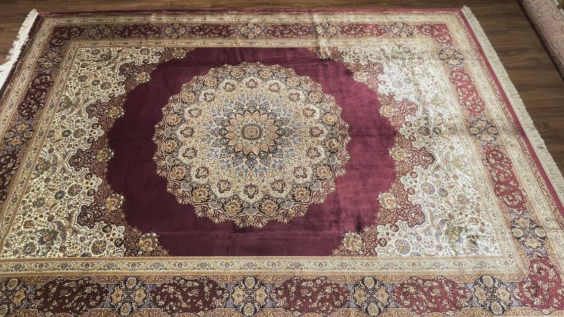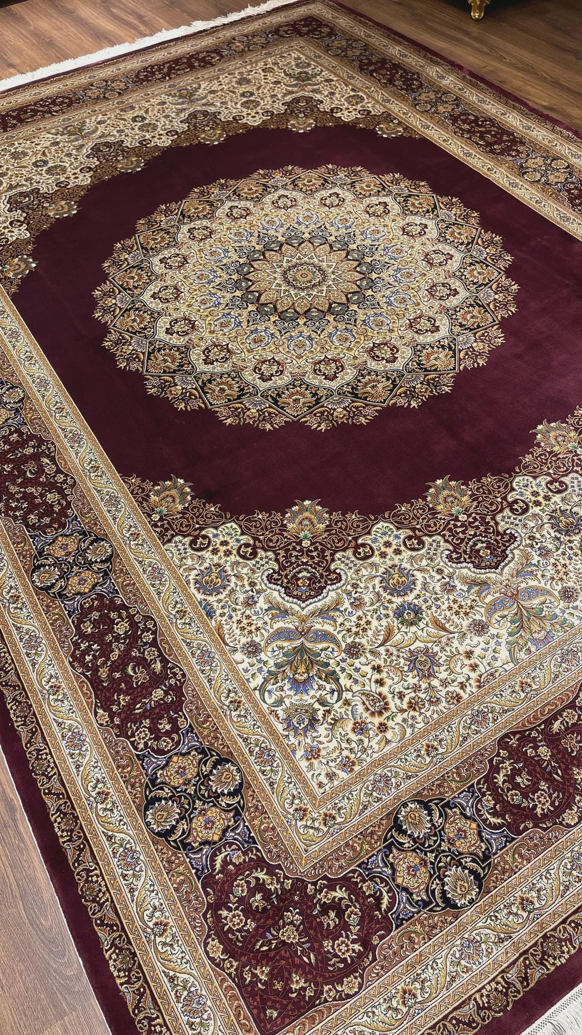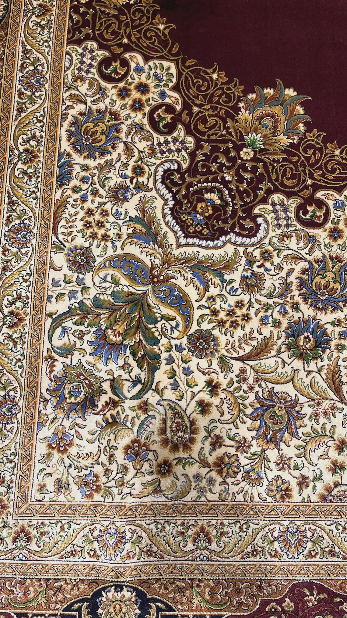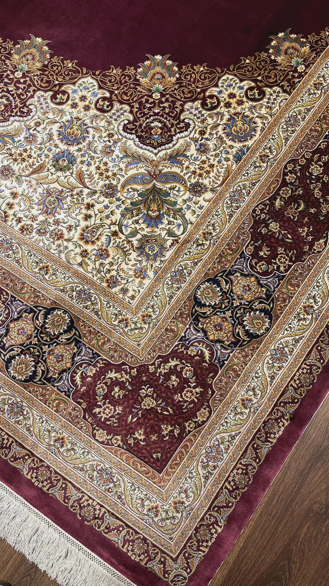 Expertly handwoven, the rug showcases fine silk craftsmanship with detailed floral motifs and elegant border patterns. The deep burgundy tones combined with ivory and gold accents create a warm, refined atmosphere, making it a perfect centerpiece for any interior.