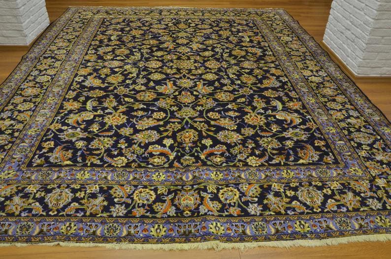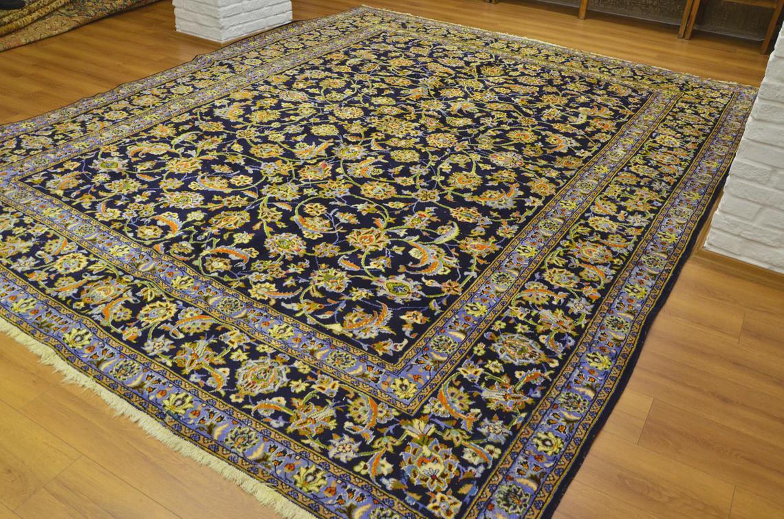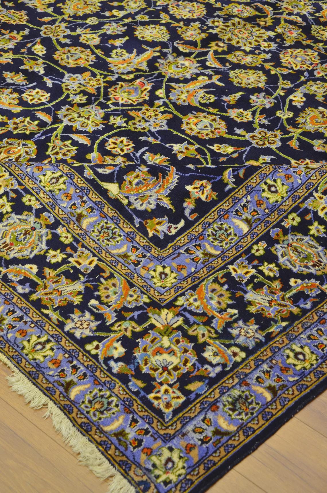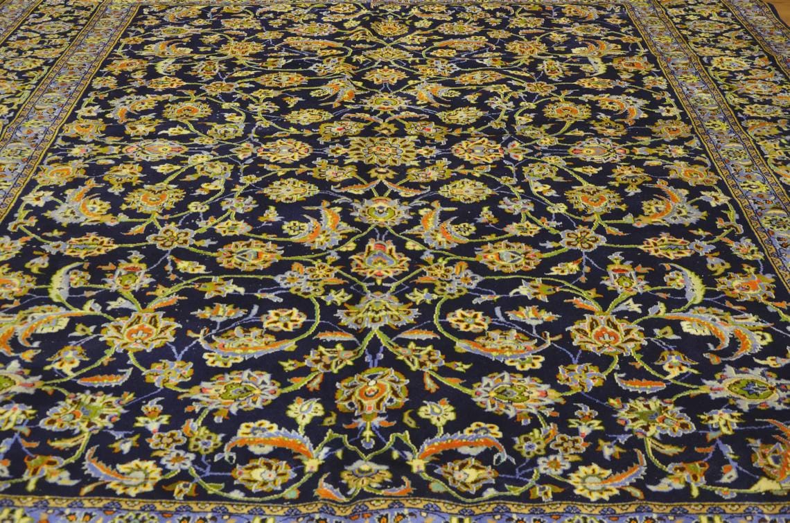This oversized Turkish wool rug showcases a deep navy background enriched with intricate floral motifs and elegant color accents. Handwoven using high-quality wool, it offers exceptional durability along with timeless aesthetic appeal.