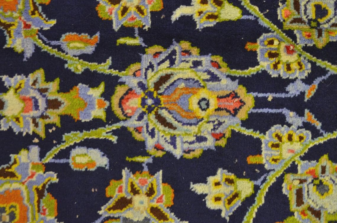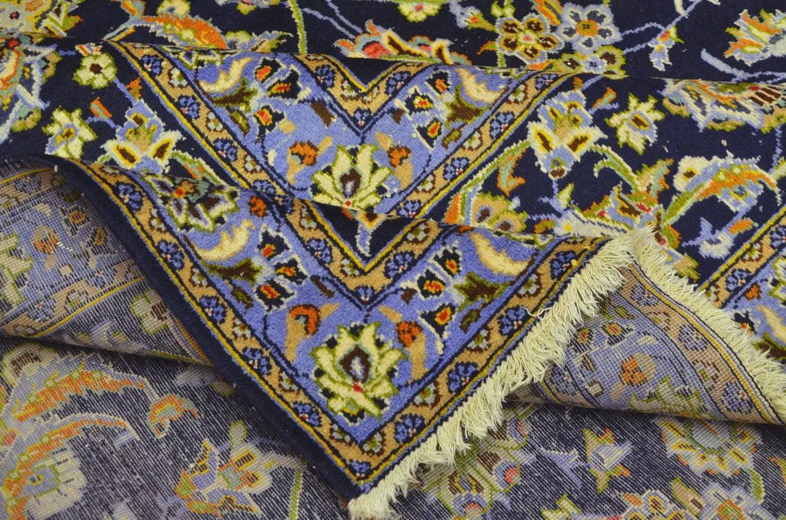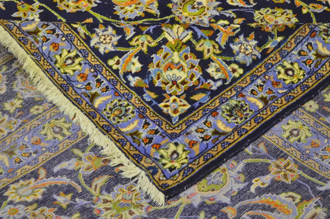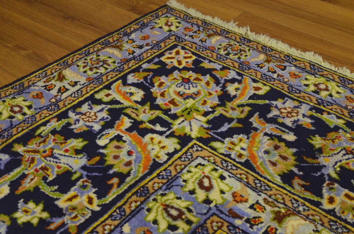 This oversized Turkish wool rug showcases a deep navy background enriched with intricate floral motifs and elegant color accents. Handwoven using high-quality wool, it offers exceptional durability along with timeless aesthetic appeal.