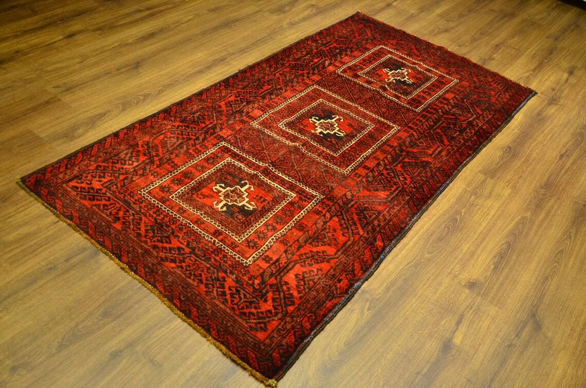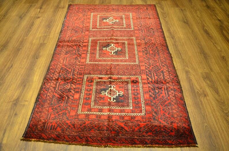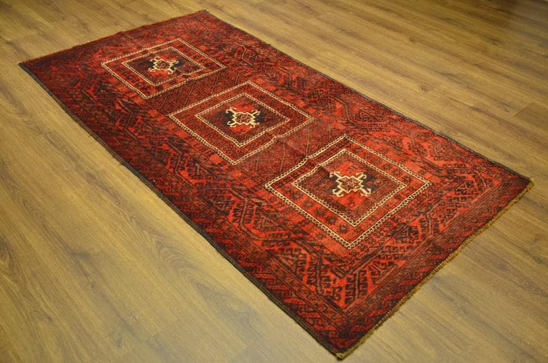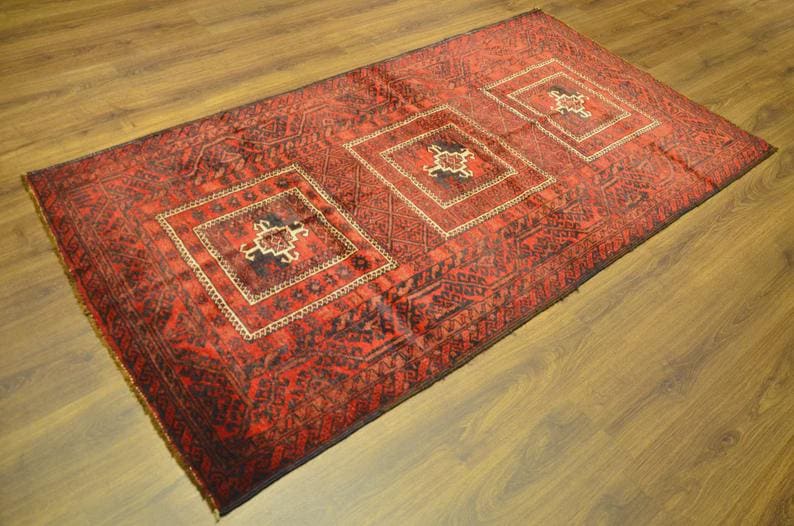 This vintage Turkish rug showcases a bold tribal design with three striking geometric medallions set against a rich red field. The deep black motifs and intricate border patterns highlight the authenticity of traditional Anatolian craftsmanship.