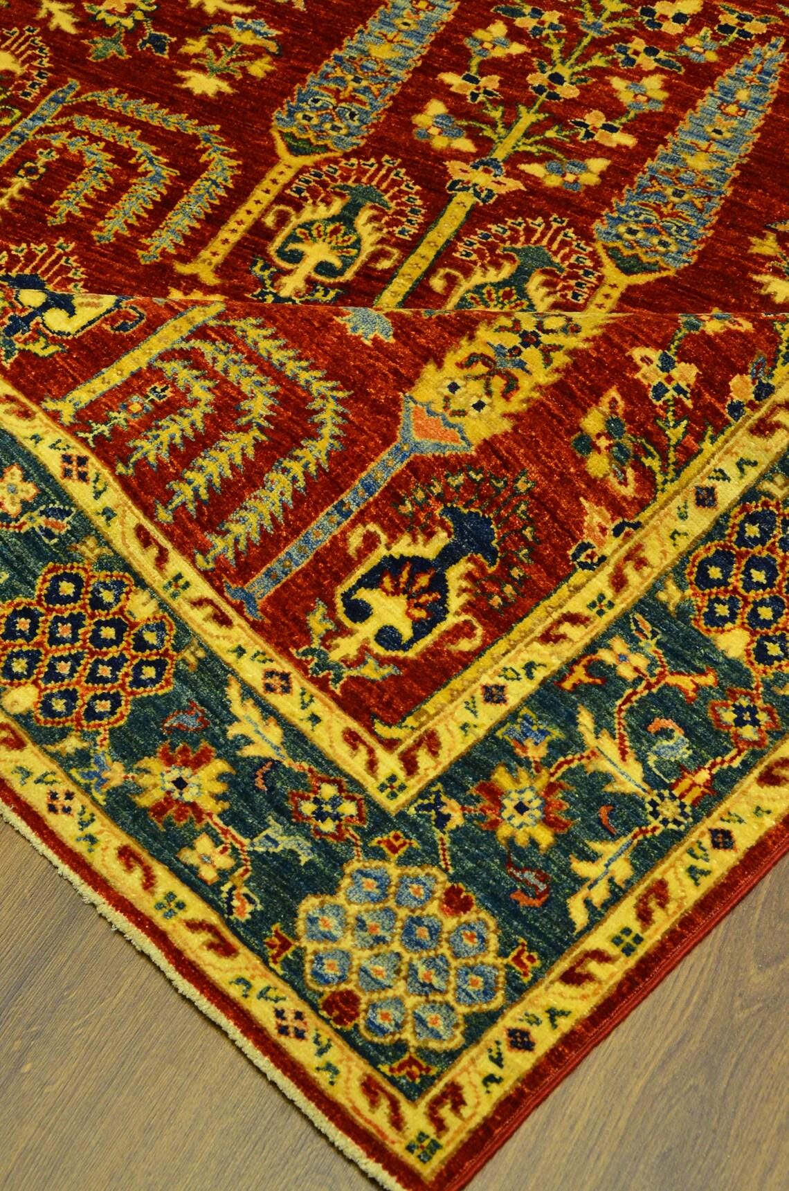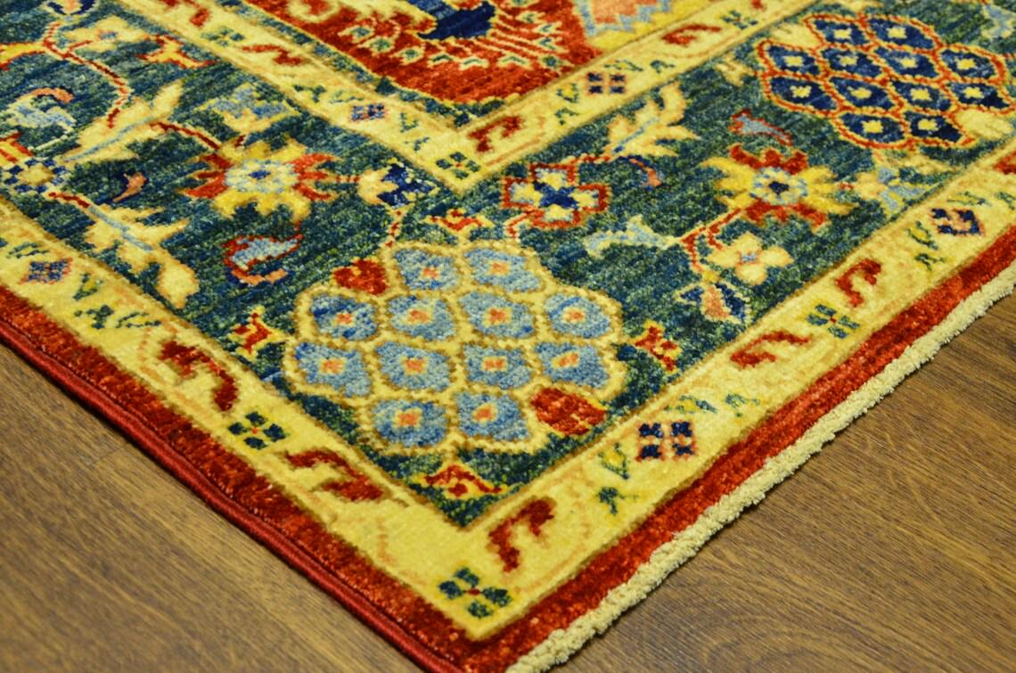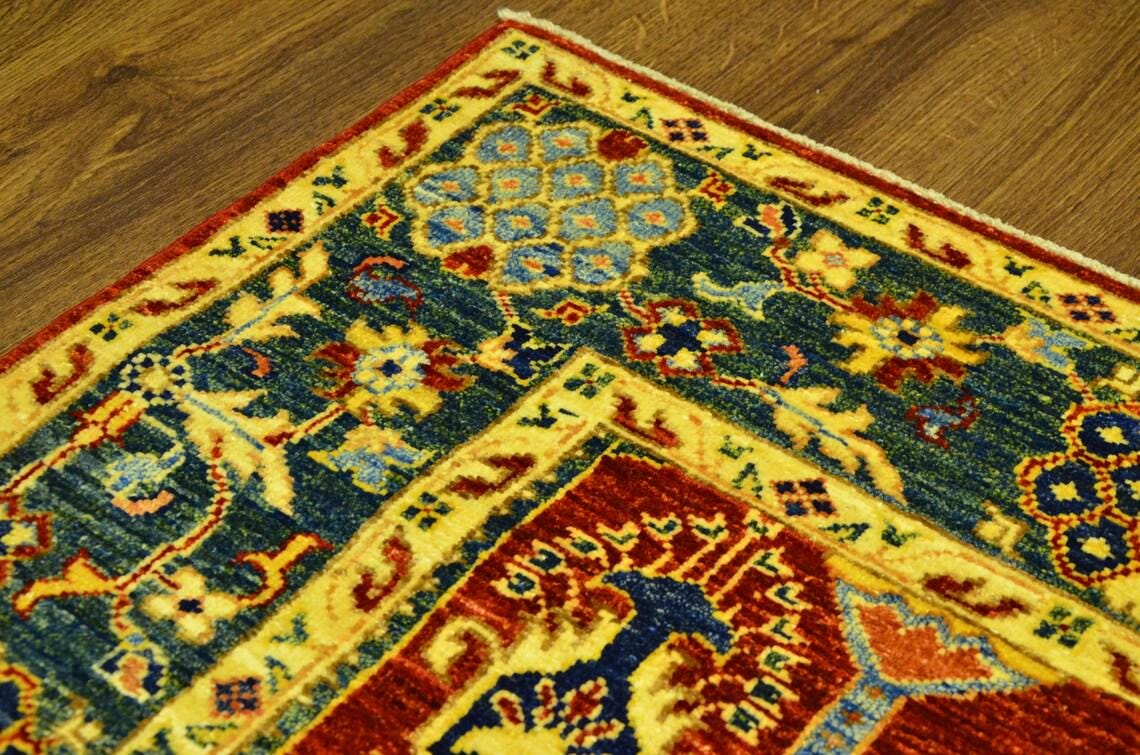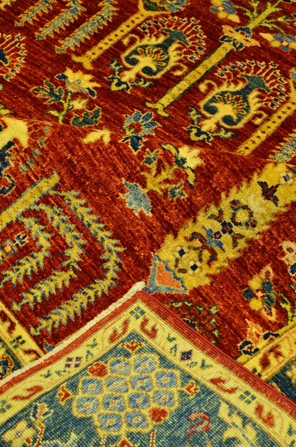 Hand-knotted from high-quality wool, this rug offers both durability and a soft, luxurious texture. The harmonious blend of red, blue, and golden accents makes it a versatile statement piece for classic, bohemian, or modern interiors.