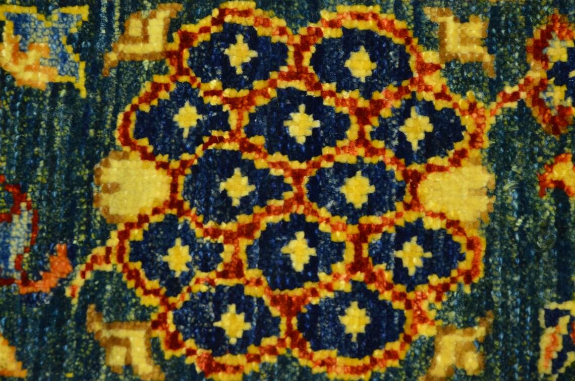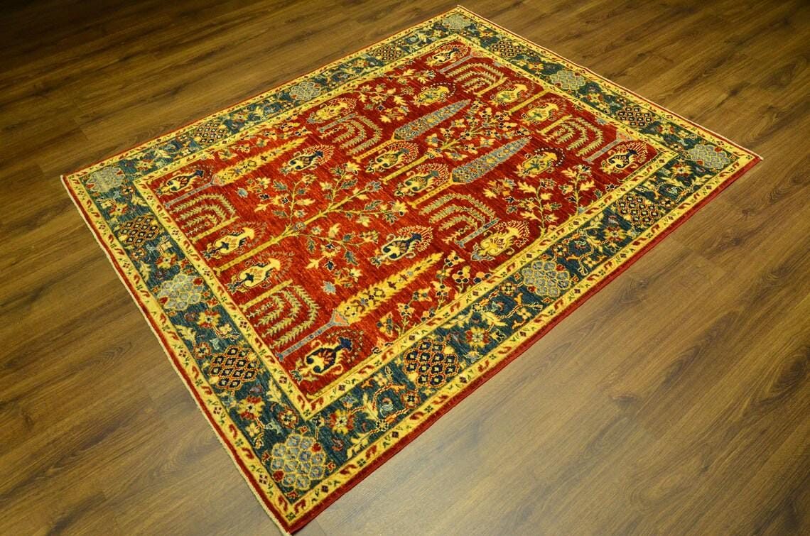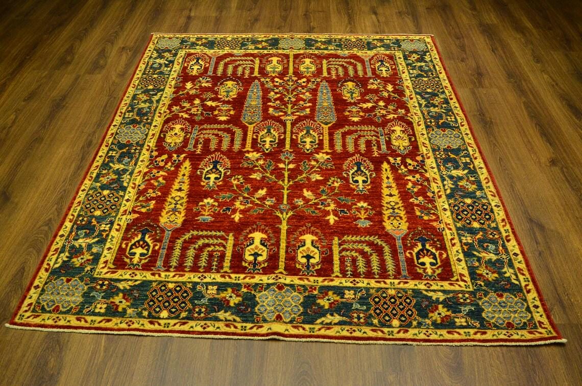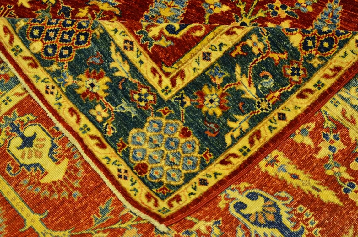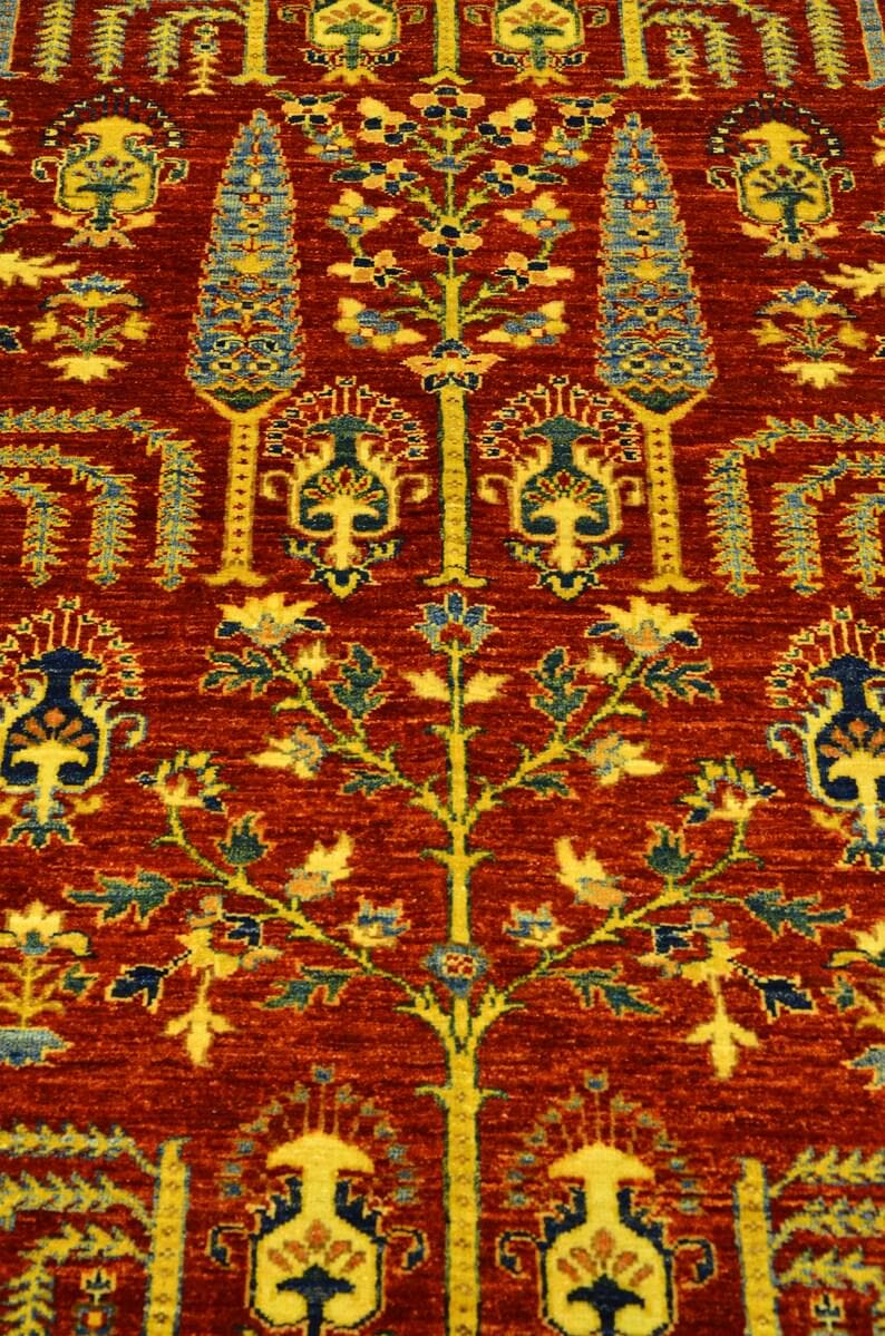 Hand-knotted from high-quality wool, this rug offers both durability and a soft, luxurious texture. The harmonious blend of red, blue, and golden accents makes it a versatile statement piece for classic, bohemian, or modern interiors.