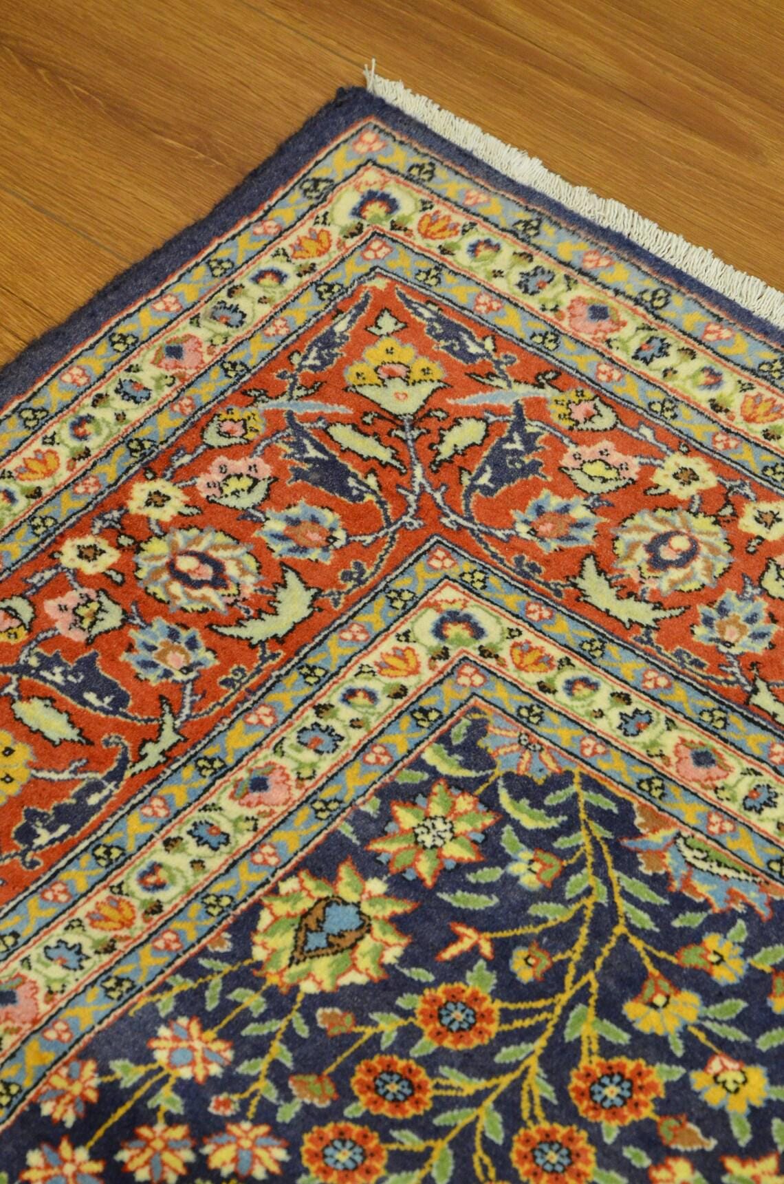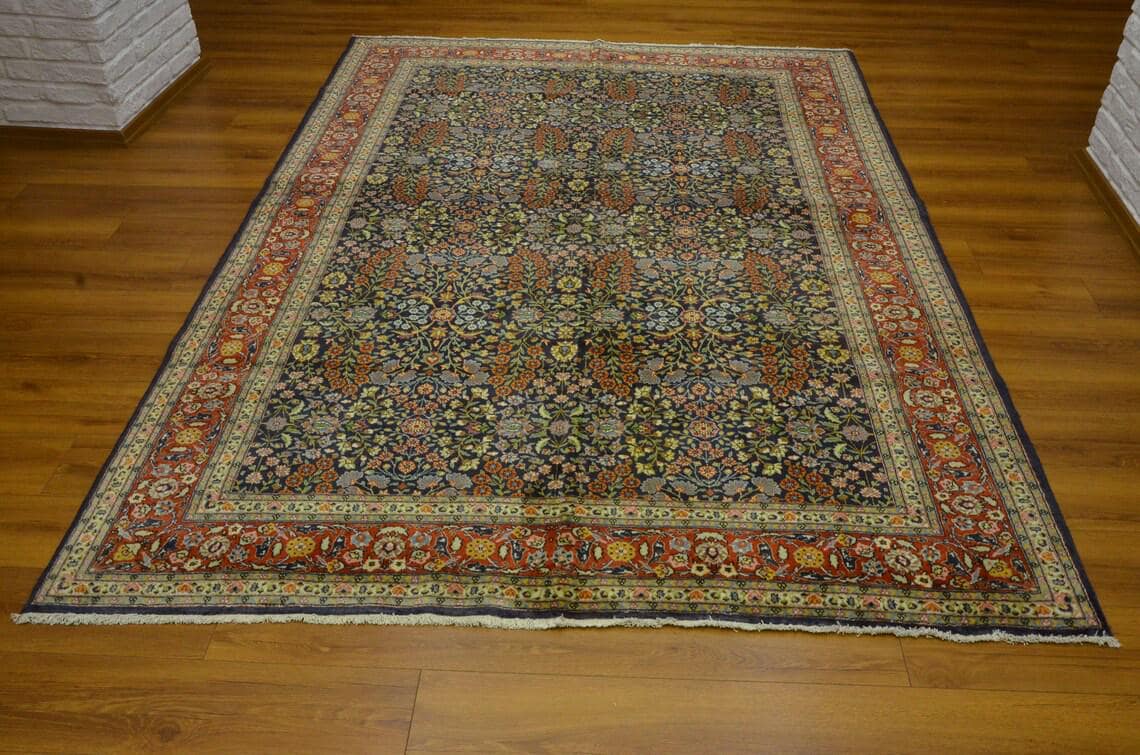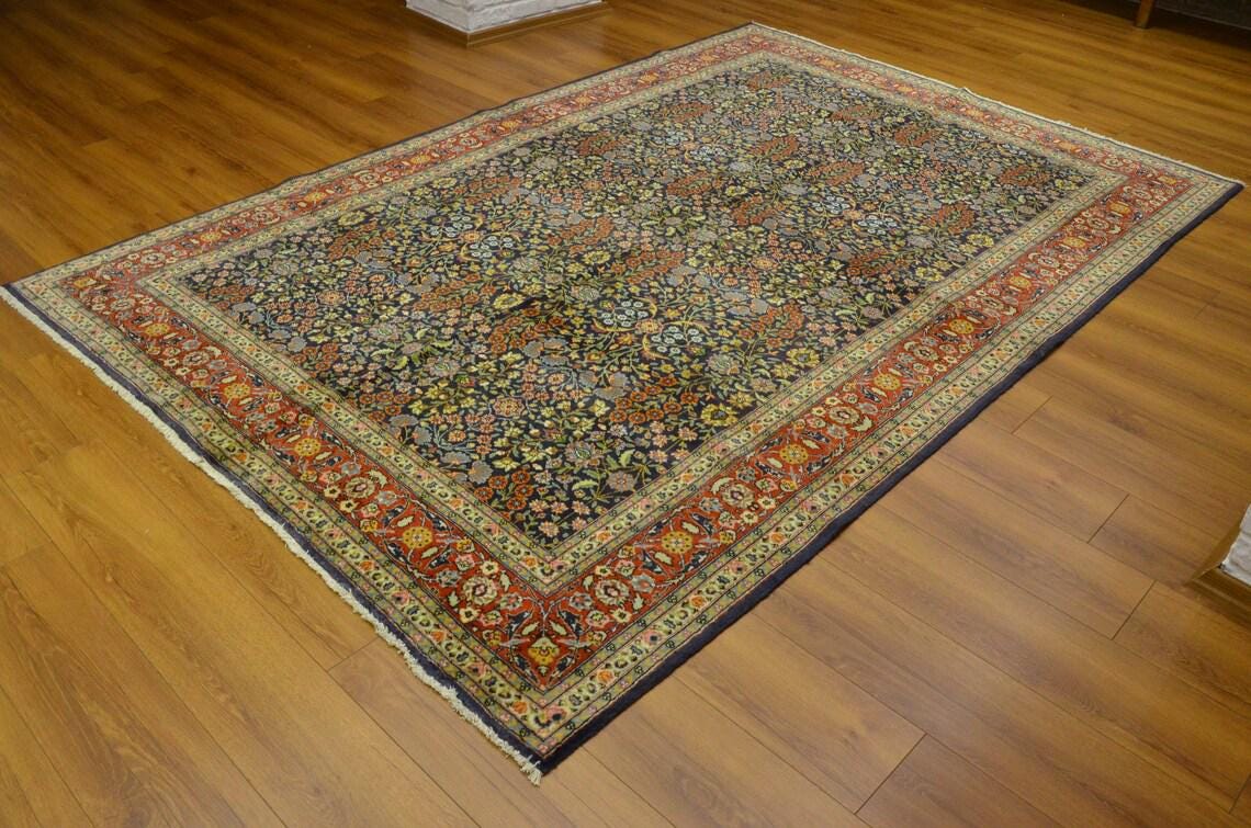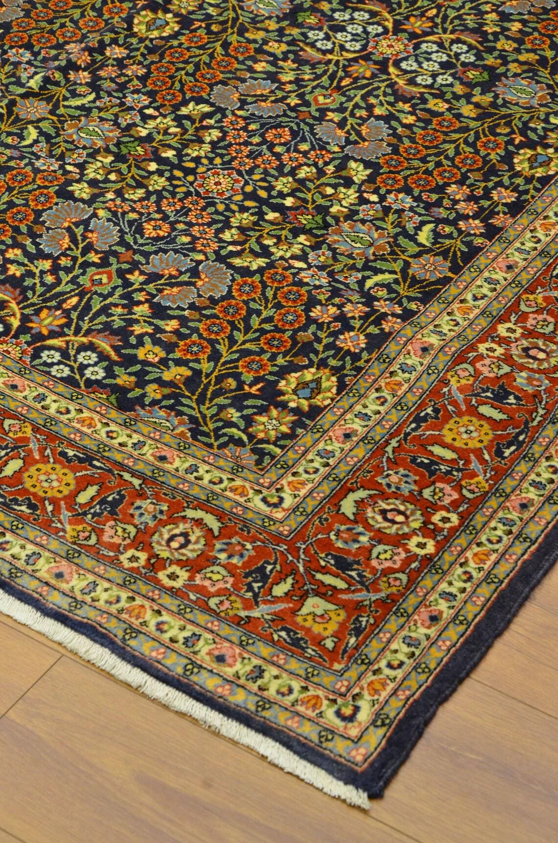 • Type: Vintage Turkish Hereke Rug • Technique: Hand-Knotted • Material: Wool • Design: Floral / Botanical / Classic Hereke • Colors: Navy Blue, Red, Ivory, Gold, Light Blue • Origin: Turkey • Condition: Very Good Vintage Condition