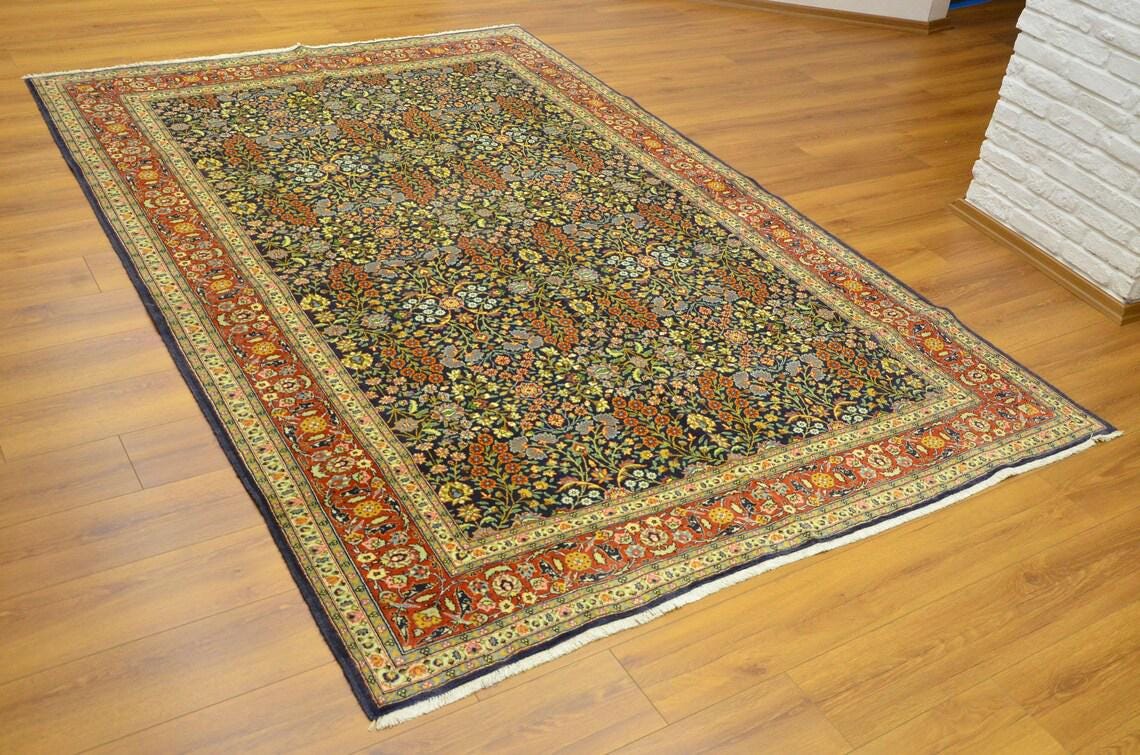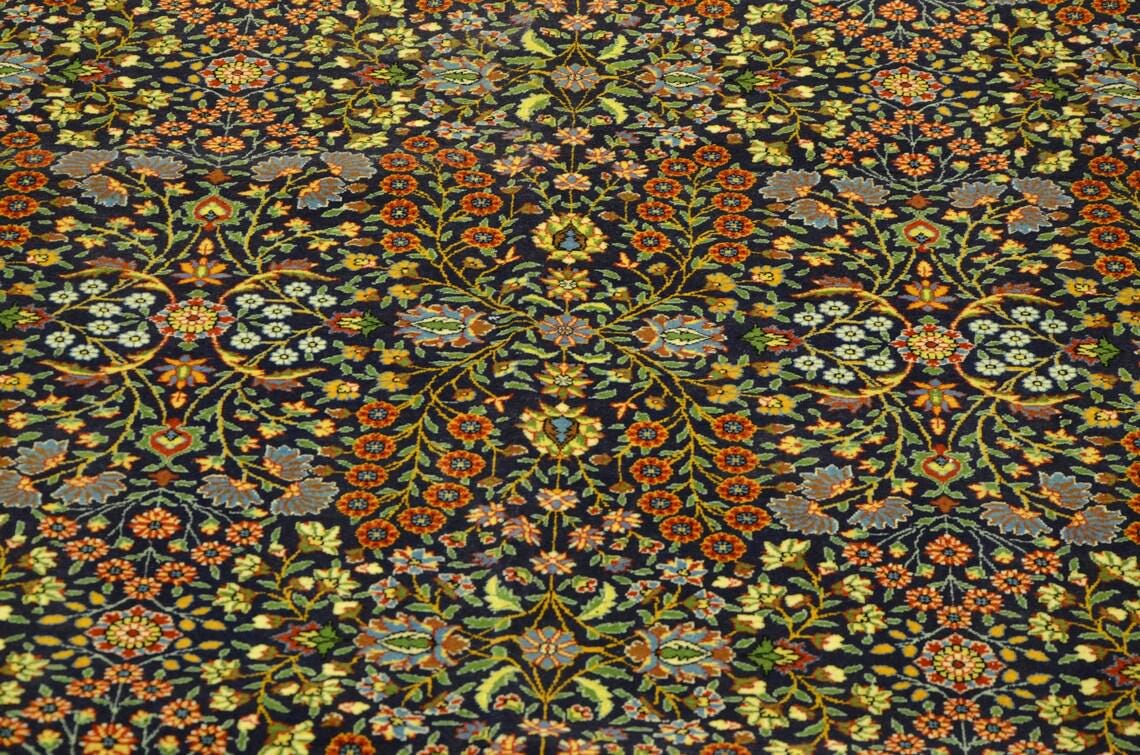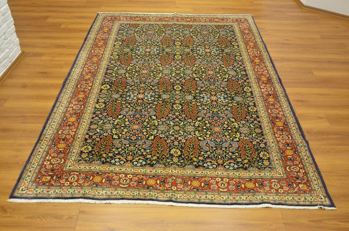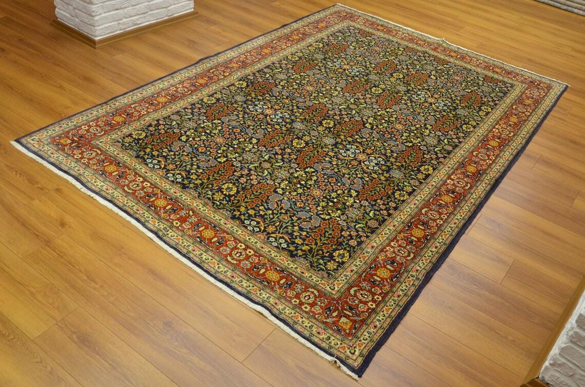 • Type: Vintage Turkish Hereke Rug • Technique: Hand-Knotted • Material: Wool • Design: Floral / Botanical / Classic Hereke • Colors: Navy Blue, Red, Ivory, Gold, Light Blue • Origin: Turkey • Condition: Very Good Vintage Condition