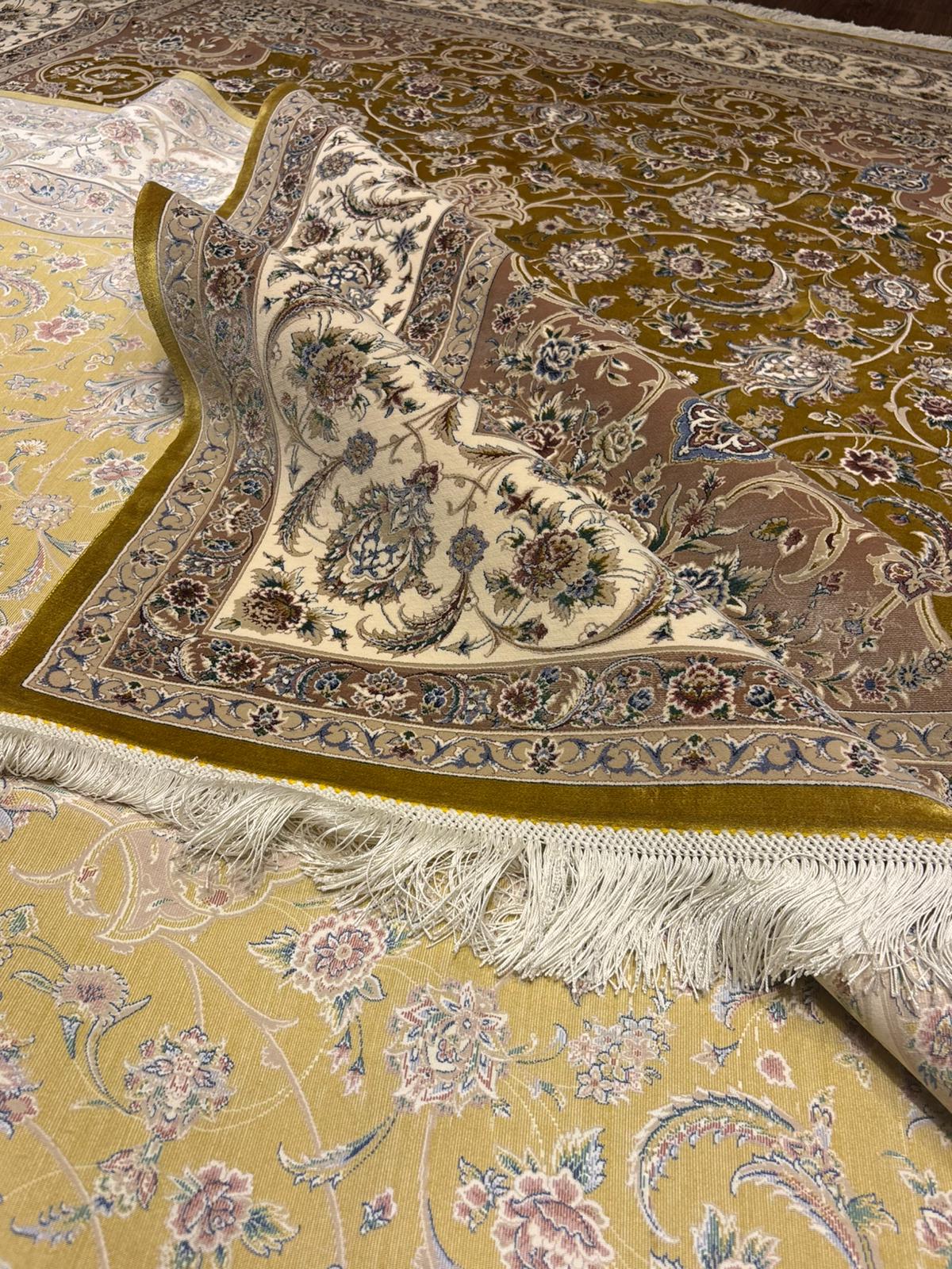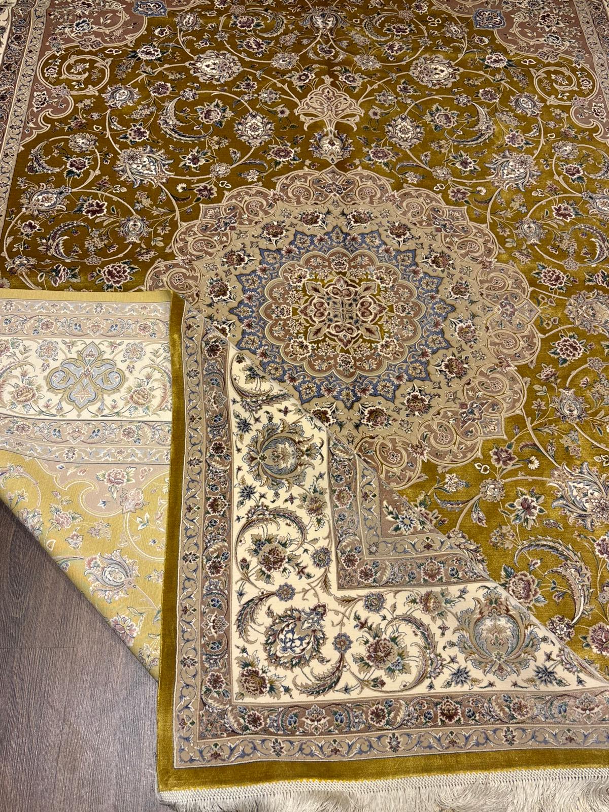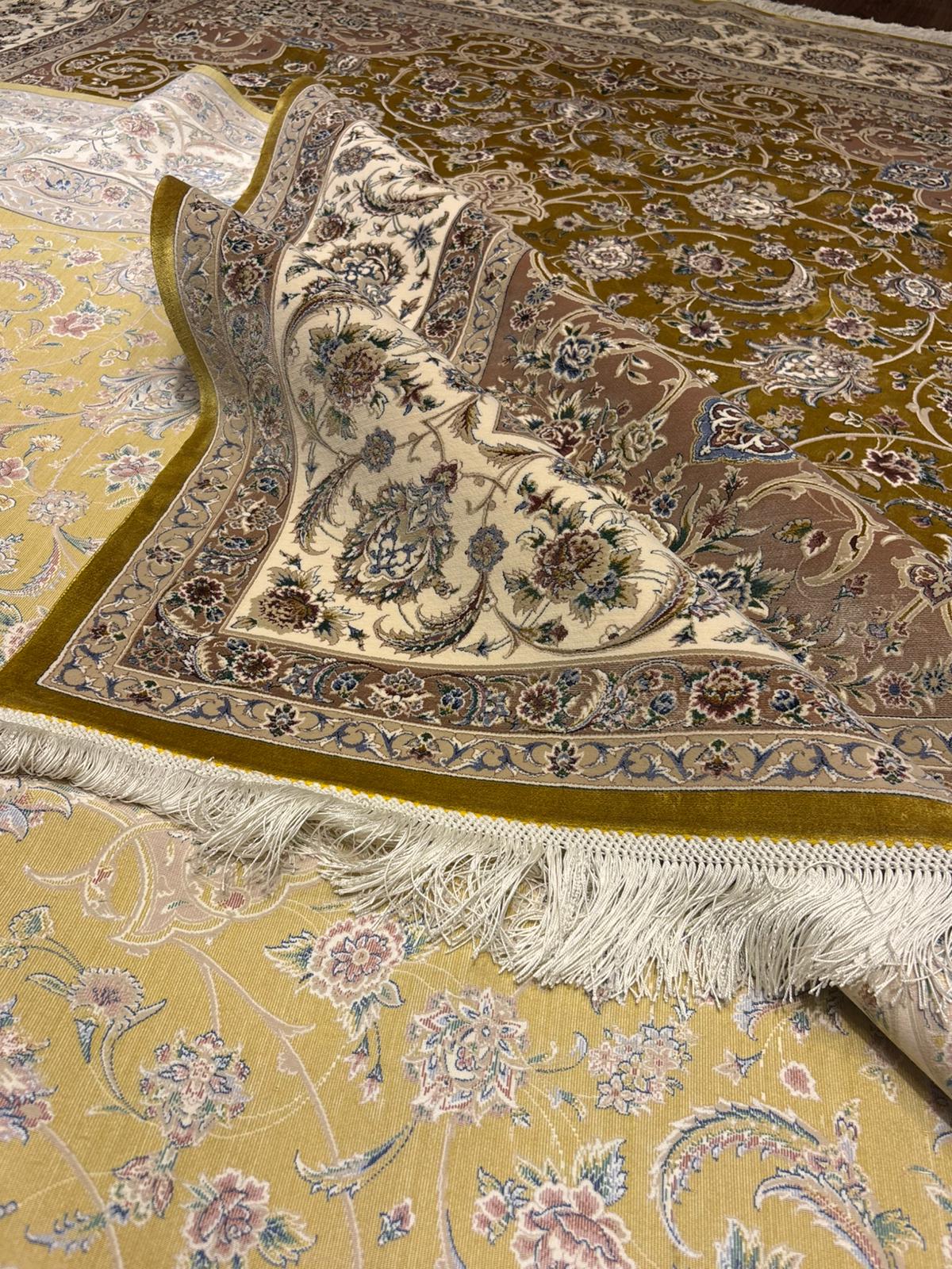 This handmade silk and wool rug is a luxurious statement piece designed to elevate any interior with elegance and warmth. Featuring a rich gold-toned background combined with an intricate floral medallion design, this rug reflects timeless craftsmanship and refined taste.