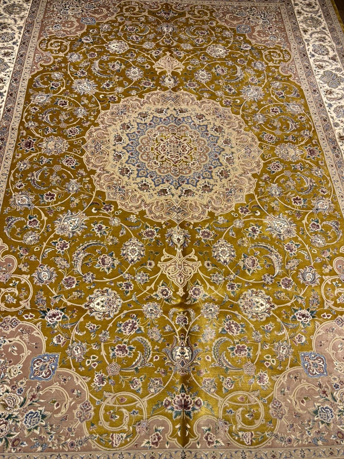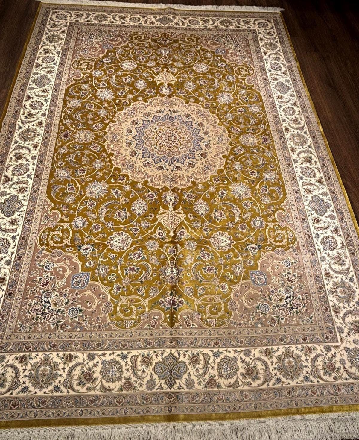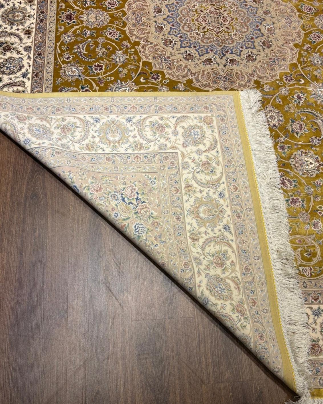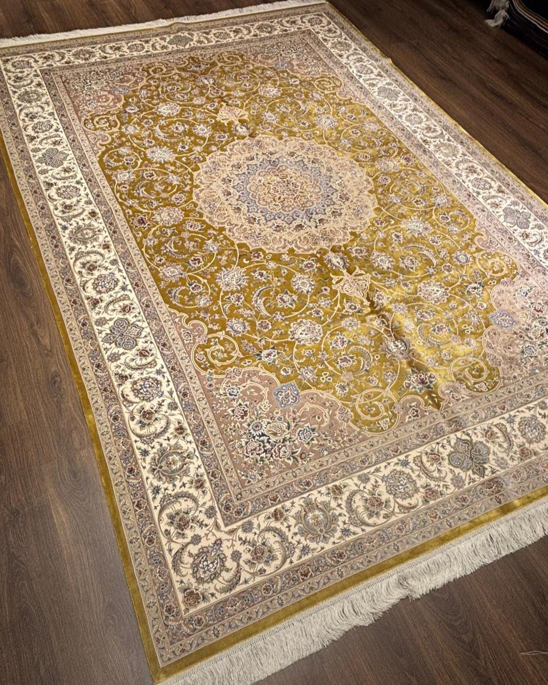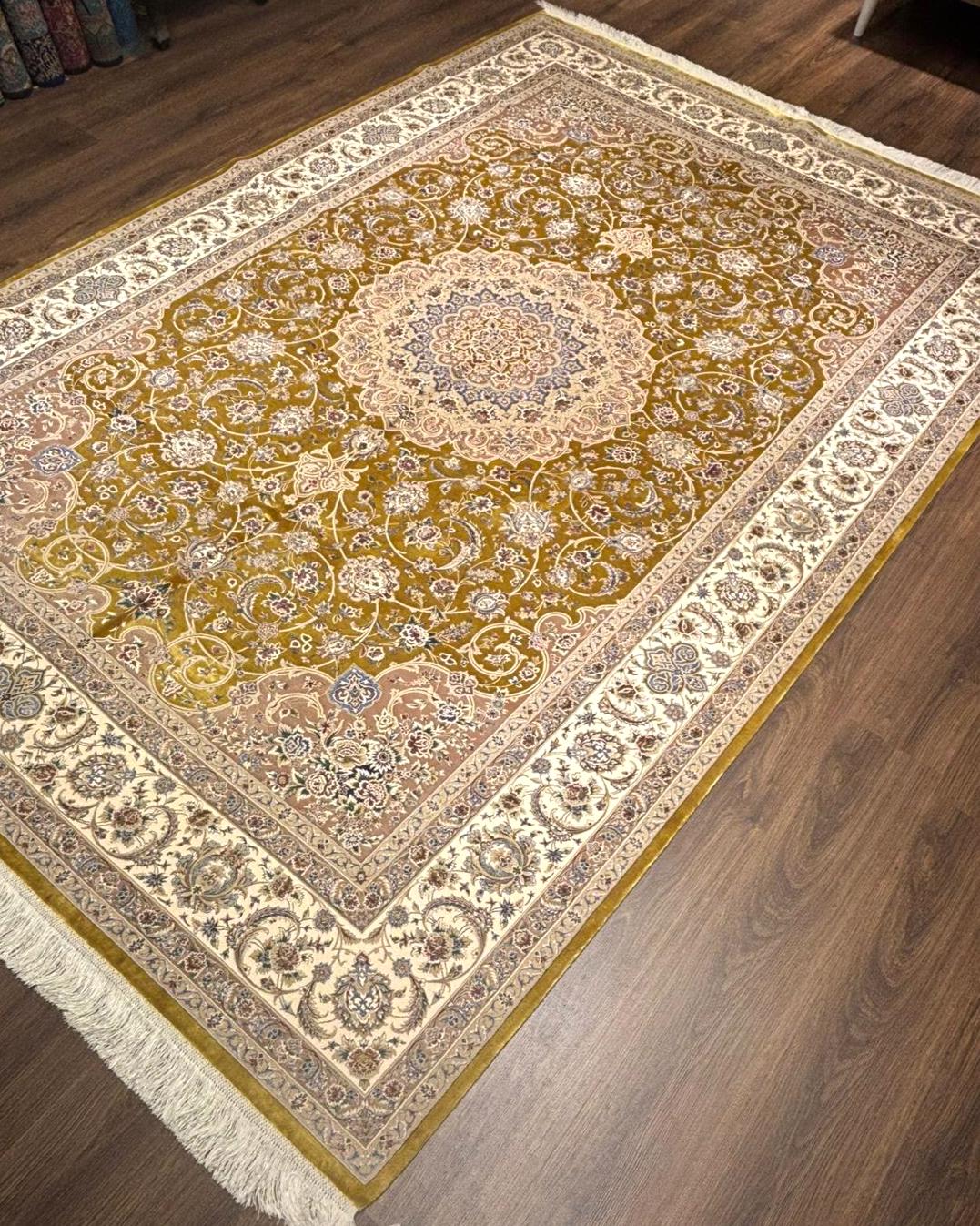 * Silk and wool blend * Handmade craftsmanship * Central medallion design * Detailed floral patterns * Soft texture with durable structure * Warm gold and beige color palette * Fine high-density weaving