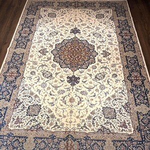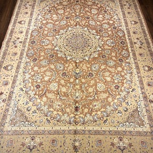 * Silk and wool blend * Handmade craftsmanship * Central medallion design * Detailed floral patterns * Soft texture with durable structure * Warm gold and beige color palette * Fine high-density weaving