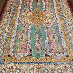 Expertly woven using a blend of fine silk and high-quality wool, it offers both durability and a soft, smooth texture. The silk accents create a subtle natural shine, enhancing the depth and detail of the floral patterns and central medallion.