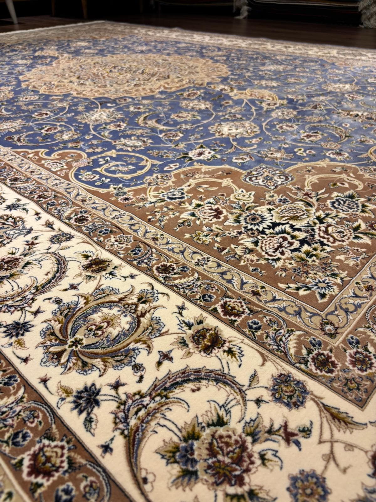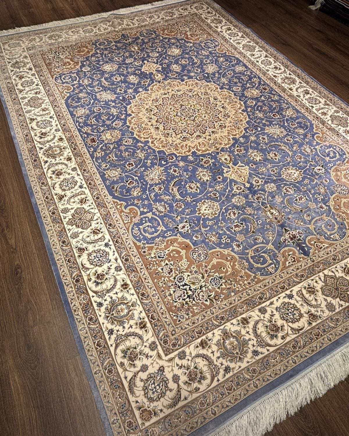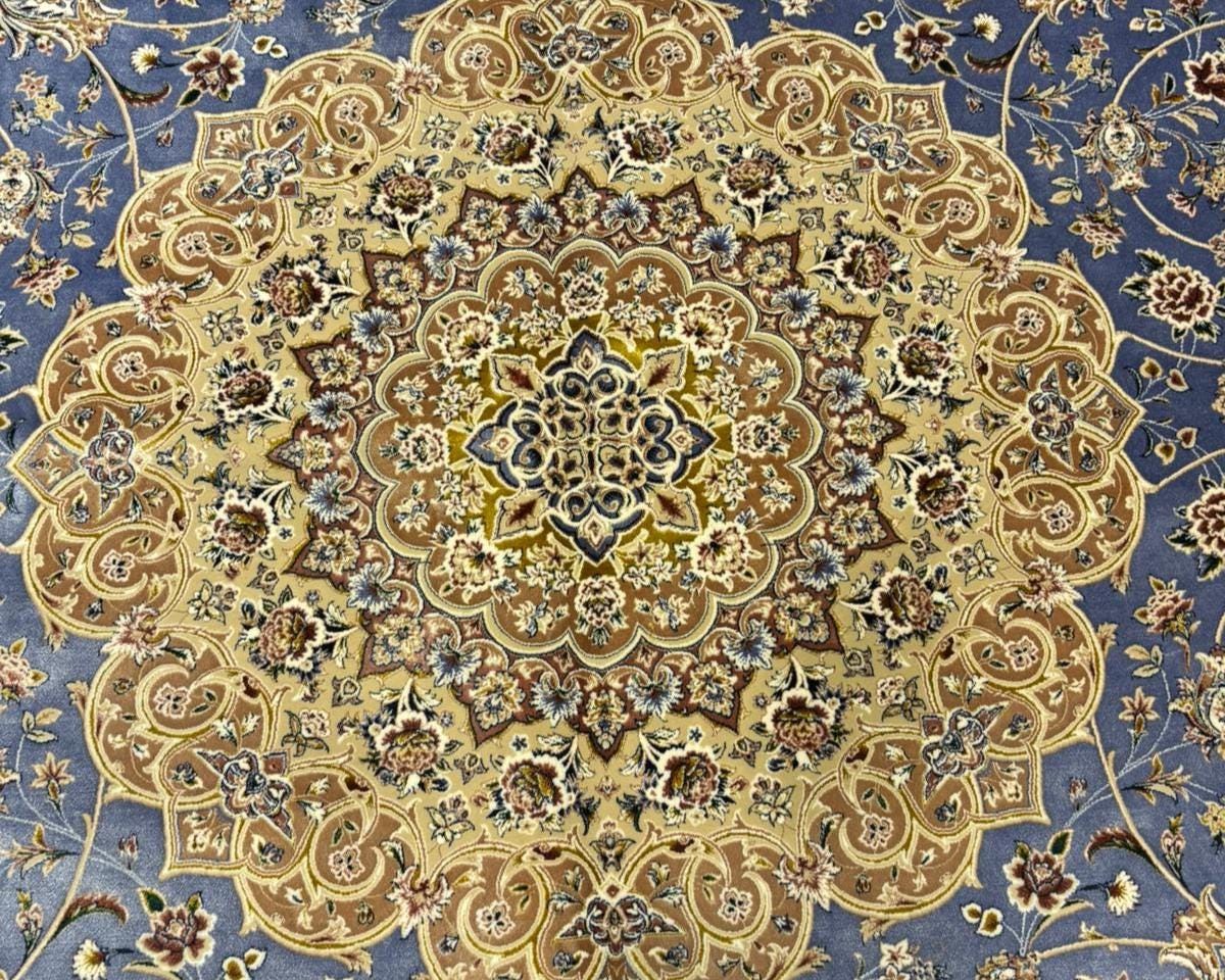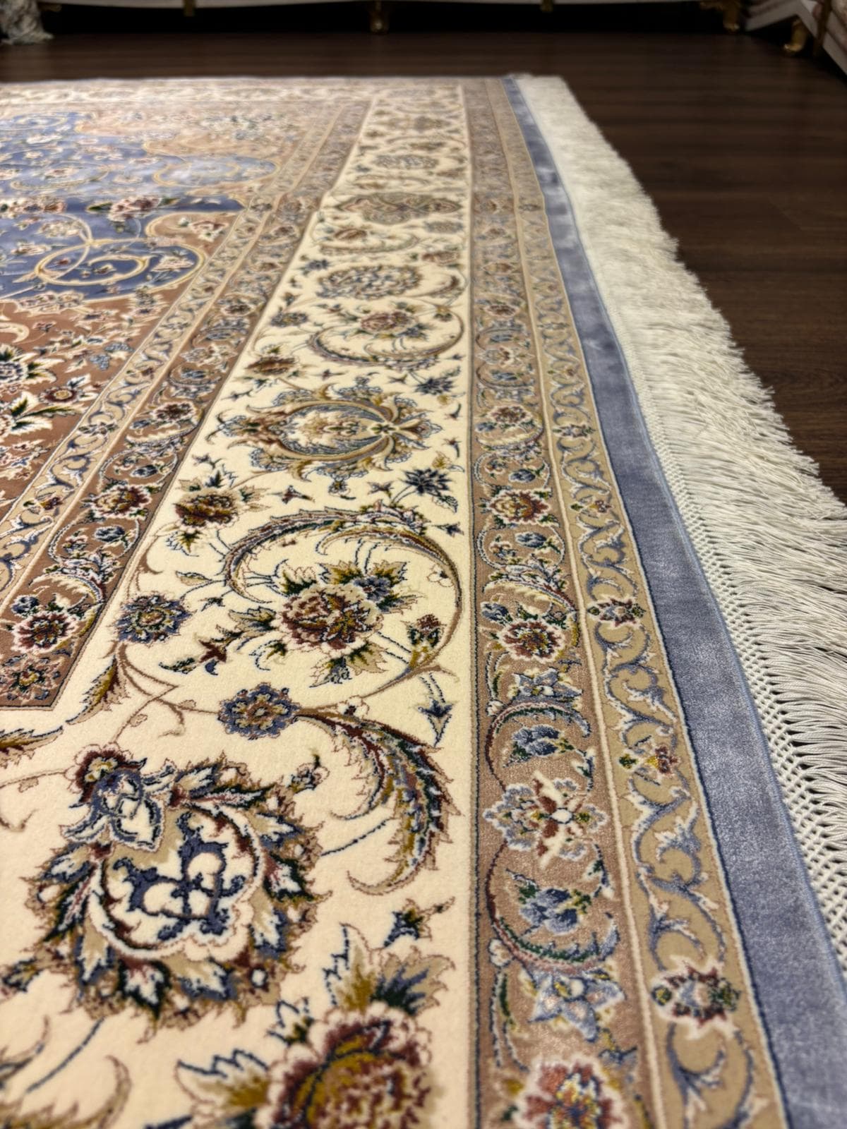 * Silk and wool blend * Handmade craftsmanship * Central medallion design * Detailed floral patterns * Soft texture with durable structure * Elegant blue and beige color palette * Fine high-density weaving